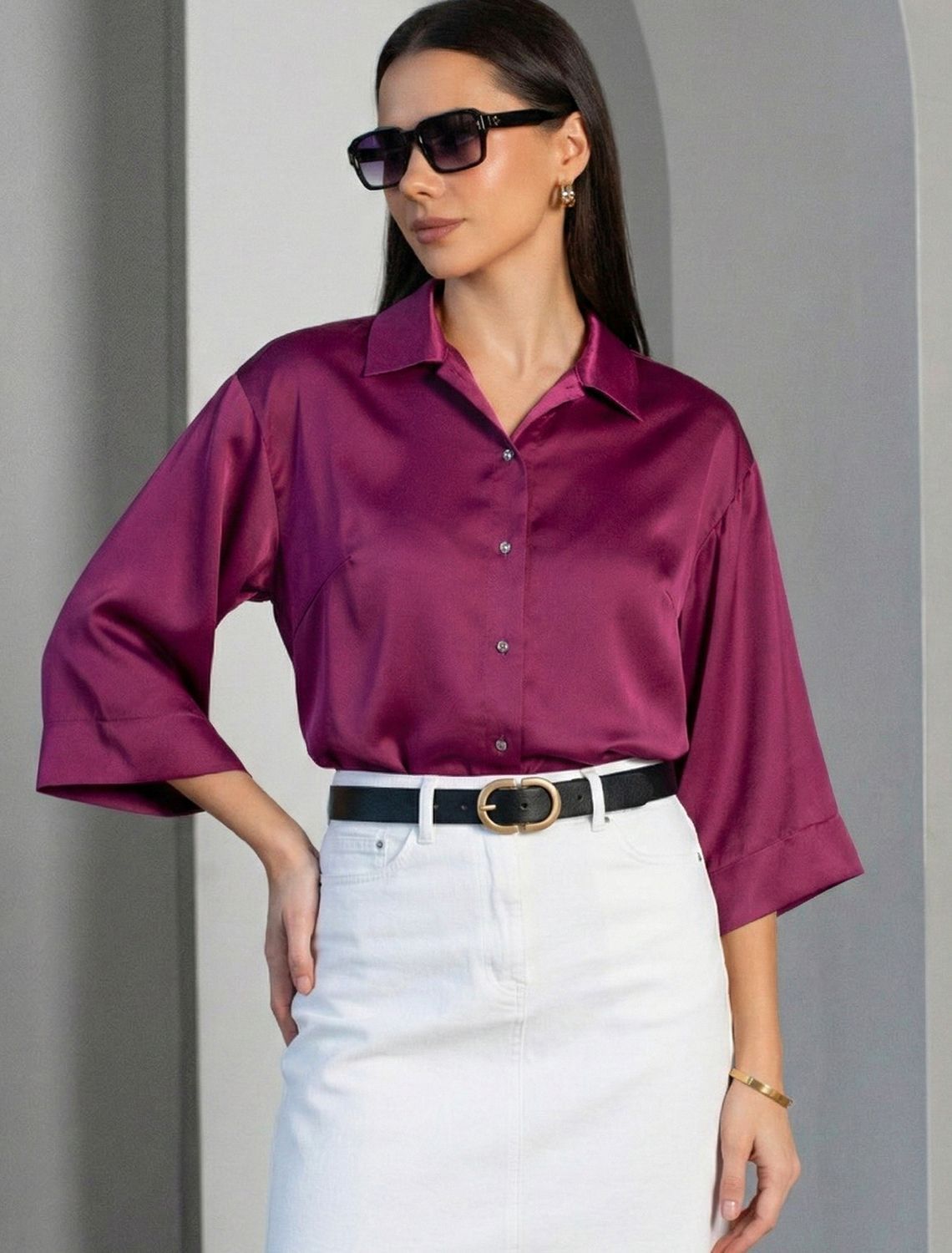 Элегантная блузка цвета бургунди на пуговицах выполнена из плотного струящегося сатина, который мягко ложится по фигуре и создает эффектную посадку. Отложной воротник придает образу женственную и изящную нотку. Материал отличается дышащей структурой, благодаря чему комфорт сохраняется даже в течение всего дня. Широкие рукава обеспечивают свободу движений и подходят для полных рук, делая блузку универсальной для разных типов фигур, в том числе для больших размеров. Красивая гладкая фактура материала подчеркивает утонченность изделия, добавляя легкое сияние к любому образу. Благодаря продуманному крою эта рубашка смотрится стильно как в повседневной жизни, так и на особых мероприятиях. Ткань практична, она приятна на ощупь, легко ухаживается и долго сохраняет первоначальный вид даже после многократных стирок и активной носки.