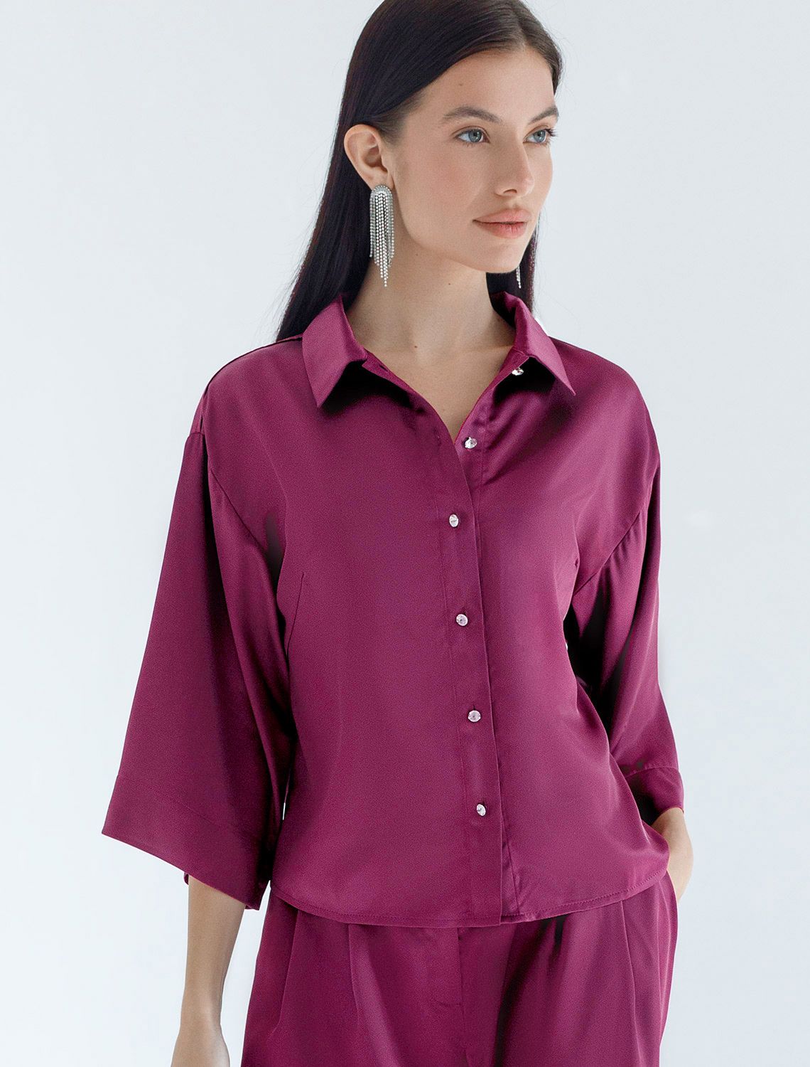 Элегантная блузка цвета бургунди на пуговицах выполнена из плотного струящегося сатина, который мягко ложится по фигуре и создает эффектную посадку. Отложной воротник придает образу женственную и изящную нотку. Материал отличается дышащей структурой, благодаря чему комфорт сохраняется даже в течение всего дня. Широкие рукава обеспечивают свободу движений и подходят для полных рук, делая блузку универсальной для разных типов фигур, в том числе для больших размеров. Красивая гладкая фактура материала подчеркивает утонченность изделия, добавляя легкое сияние к любому образу. Благодаря продуманному крою эта рубашка смотрится стильно как в повседневной жизни, так и на особых мероприятиях. Ткань практична, она приятна на ощупь, легко ухаживается и долго сохраняет первоначальный вид даже после многократных стирок и активной носки.