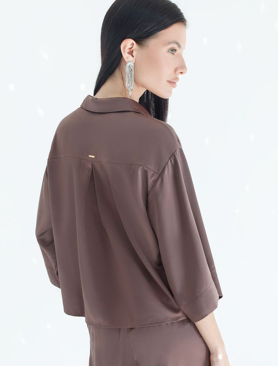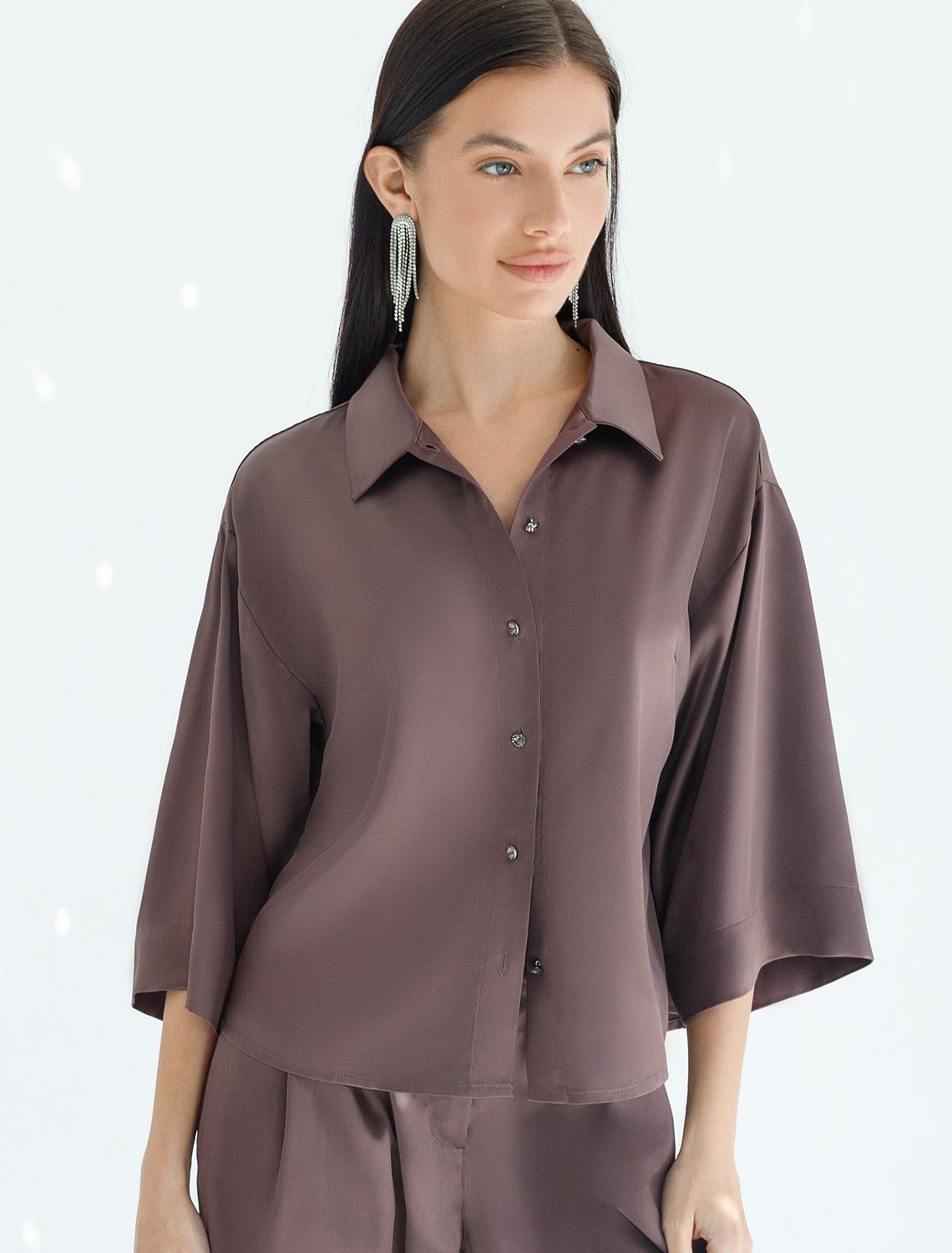 Элегантная блузка кофейного цвета на пуговицах выполнена из плотного струящегося сатина, который мягко ложится по фигуре и создает эффектную посадку. Отложной воротник придает образу женственную и изящную нотку. Материал отличается дышащей структурой, благодаря чему комфорт сохраняется даже в течение всего дня. Широкие рукава обеспечивают свободу движений и подходят для полных рук, делая блузку универсальной для разных типов фигур, в том числе для больших размеров. Красивая гладкая фактура материала подчеркивает утонченность изделия, добавляя легкое сияние к любому образу. Благодаря продуманному крою эта рубашка смотрится стильно как в повседневной жизни, так и на особых мероприятиях. Ткань практична, она приятна на ощупь, легко ухаживается и долго сохраняет первоначальный вид даже после многократных стирок и активной носки.
