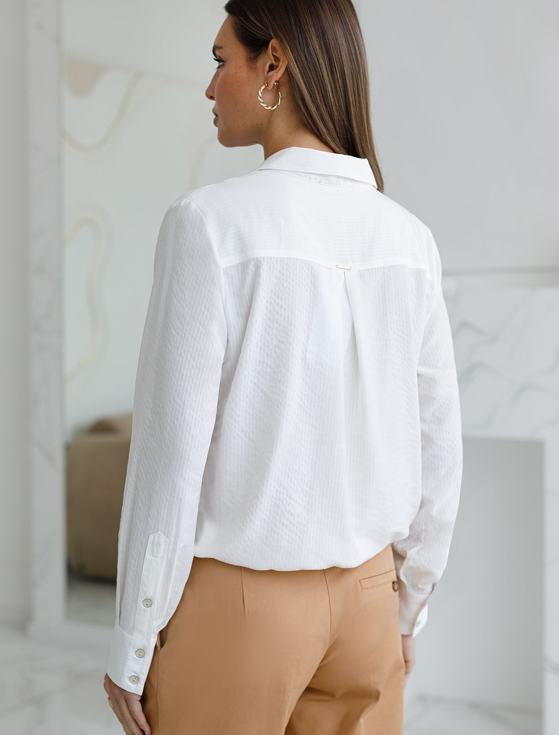 Легкая и комфортная блузка белого цвета из вискозы отлично садится по фигуре и дарит ощущение легкости в течение всего дня. Мягкая текстура материала не раздражает кожу, а вискоза гарантирует приятные тактильные ощущения. По низу предусмотрена кулиска, которая аккуратно фиксирует низ изделия, создавая стильный и современный силуэт. Такой элемент позволяет регулировать посадку, подчеркивая талию и добавляя эстетики в образ. Блузка украшена аккуратной вышивкой на кармане в виде логотипа бренда, что добавляет изысканности и демонстрирует ваше чувство вкуса. Рубашка выполнена с тщательным подходом к деталям, что делает ее универсальной для разных стилей — от повседневных до офисных. Такая блузка станет отличным выбором для тех, кто ценит комфорт и качество, не отказываясь от современной моды. белый