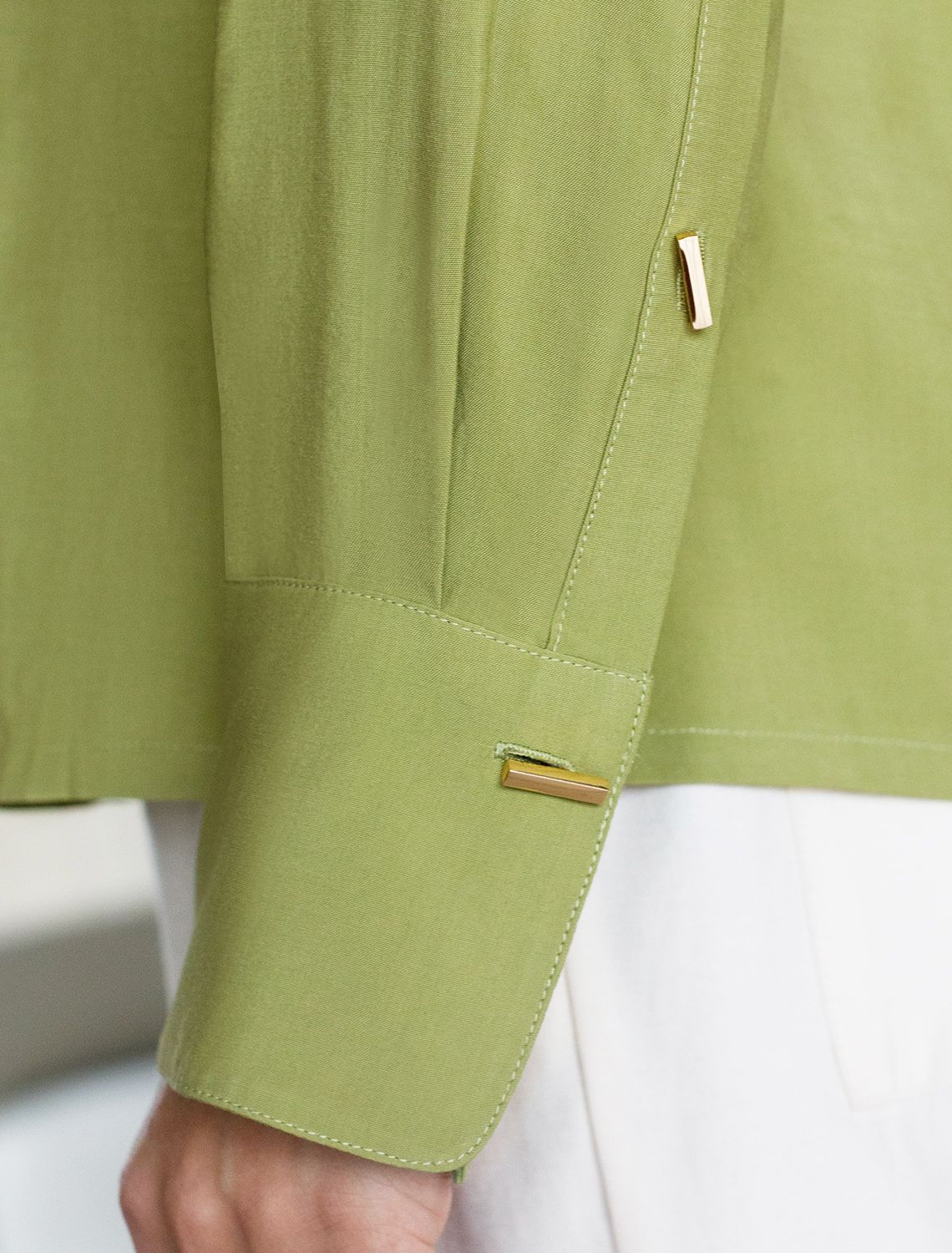 Блузка светло-оливкового цвета сочетает в себе комфорт и элегантность благодаря материалу из вискозы с лиоцеллом. Аккуратный отложной воротник подчеркивает утонченность образа, а продолговатые металлические пуговицы золотистого цвета добавляют выразительный акцент и придают блузке благородный вид. Широкие манжеты на рукавах привлекают внимание и делают силуэт современным. Спущенная линия плеча формирует расслабленный, но стильный внешний вид, что идеально для тех, кто ценит индивидуальность и уверенность в деталях. Крой продуман так, чтобы подчеркивать достоинства фигуры и на больших размерах, создавая гармоничный силуэт без лишних усилий. Ткань из вискозы с добавлением лиоцелла обеспечивает приятные ощущения и отличную посадку, струится на теле и охлаждает в жаркую погоду. Рубашка легко впишется как в деловой гардероб, так и в повседневный стиль, позволяя выглядеть безупречно независимо от ситуации. светло-оливковый