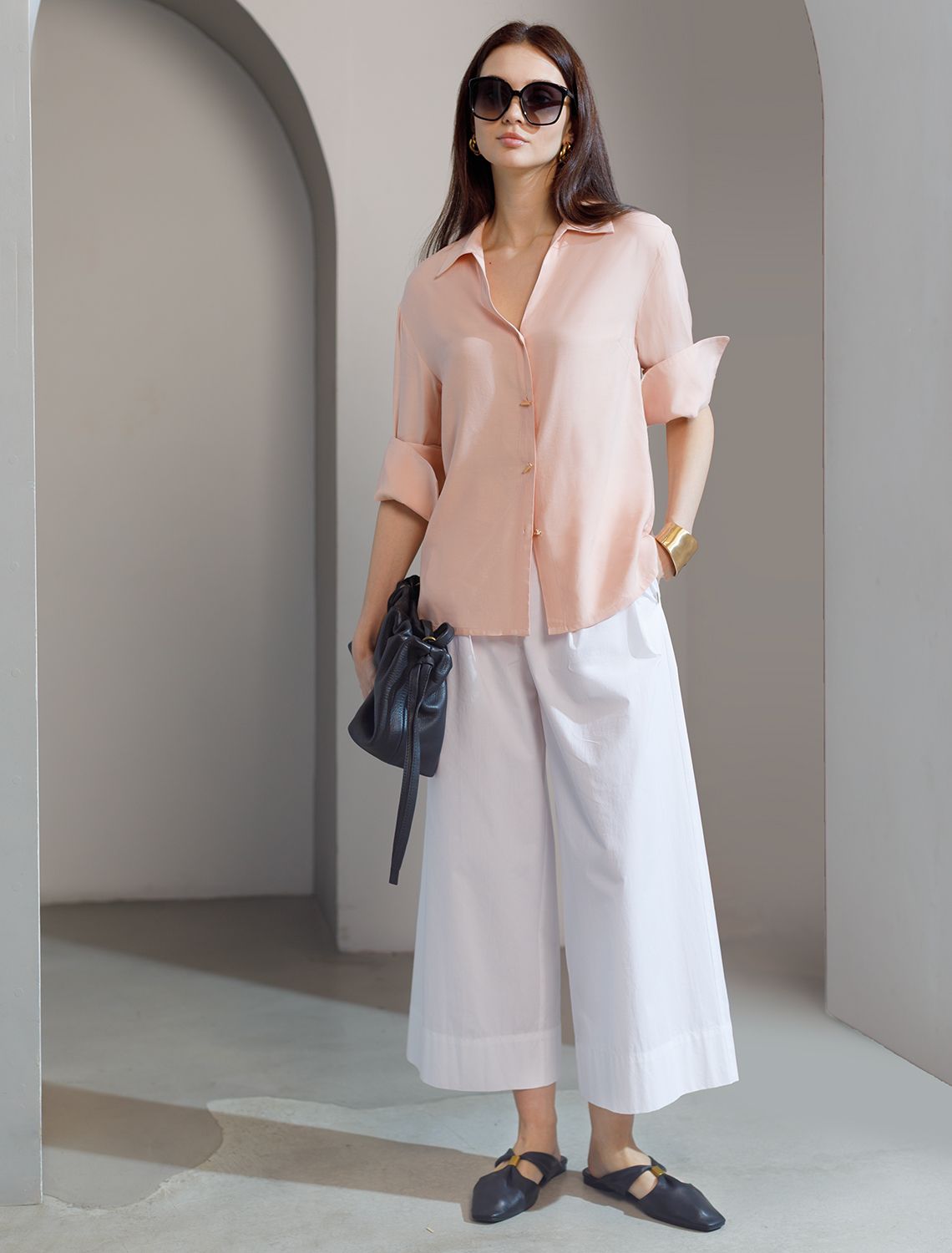 Блузка пудрового цвета сочетает в себе комфорт и элегантность благодаря материалу из вискозы с лиоцеллом. Аккуратный отложной воротник подчеркивает утонченность образа, а продолговатые металлические пуговицы золотистого цвета добавляют выразительный акцент и придают блузке благородный вид. Широкие манжеты на рукавах привлекают внимание и делают силуэт современным. Спущенная линия плеча формирует расслабленный, но стильный внешний вид, что идеально для тех, кто ценит индивидуальность и уверенность в деталях. Крой продуман так, чтобы подчеркивать достоинства фигуры и на больших размерах, создавая гармоничный силуэт без лишних усилий. Ткань из вискозы с добавлением лиоцелла обеспечивает приятные ощущения и отличную посадку, струится на теле и охлаждает в жаркую погоду. Рубашка легко впишется как в деловой гардероб, так и в повседневный стиль, позволяя выглядеть безупречно независимо от ситуации. пудровый