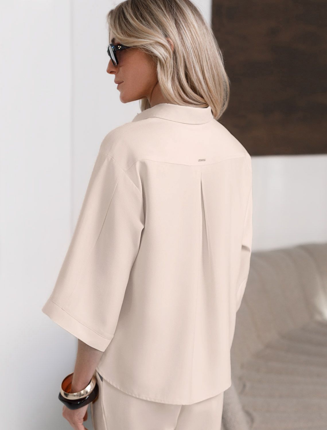 Стильная блузка кокосово-молочного цвета выполнена из плотного лиоцелла. Лиоцелл это более дорогой и экологичный вариант вискозы, очень прочный и шелковистый. Модель дополнена широкими рукавами длиной 3/4, создающими модный акцент. Классический отложной воротник придает блузке официальность и идеально подходит для ношения, где требуется офисный дресс-код. А лаконичные лампасы вдоль рукавов в тон основного цвета подчеркивают трендовый характер блузки. Это ненавязчивый, но заметный акцент, который выделяет модель среди стандартных классических блузок. Свободный крой не сковывает движений и отлично садится по фигуре даже на большие размеры, скрывая возможные недостатки. Эта легкая рубашка с застежкой на пуговицы идеальный выбор для комфорта и стиля в теплое время года, она идеально подойдет для любого повода.