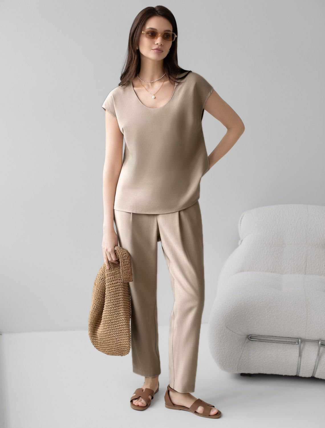 Элегантная блузка светло-бежевого цвета скроенная по косой выполнена из плотного лиоцелла. Лиоцелл это более дорогой и экологичный вариант вискозы, очень прочный и шелковистый. Эта повседневная блузка с трендовым U-вырезом создана для легкого и утонченного стиля. Мягкие линии кроя создают невероятно эффектный образ, который подчеркивает естественную красоту, не стесняя движений, а свободный фасон дарит ощущение абсолютного комфорта и уверенности. Блузка красиво драпируется при движении, создавая летящий, воздушный эффект. Эта легкая блуза с коротким рукавом идеальный выбор для комфорта и стиля в теплое время года, она будет идеальна для любого повода. светло-бежевый