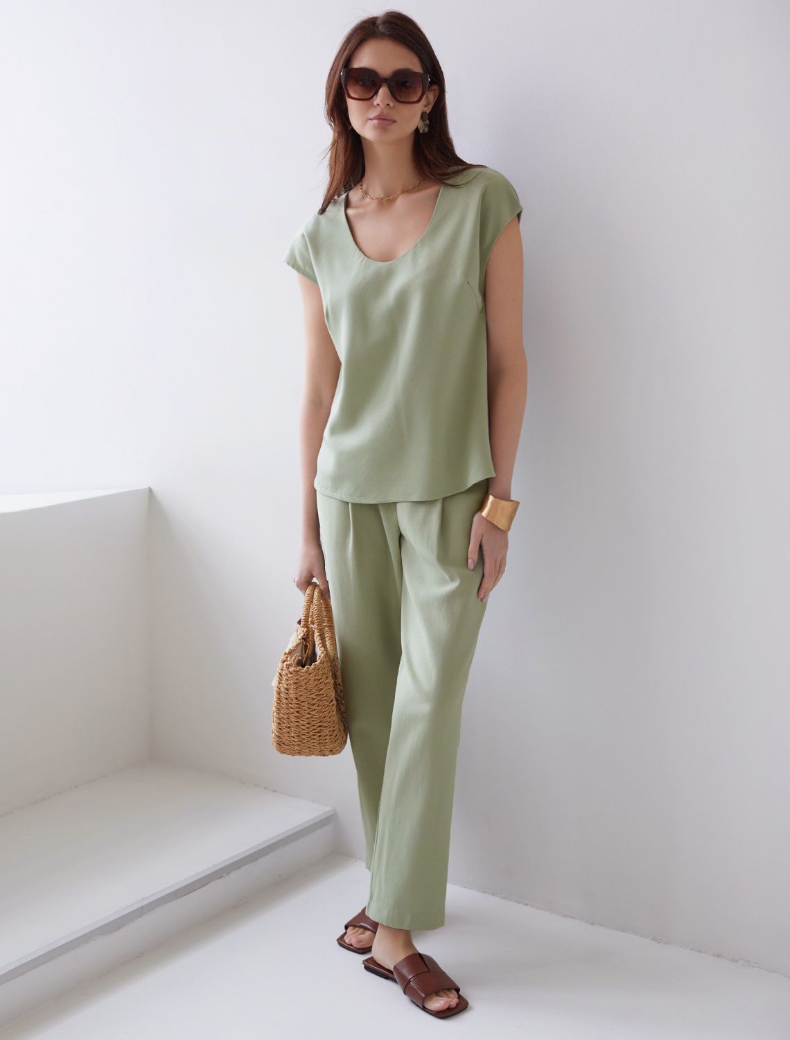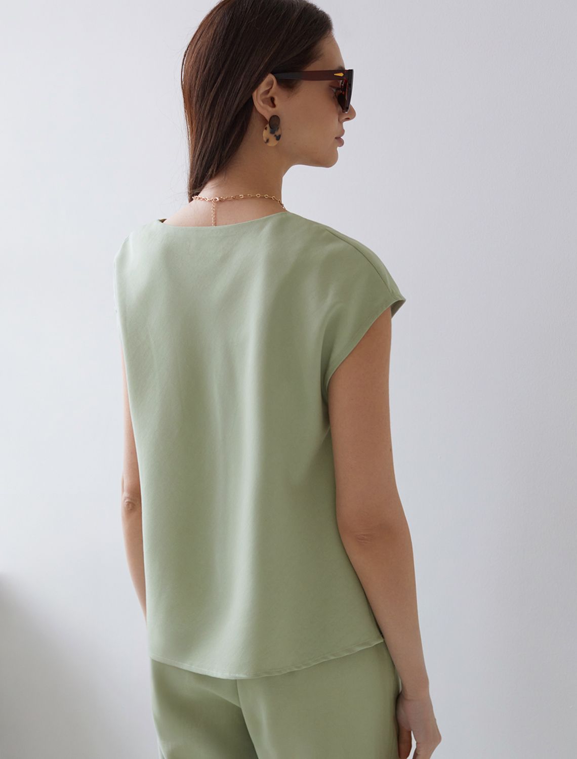 Элегантная блузка светло-зеленого цвета скроенная по косой выполнена из плотного лиоцелла. Лиоцелл это более дорогой и экологичный вариант вискозы, очень прочный и шелковистый. Эта повседневная блузка с трендовым U-вырезом создана для легкого и утонченного стиля. Мягкие линии кроя создают невероятно эффектный образ, который подчеркивает естественную красоту, не стесняя движений, а свободный фасон дарит ощущение абсолютного комфорта и уверенности. Блузка красиво драпируется при движении, создавая летящий, воздушный эффект. Эта легкая блуза с коротким рукавом идеальный выбор для комфорта и стиля в теплое время года, она будет идеальна для любого повода.