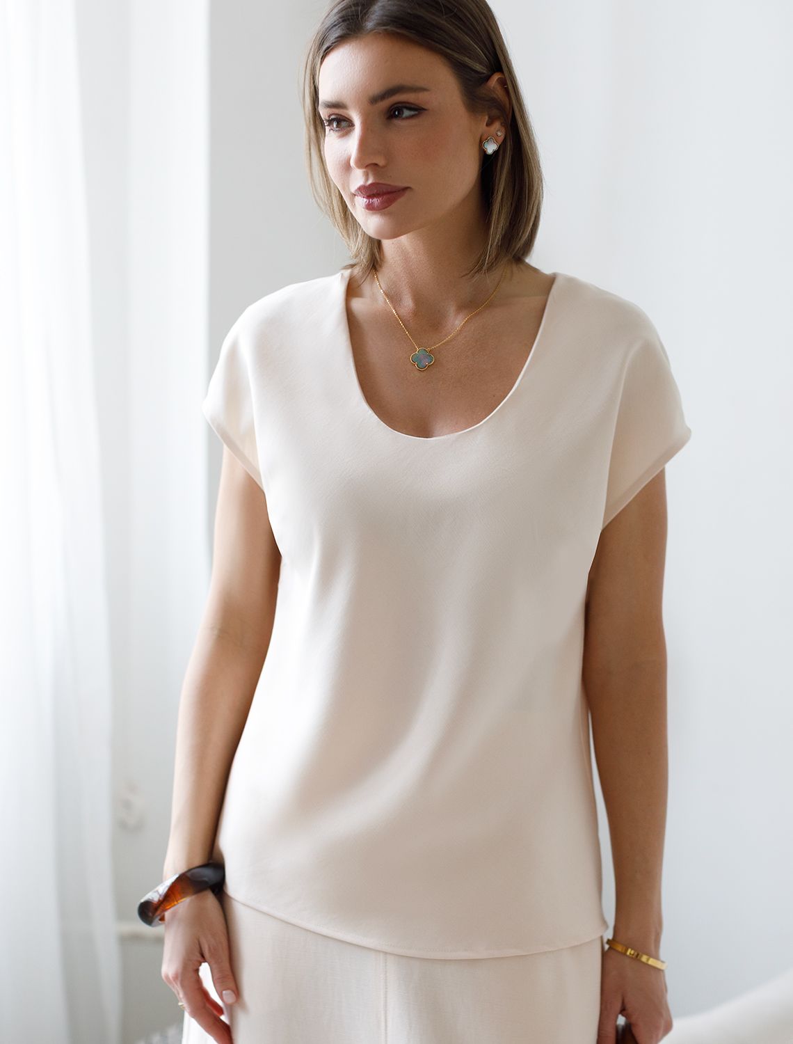 Элегантная блузка кокосово-молочного цвета скроенная по косой выполнена из плотного лиоцелла. Лиоцелл это более дорогой и экологичный вариант вискозы, очень прочный и шелковистый. Эта повседневная блузка с трендовым U-вырезом создана для легкого и утонченного стиля. Мягкие линии кроя создают невероятно эффектный образ, который подчеркивает естественную красоту, не стесняя движений, а свободный фасон дарит ощущение абсолютного комфорта и уверенности. Блузка красиво драпируется при движении, создавая летящий, воздушный эффект. Эта легкая блуза с коротким рукавом идеальный выбор для комфорта и стиля в теплое время года, она будет идеальна для любого повода.