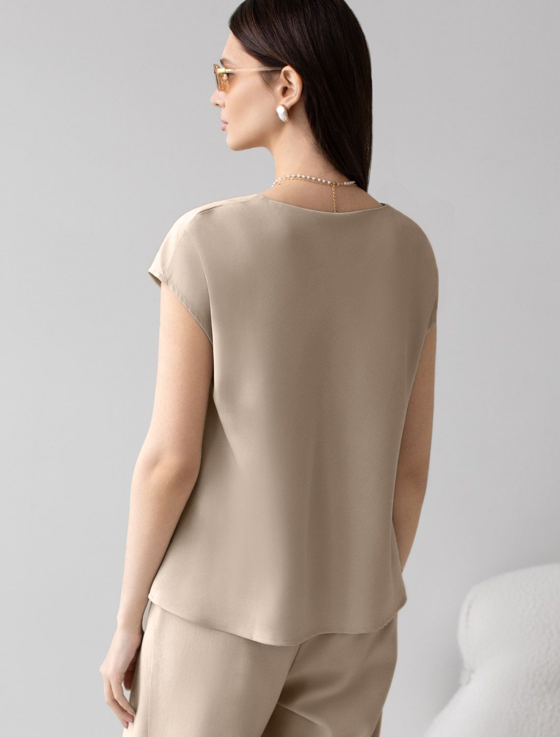 Элегантная блузка светло-бежевого цвета скроенная по косой выполнена из плотного лиоцелла. Лиоцелл это более дорогой и экологичный вариант вискозы, очень прочный и шелковистый. Эта повседневная блузка с трендовым U-вырезом создана для легкого и утонченного стиля. Мягкие линии кроя создают невероятно эффектный образ, который подчеркивает естественную красоту, не стесняя движений, а свободный фасон дарит ощущение абсолютного комфорта и уверенности. Блузка красиво драпируется при движении, создавая летящий, воздушный эффект. Эта легкая блуза с коротким рукавом идеальный выбор для комфорта и стиля в теплое время года, она будет идеальна для любого повода.
