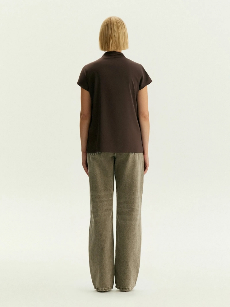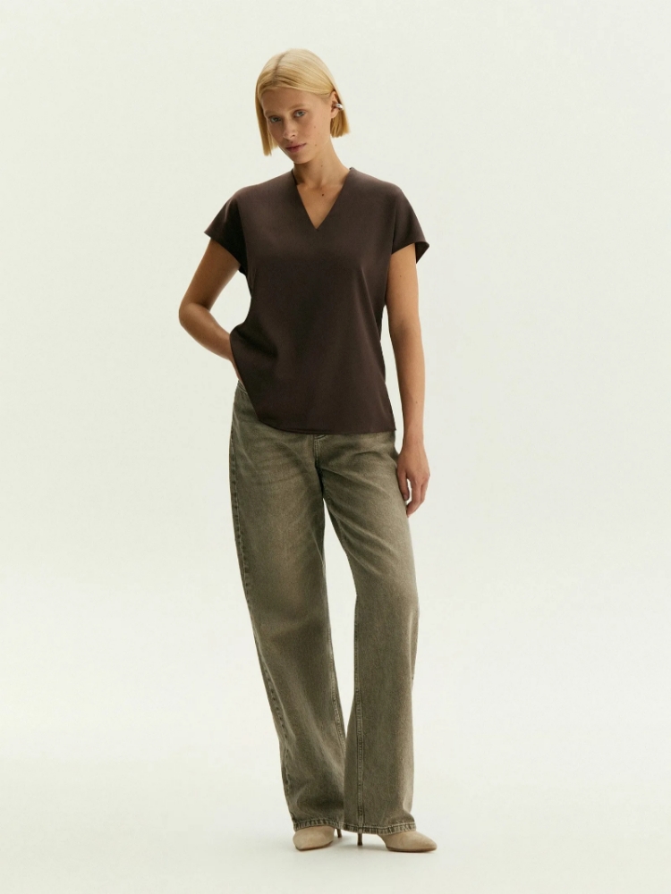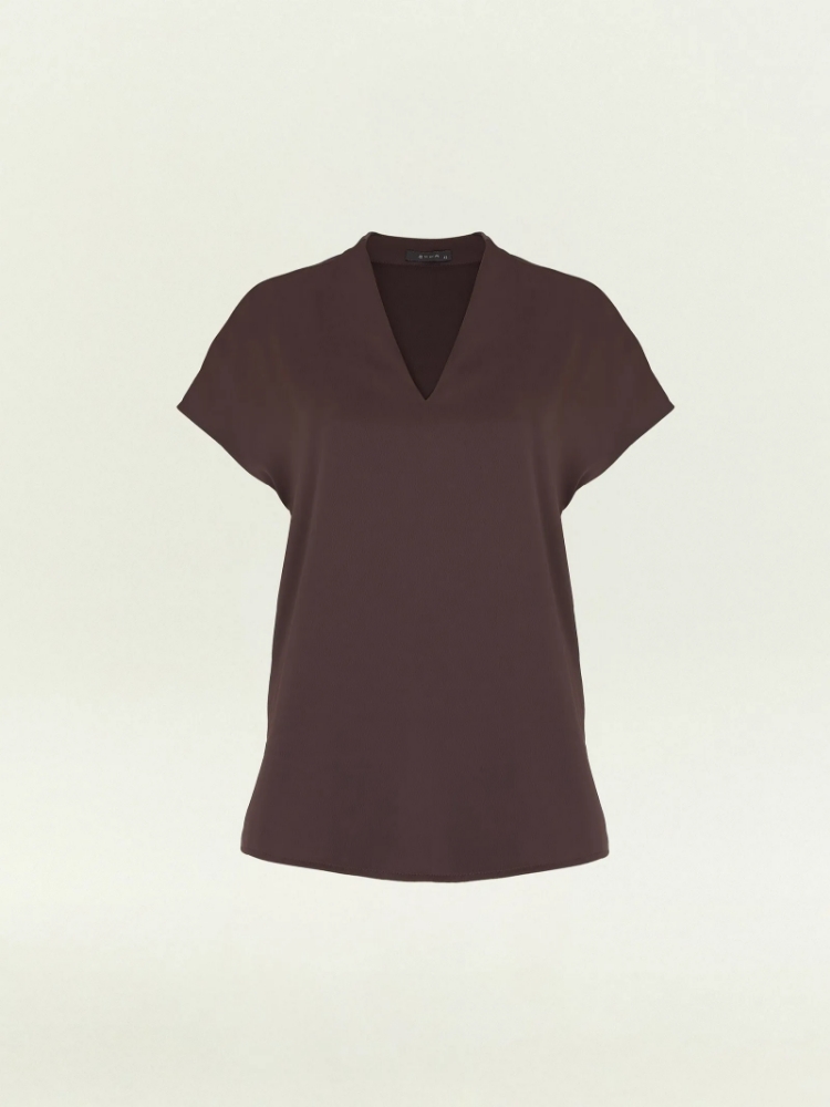 Базовая блузка в цвете горького шоколада. Выполнена из материала с содержанием вискозы, без подкладки. Модель прямого кроя с коротким рукавом отличает элегантная стойка, переходящая в небольшой и изящный V-образный вырез. Внизу по бокам изделия располагаются аккуратные разрезы. Длина позволяет носить блузку как навыпуск, так и заправленной