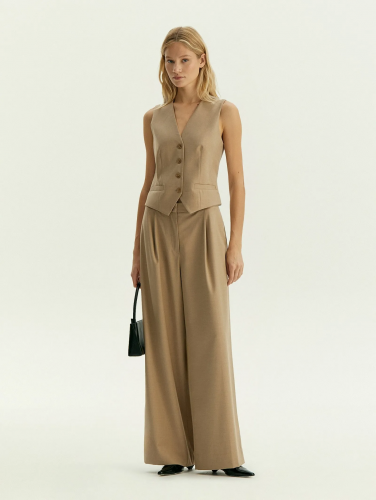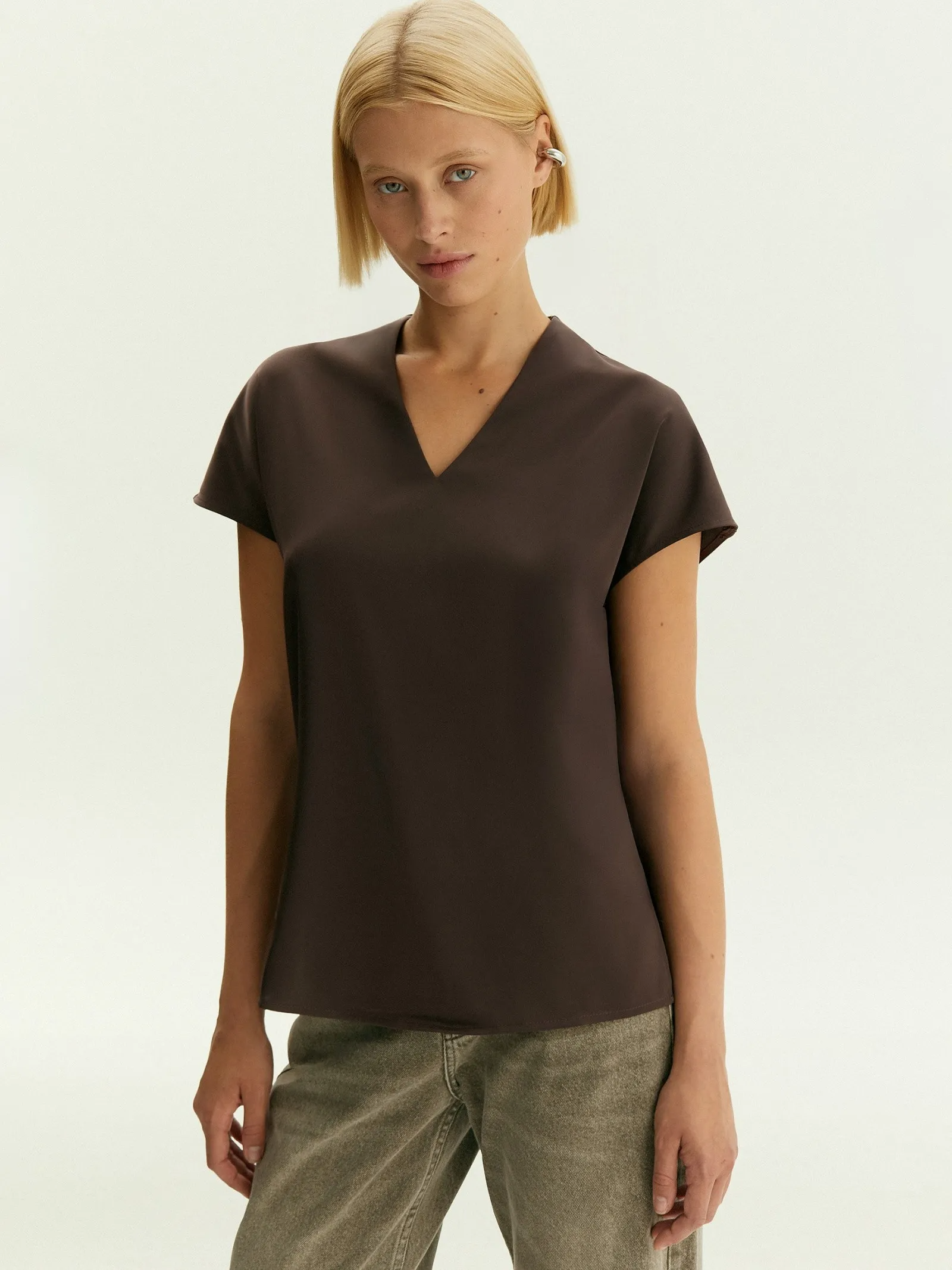 Базовая блузка в цвете горького шоколада. Выполнена из материала с содержанием вискозы, без подкладки. Модель прямого кроя с коротким рукавом отличает элегантная стойка, переходящая в небольшой и изящный V-образный вырез. Внизу по бокам изделия располагаются аккуратные разрезы. Длина позволяет носить блузку как навыпуск, так и заправленной.
