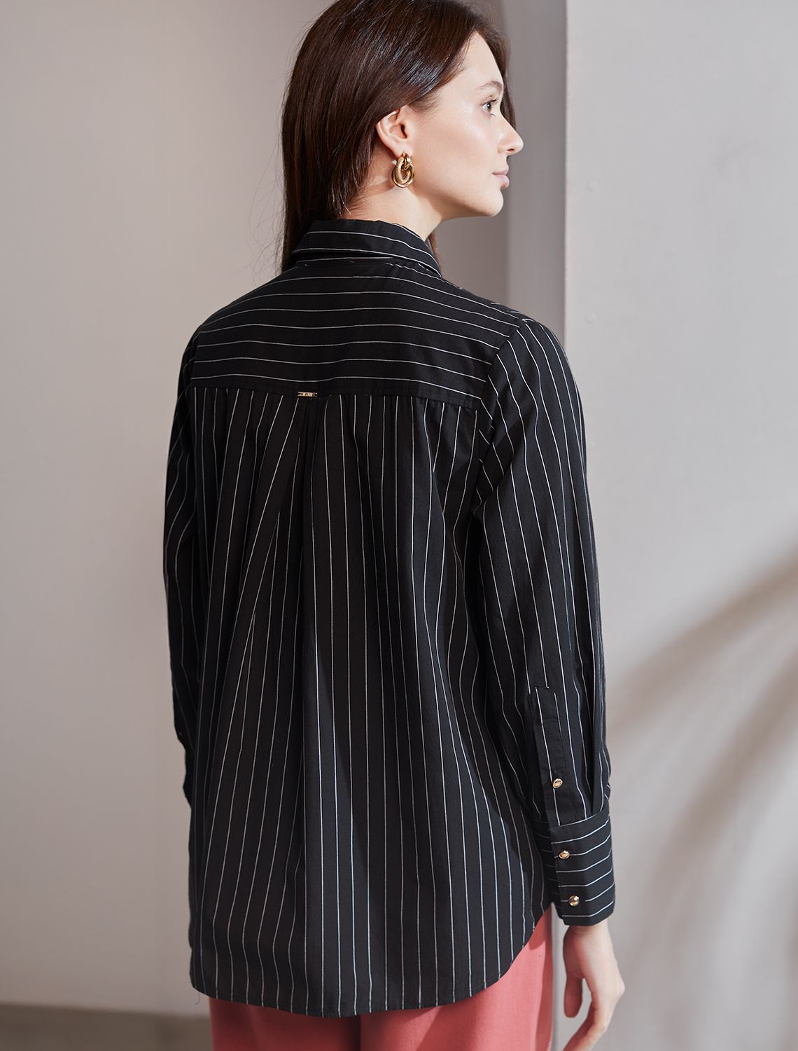 Блузка свободного силуэта выполнена из 100% хлопка. Модель черного цвета в тонкую белую полоску дополнена золотистыми рельефными пуговицами. Свободный силуэт подходит для любой фигуры. Для идеального роскошного образа используйте в качестве низа брюки светлых тонов. На спинке изделия фирменный металлический логотип бренда. черный-белый