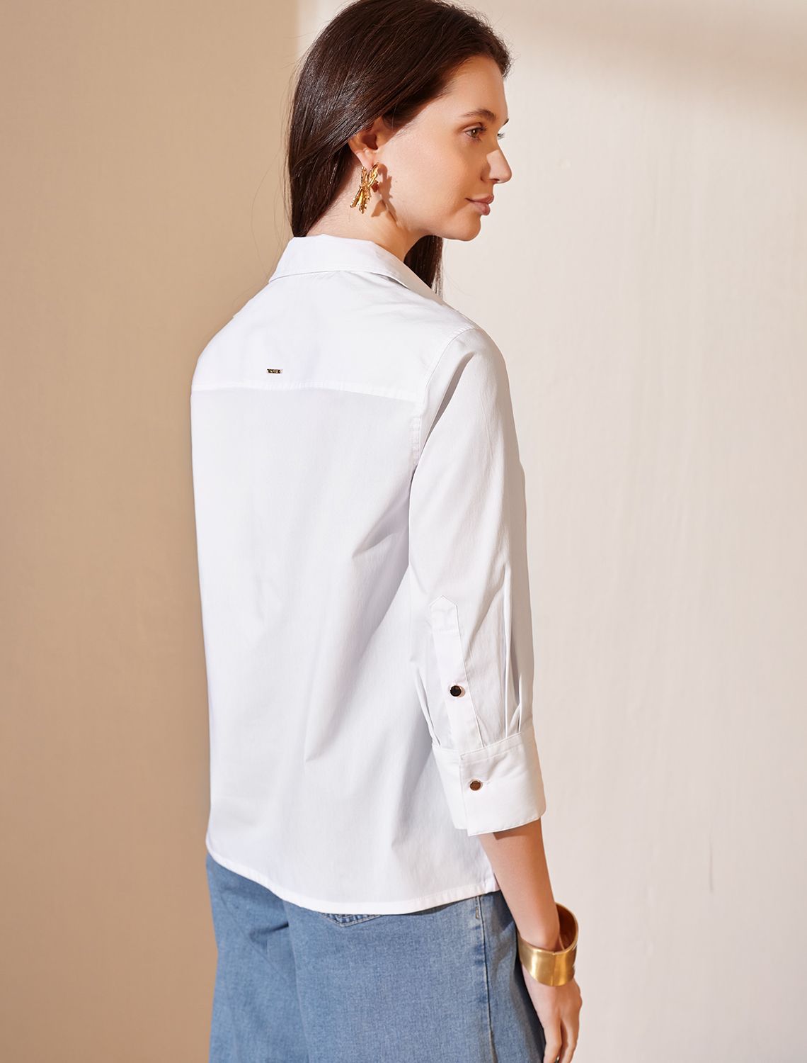 Стильная блузка белого цвета создаст эффектный образ на весну и лето. Свободный крой с рукавом 3/4 создает эффект легкой непринужденности и комфорта, а манжеты на рукавах добавляют аккуратности и завершенности образу. Отложной воротник придает блузке классическую нотку, которая гармонично сочетается в деловом образе. Эластичный хлопок гарантирует отличную посадку, подчеркивая достоинства и скрывая недостатки, при этом сохраняет свежесть на протяжении всего дня. Такая рубашка станет великолепным выбором для тех, кто ценит удобство и стиль одновременно. Повседневная блузка удачно сочетается с различными предметами гардероба, позволяя создавать стильные и практичные образы в любую погоду.
