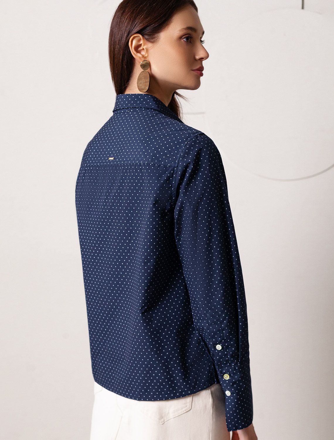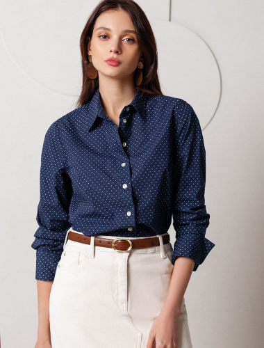 Блузка свободного силуэта темно-синего цвета из хлопка идеально подходит для теплого сезона и порадует всех, кто ценит комфорт и стиль. Натуральный материал плотностью 109 Г/м2 обеспечивает приятное ощущение на теле и хорошо пропускает воздух, что особенно важно летом и весной. Блузка с длинным рукавом обладает высокой износостойкостью, что позволяет сохранять привлекательный внешний вид даже при регулярном использовании. Ткань хорошо держит форму после стирки и надолго остается аккуратной. Эластан в составе обеспечивает отличную посадку на любую фигуру. Классическая рубашка с отложным воротником и широкими манжетами формирует актуальный образ, подходящий как для работы, так и для повседневных прогулок. Пуговицы на планке добавляют практичности и позволяют регулировать степень открытости, что также способствует созданию различных вариантов ношения, например, в качестве второго слоя. Прямой свободный крой рубашки не сковывает движения и создает ощущение легкости, а принт в мелкий горошек делает образ выраженным, современным и подчеркивает индивидуальность. Повседневная блузка гармонично сочетается с любыми низами, что делает ее универсальной частью гардероба. темно-синий