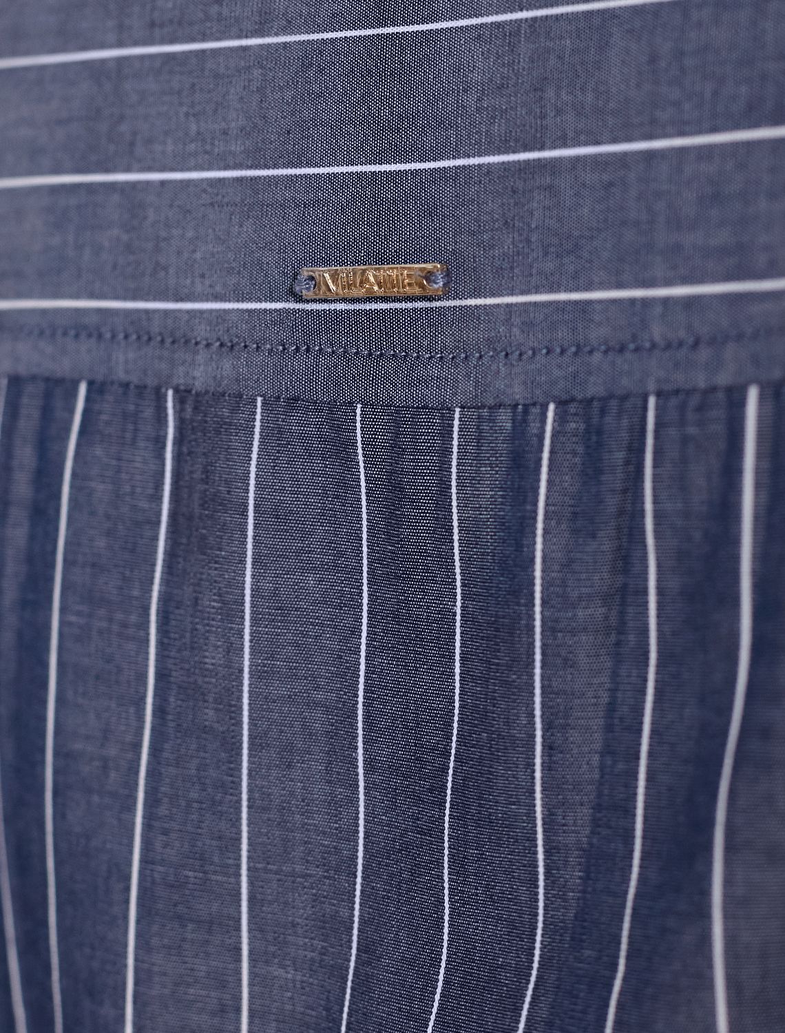 Блузка свободного силуэта серого цвета в синюю полоску из 100 % хлопка идеально подходит для теплого сезона и порадует всех, кто ценит комфорт и стиль. Натуральный материал плотностью 106 Г/м2 обеспечивает приятное ощущение на теле и хорошо пропускает воздух, что особенно важно летом и весной. Блузка с длинным рукавом обладает высокой износостойкостью, что позволяет сохранять привлекательный внешний вид даже при регулярном использовании. Ткань хорошо держит форму после стирки и надолго остается аккуратной. Классическая рубашка с отложным воротником и широкими манжетами формирует актуальный образ, подходящий как для работы, так и для повседневных прогулок. Пуговицы на планке добавляют практичности и позволяют регулировать степень открытости, что также способствует созданию различных вариантов ношения, например, в качестве второго слоя. Прямой свободный крой рубашки не сковывает движения и создает ощущение легкости, а принт в полоску делает образ выраженным, современным и подчеркивает индивидуальность. Повседневная блузка гармонично сочетается с любыми низами, что делает ее универсальной частью гардероба. серо-синий