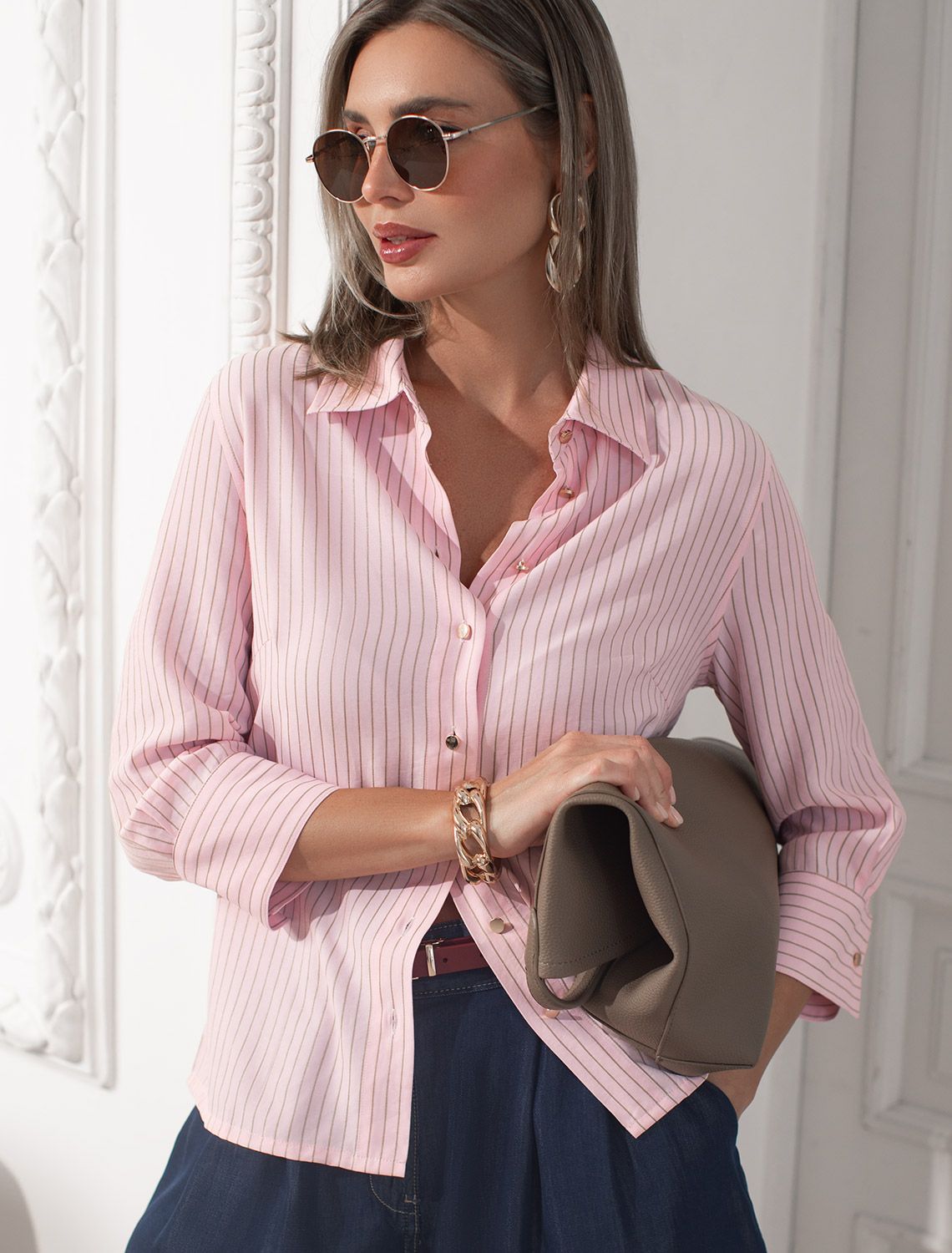 Стильная блузка пудрового цвета в бежевую полоску создаст эффектный образ на весну и лето. Свободный крой с рукавом 3/4 создает эффект легкой непринужденности и комфорта, а манжеты на рукавах добавляют аккуратности и завершенности образу. Отложной воротник придает блузке классическую нотку, которая гармонично сочетается в деловом образе. Эластичный хлопок гарантирует отличную посадку, подчеркивая достоинства и скрывая недостатки, при этом сохраняет свежесть на протяжении всего дня. Такая рубашка станет великолепным выбором для тех, кто ценит удобство и стиль одновременно. Повседневная блузка удачно сочетается с различными предметами гардероба, позволяя создавать стильные и практичные образы в любую погоду.