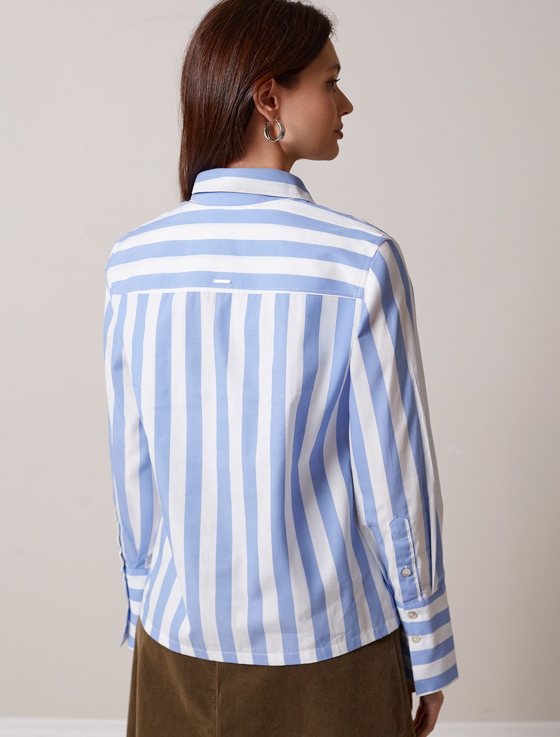 Блузка свободного силуэта белого цвета в широкую голубую полоску из 100 % хлопка идеально подходит для теплого сезона и порадует всех, кто ценит комфорт и стиль. Натуральный материал плотностью 102 Г/м2 обеспечивает приятное ощущение на теле и хорошо пропускает воздух, что особенно важно летом и весной. Блузка с длинным рукавом обладает высокой износостойкостью, что позволяет сохранять привлекательный внешний вид даже при регулярном использовании. Ткань хорошо держит форму после стирки и надолго остается аккуратной. Классическая рубашка с отложным воротником и широкими манжетами формирует актуальный образ, подходящий как для работы, так и для повседневных прогулок. Пуговицы на планке добавляют практичности и позволяют регулировать степень открытости, что также способствует созданию различных вариантов ношения, например, в качестве второго слоя. Прямой свободный крой рубашки не сковывает движения и создает ощущение легкости, а широкие полоски базовой расцветки делают образ выраженным и современным. Повседневная блузка гармонично сочетается с любыми низами, что делает ее универсальной частью гардероба, освежает внешний вид и подчеркивает индивидуальность благодаря выразительному принту в полоску. белый-голубой