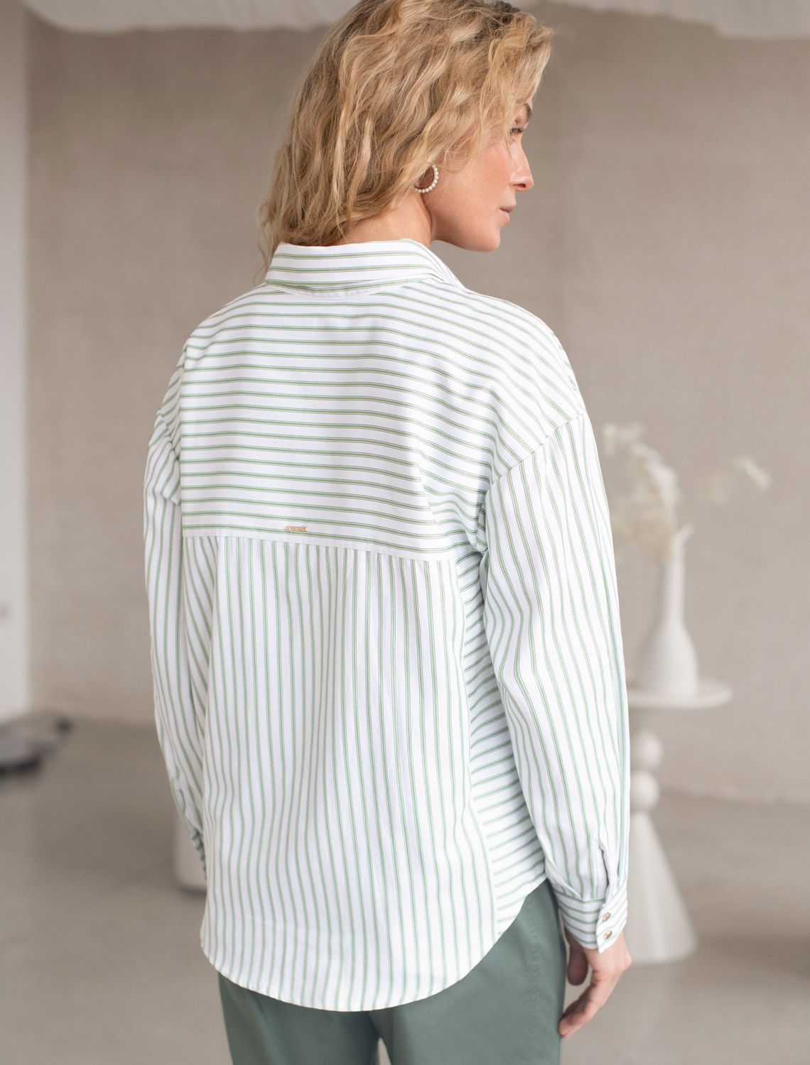 Блузка белого цвета в фисташковую полоску свободного силуэта отлично подходит для повседневной носки и создания стильных образов. Уникальность этой блузки в использовании техники поперечного кроя, когда некоторые детали, такие как боковые части переда, кокетка спинки и манжеты, скроены поперек. В полосатой ткани это смотрится максимально эффектно и добавляет нотки стиля кэжуал в классический образ. Такой вид полосатой ткани называется пестротканой — полосы созданы переплетением нитей разных цветов. Смешанный состав ткани идеален для деловых блузок: хлопок приятен к телу, полиэстер повышает долговечность. Свободный крой блузки и спущенная линия плеча позволяют вписать эту вещь в любой гардероб, независимо от выбранного стиля — будь то офисная атмосфера или расслабленный выход на прогулку. Отложной воротник аккуратно подчеркивает утонченную линию шеи и придает образу завершенность. Застежка на пуговицы обеспечивает комфортную регулировку и удобство в использовании. Универсальная рубашка хорошо смотрится на любые размеры, в том числе и большие, скрывает возможные недостатки и выгодно подчеркивает достоинства фигуры, подходит для работы даже в жаркое время года. белый-фисташковый