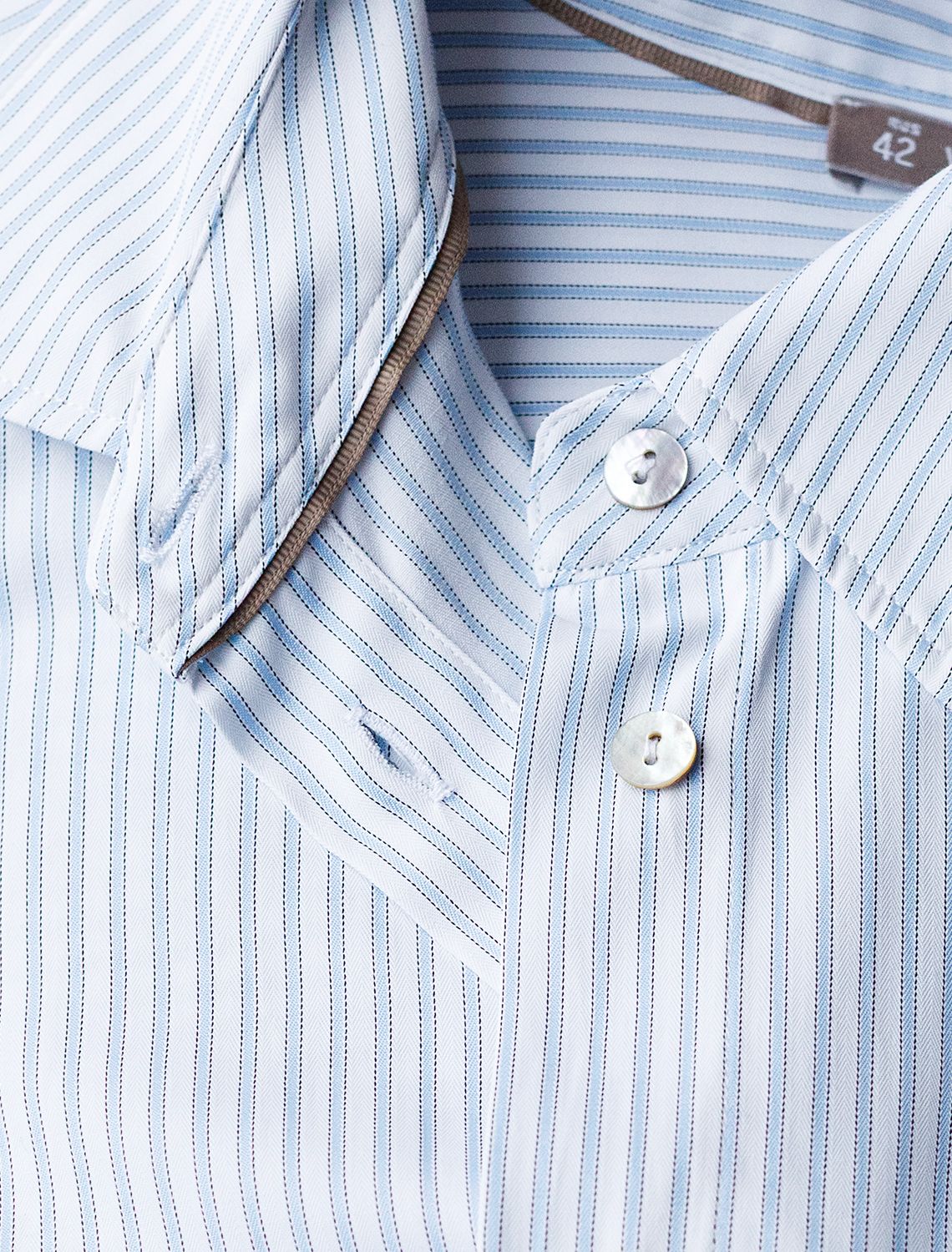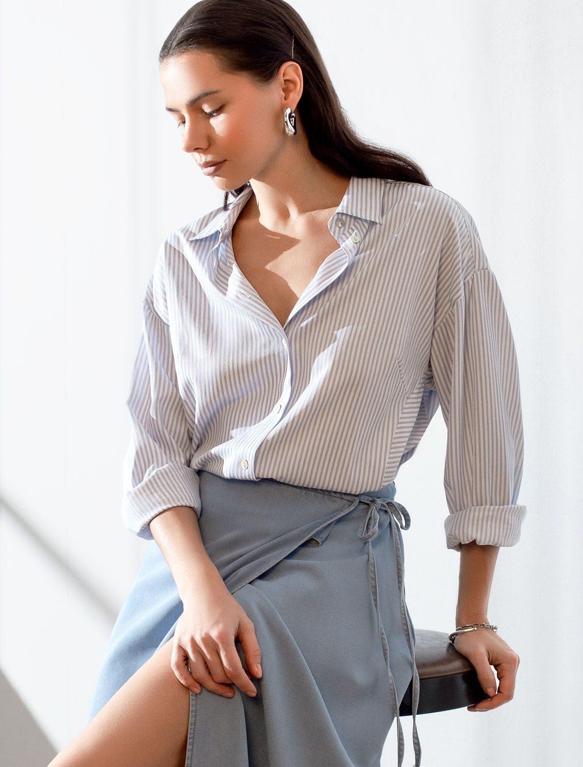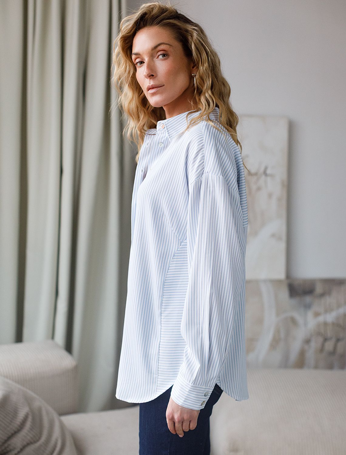 Блузка белого цвета в голубую полоску свободного силуэта отлично подходит для повседневной носки и создания стильных образов. Уникальность этой блузки в использовании техники поперечного кроя, когда некоторые детали, такие как боковые части переда, кокетка спинки и манжеты, скроены поперек. В полосатой ткани это смотрится максимально эффектно и добавляет нотки стиля кэжуал в классический образ. Такой вид полосатой ткани называется пестротканой — полосы созданы переплетением нитей разных цветов. Смешанный состав ткани идеален для деловых блузок: хлопок приятен к телу, полиэстер повышает долговечность. Свободный крой блузки и спущенная линия плеча позволяют вписать эту вещь в любой гардероб, независимо от выбранного стиля — будь то офисная атмосфера или расслабленный выход на прогулку. Отложной воротник аккуратно подчеркивает утонченную линию шеи и придает образу завершенность. Застежка на пуговицы обеспечивает комфортную регулировку и удобство в использовании. Универсальная рубашка хорошо смотрится на любые размеры, в том числе и большие, скрывает возможные недостатки и выгодно подчеркивает достоинства фигуры, подходит для работы даже в жаркое время года. белый-голубой