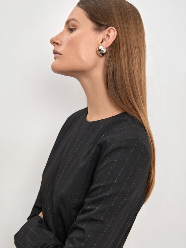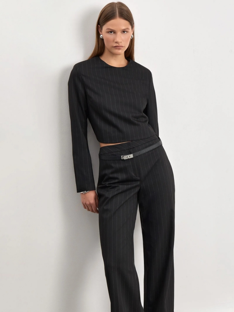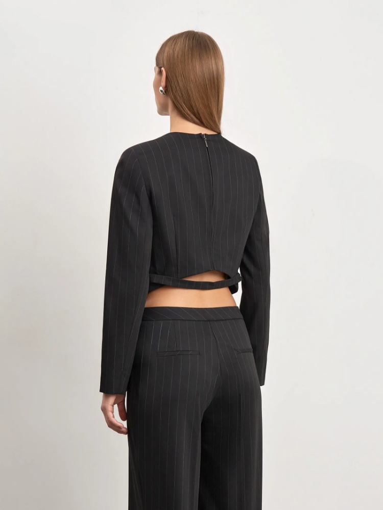 Блуза из чёрной костюмной ткани в полоску сочетает в себе элементы офискора и дерзкую игру с длиной. Трендовая модель отличается укороченной спинкой и перемычкой сзади. Хорошо сочетается с джинсами и брюками высокой или средней посадки, в том числе брюками из комплекта. Блуза выполнена на подкладке с вискозой. Застёгивается на кнопки. Образ с блузой можно дополнить брюками из комплекта