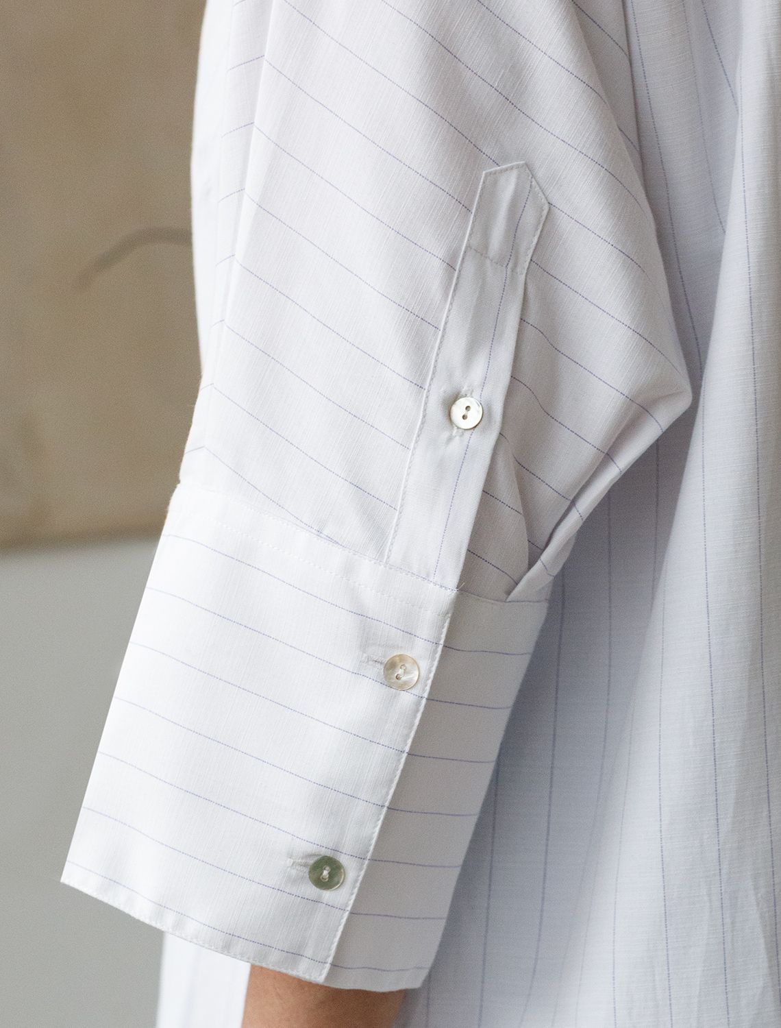 Стильная блузка белого цвета в лавандовую полоску идеально держит форму и подчеркивает любую фигуру. Свободный крой с цельнокроеным рукавом 3/4 создает эффект легкой непринужденности и комфорта, а манжеты на рукавах добавляют аккуратности и завершенности образу. Отложной воротник придает блузке классическую нотку, которая гармонично сочетается в деловом образе. Хлопок с добавлением льна гарантирует отличную посадку, подчеркивая достоинства и скрывая недостатки, при этом сохраняет свежесть на протяжении всего дня. Такая рубашка станет великолепным выбором для тех, кто ценит удобство и стиль одновременно. Модель удачно сочетается с различными предметами гардероба, позволяя создавать стильные и практичные образы в любую погоду. белый-лавандовый