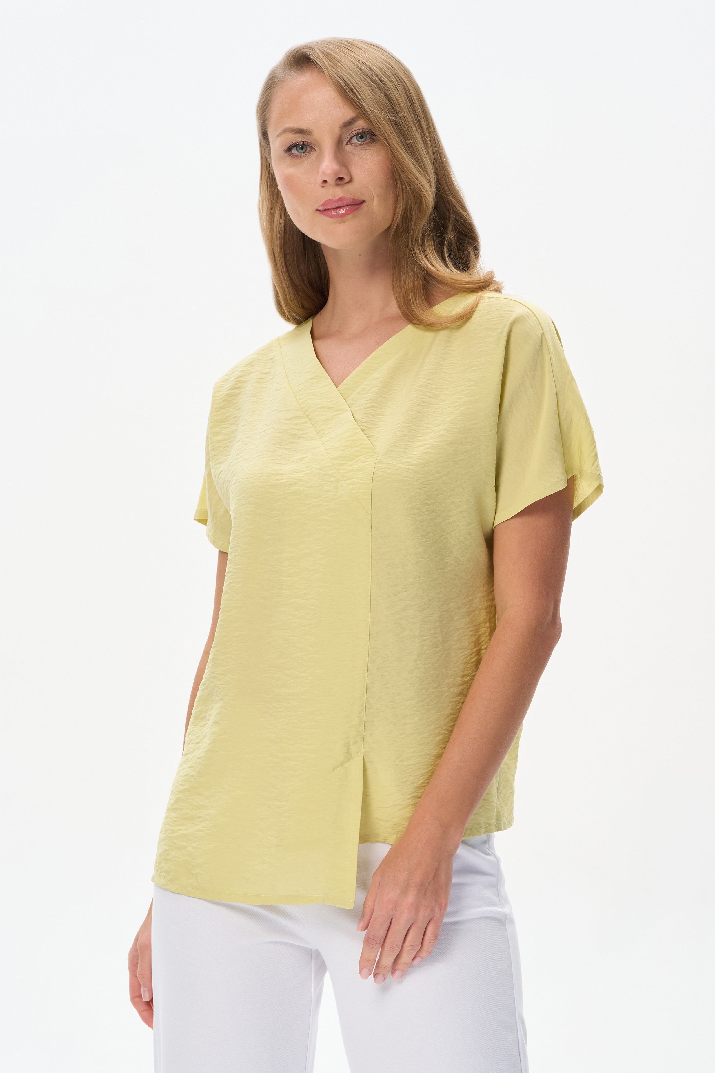 88% вискоза/ 12% полиэстер Блузка из лёгкой плательной ткани 120 гр в трендовом оттенке. Модель с V-образным вырезом горловины, спущенными рукавами, выглядит нарядно не только благодаря цвету, но и модному асимметричному крою. Лёгкая, свободная, комфортная блузка для повседневных и нарядных образов. Рост модели 175 см