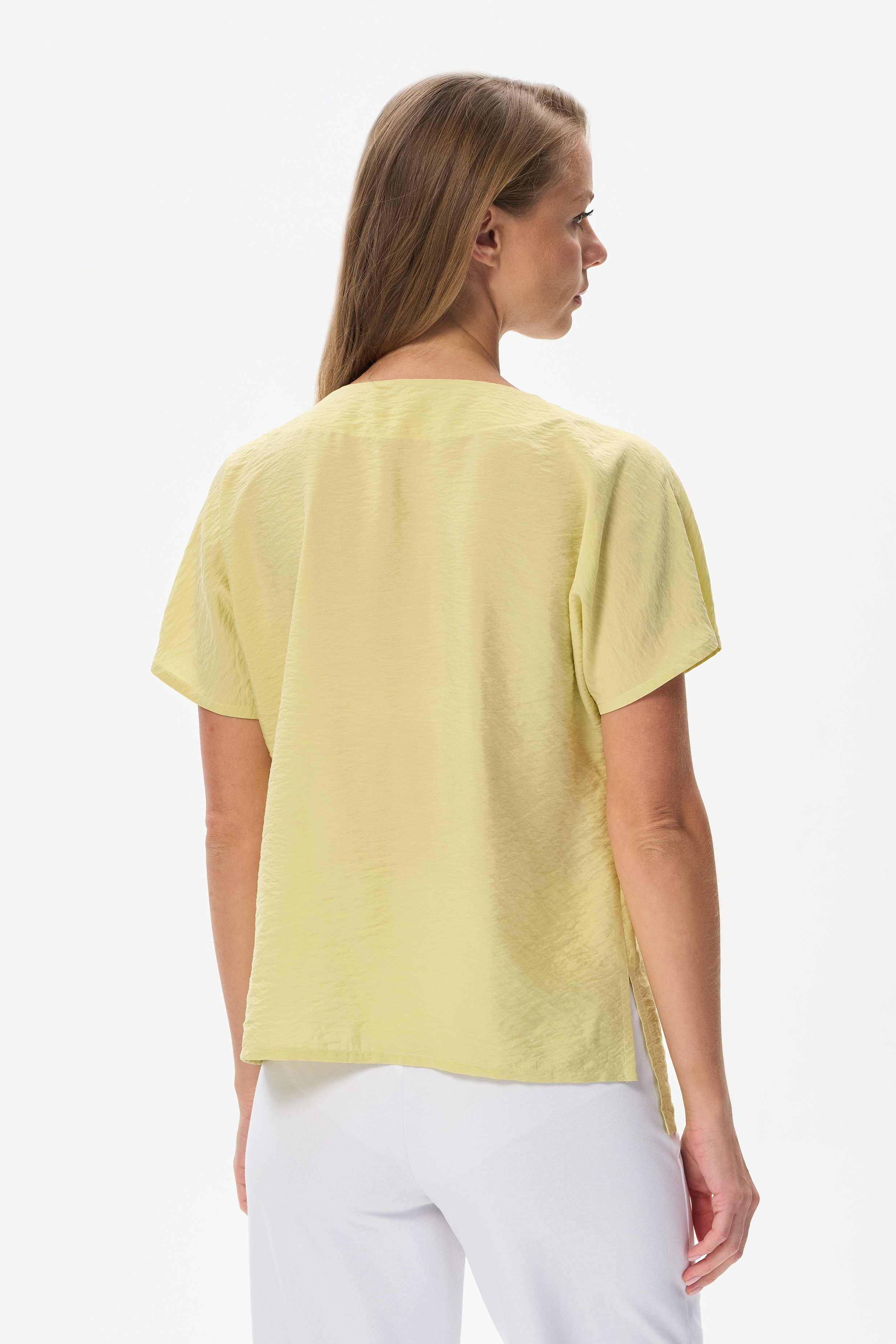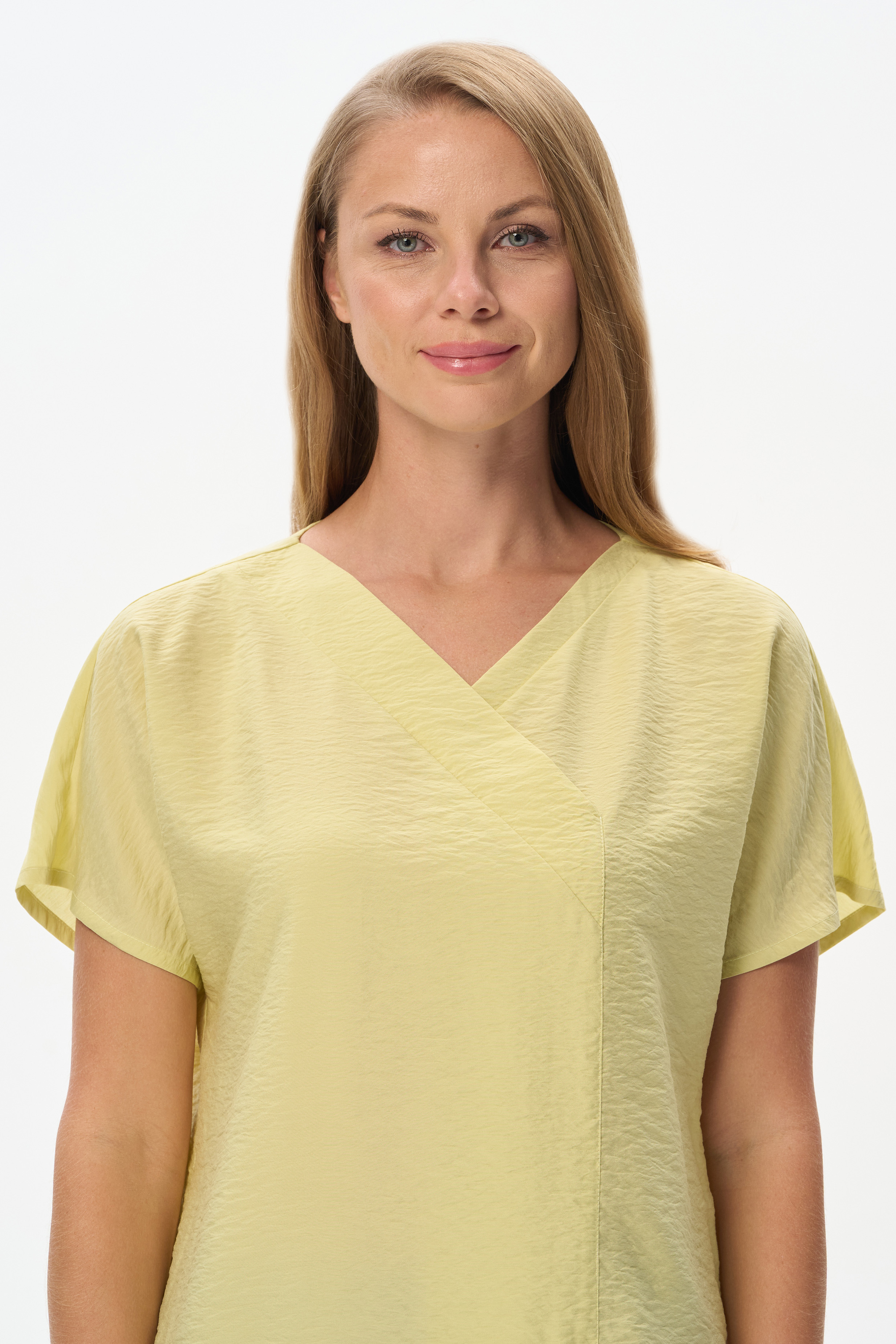 Блузка из лёгкой плательной ткани 120 гр в трендовом оттенке. Модель с V-образным вырезом горловины, спущенными рукавами, выглядит нарядно не только благодаря цвету, но и модному асимметричному крою. Лёгкая, свободная, комфортная блузка для повседневных и нарядных образов. Рост модели 175 см
