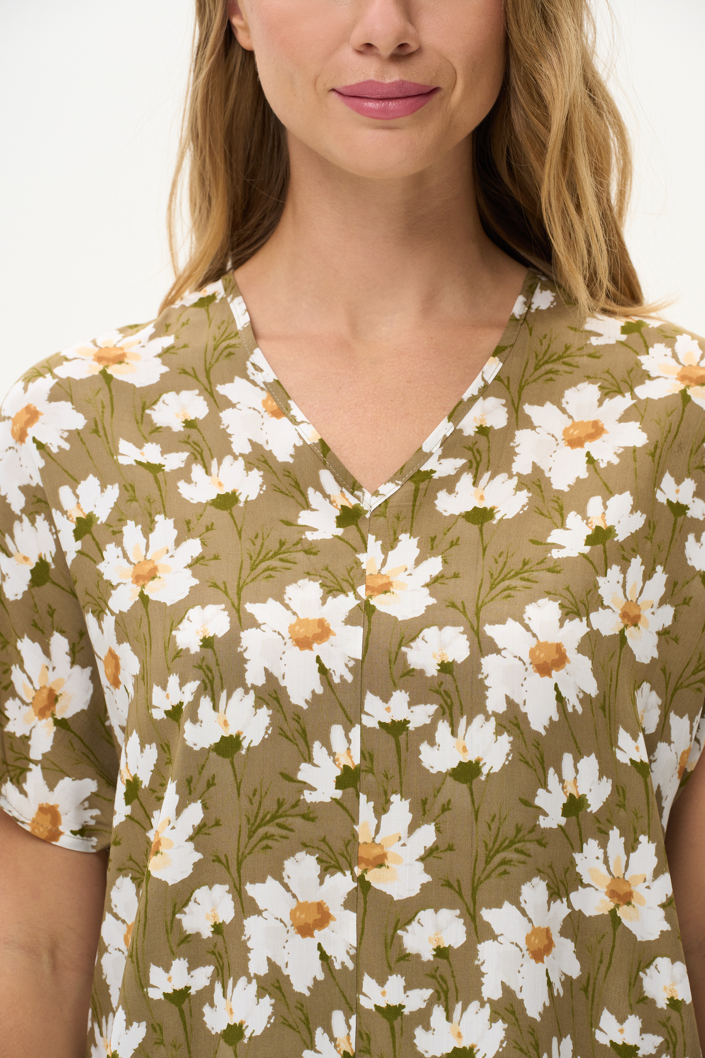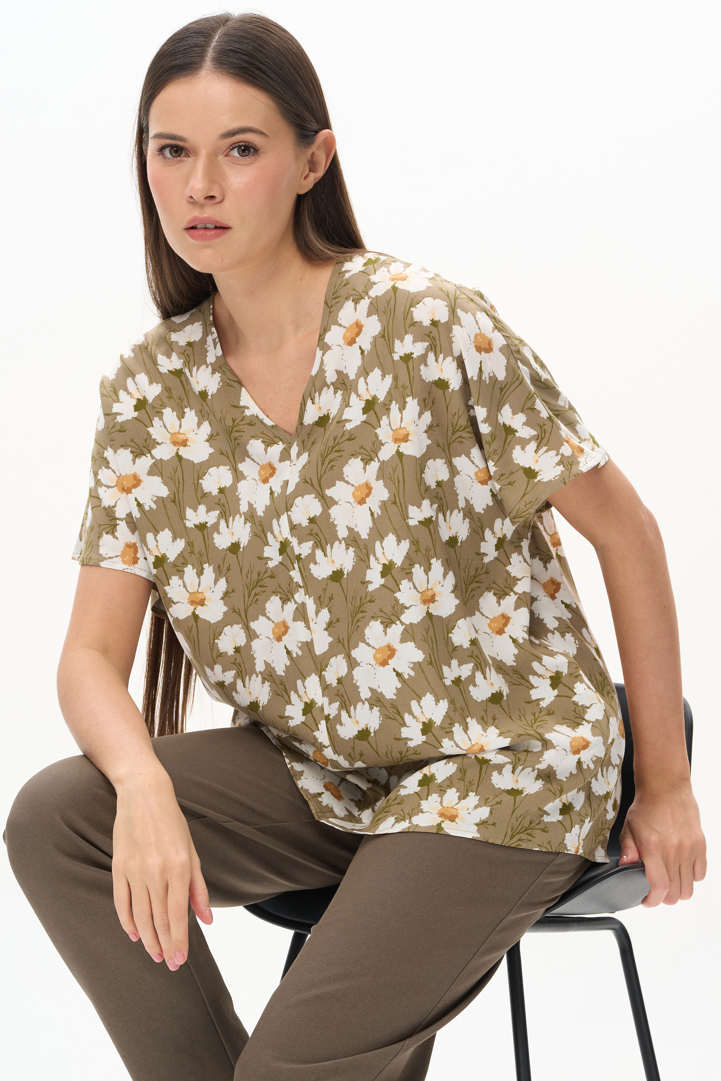 100% вискоза Легкая свободная блузка из штапеля. V-образный вырез горловины. Цельнокроенные короткие рукава. Рост модели на фото 177