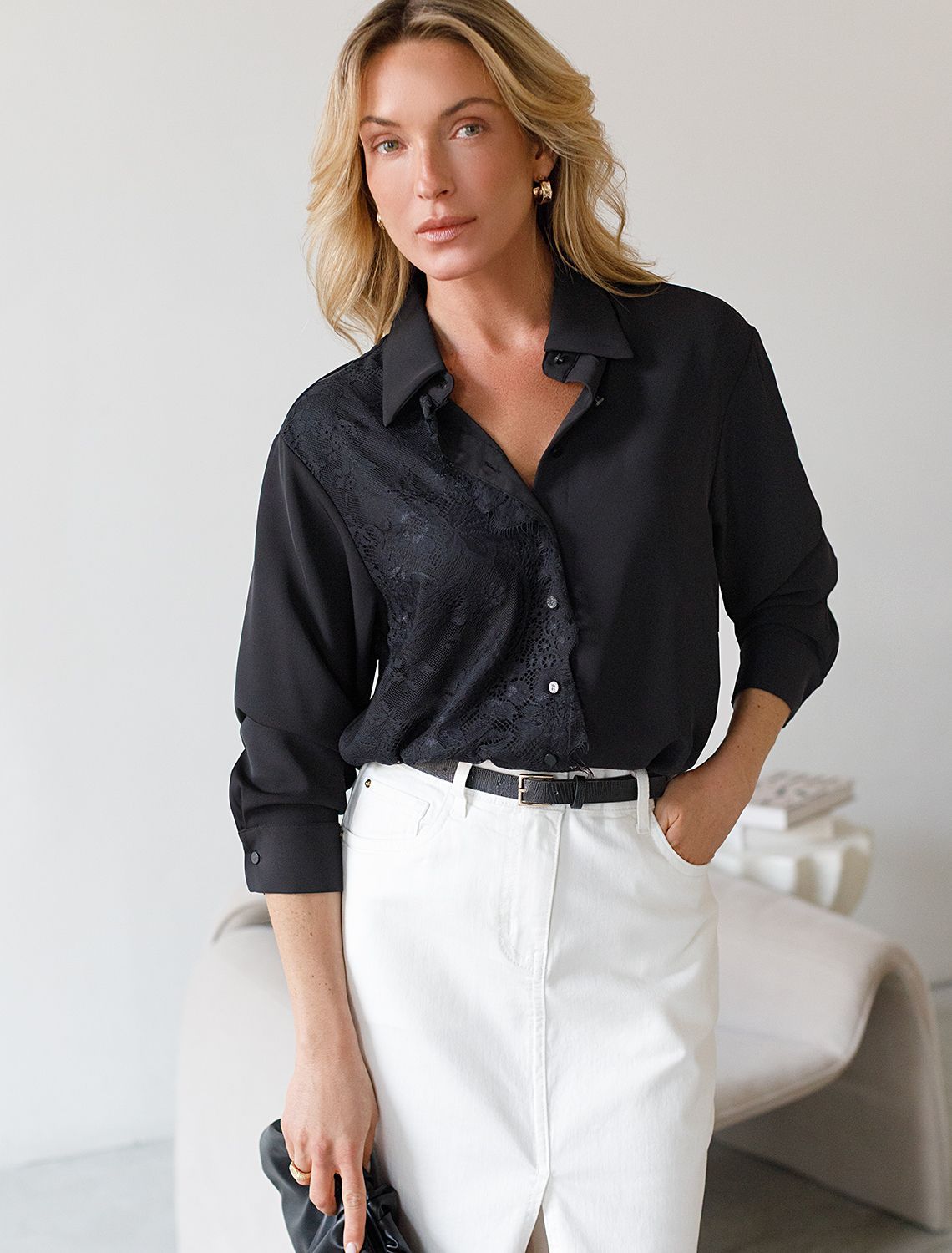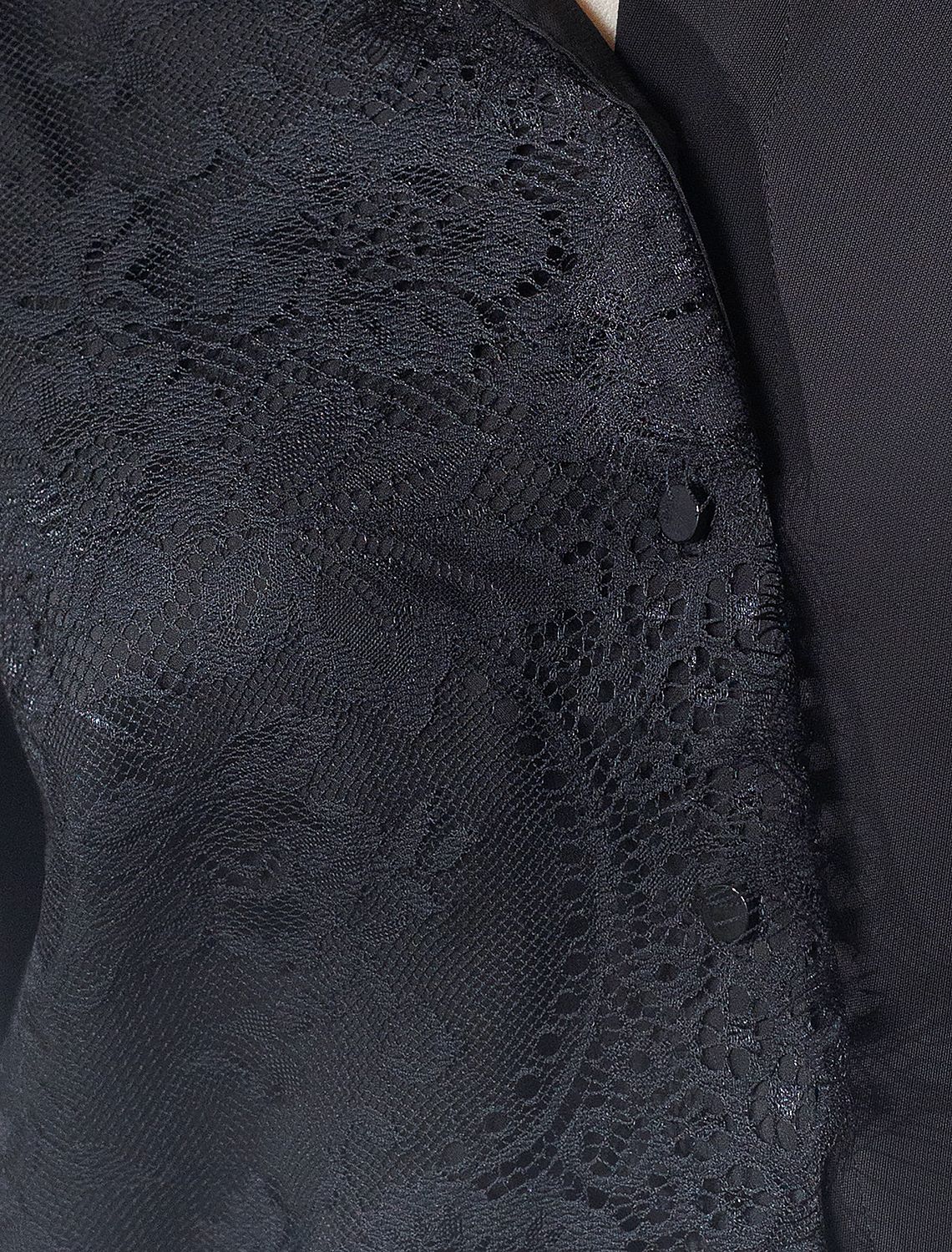 Блузка черного цвета из креп шифона сочетает в себе современные тенденции и классику, позволяя выглядеть элегантно как на торжественном событии, так и на деловой встрече. Материал обеспечивает легкость и комфорт, а изысканное кружево добавляет нотки женственности и утонченности. Нарядная отделка подчеркивает индивидуальность обладательницы, делая образ запоминающимся. Эта рубашка - универсальное решение для разных случаев: она идеально подходит для особых вечеров, торжеств или создания повседневного лука с акцентом на элегантность. Благодаря удачному крою изделие садится по фигуре, не сковывает движения и дарит ощущение свободы в течение всего дня. Деликатное кружево гармонично сочетается с фактурой ткани, формируя стильный внешний вид без лишней вычурности, такой вариант подойдет для создания романтического стиля или дополнения делового гардероба. черный