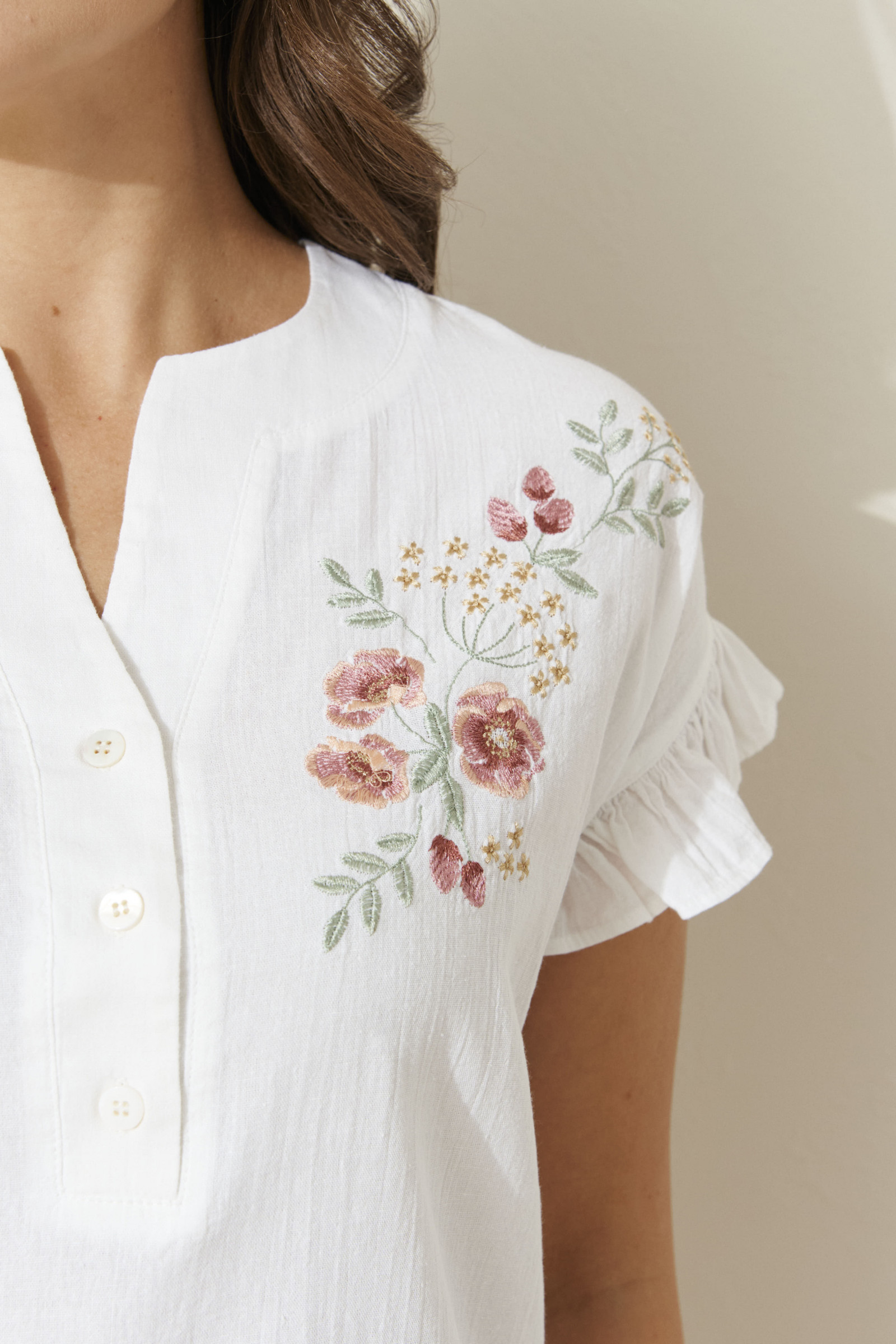 Блуза женская из хлопчатобумажной ткани для повседневной носки. Горловина с V-образным вырезом и планкой, застежка на обметанные петли и пуговицы. Рукав короткий, оформленный рюшей. На переде располагается дизайнерская вышивка. В данной блузке вы будете выглядеть безупречно и элегантно.