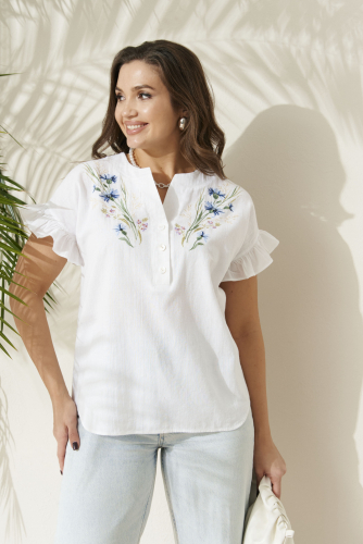 Блуза женская из хлопковой ткани для повседневной носки. Блуза полуприлегающего силуэта с фронтальной застежкой на пуговицы. Рукав коротки оформлен притачной манжетой. Воротник- стойка. По переду блузы вышивка.