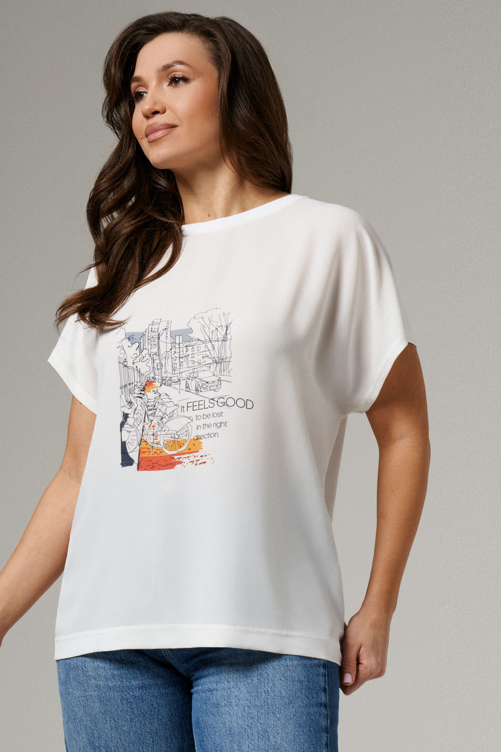 Женская блузка с принтом легко станет акцентной деталью созданного вами летнего образа. В данной блузке перед из лёгкой струящейся ткани, а спинка из приятного на ощупь хлопкового трикотажа, максимально пропускающего воздух к телу и обеспечивающего комфортные ощущения. Летняя блузка женская прямого кроя спереди украшена по центру дизайнерской печатью. Вырез горловины – круглый, обработан бейкой из трикотажа. Линия плеча слегка спущена. Без рукавов. Она превосходно комбинируется с брюками, джинсами, юбками, шортами. Предлагаем вам купить красивую женскую блузку по приемлемой стоимости.