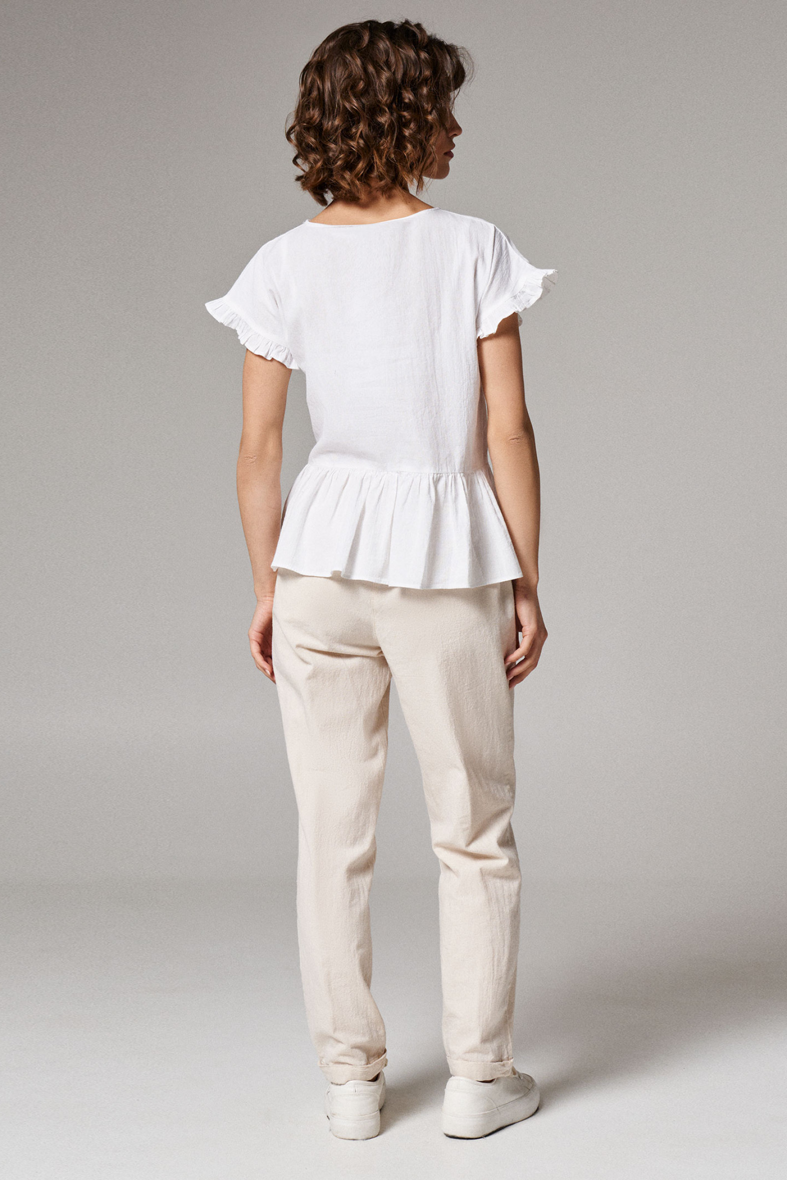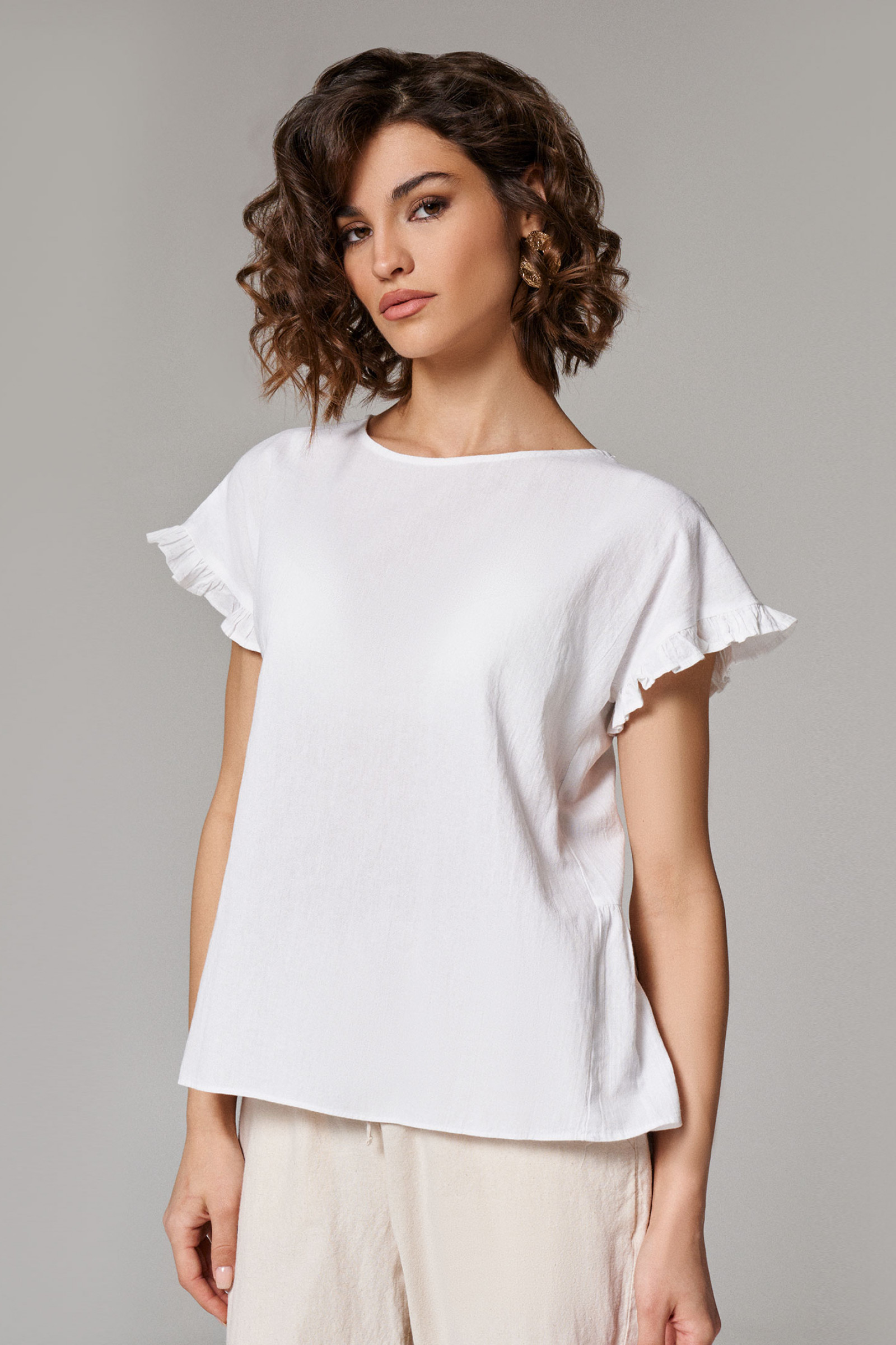 Блуза женская хлопковая для повседневной носки. Блуза прямого кроя с коротким рукавом оформленный рюшей. По низу спинки рюша. Горловина круглая. Прекрасный вариант для жарких дней.