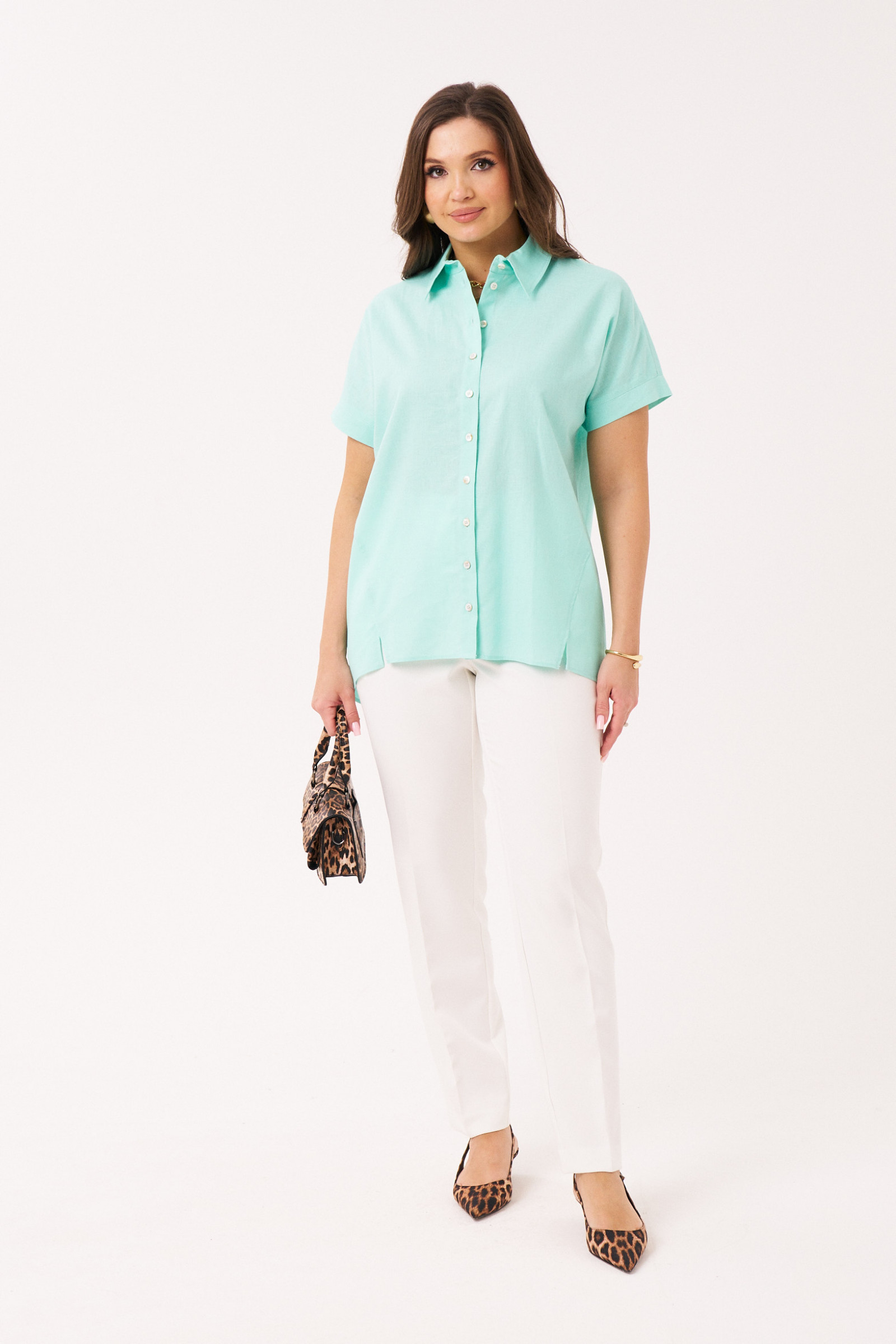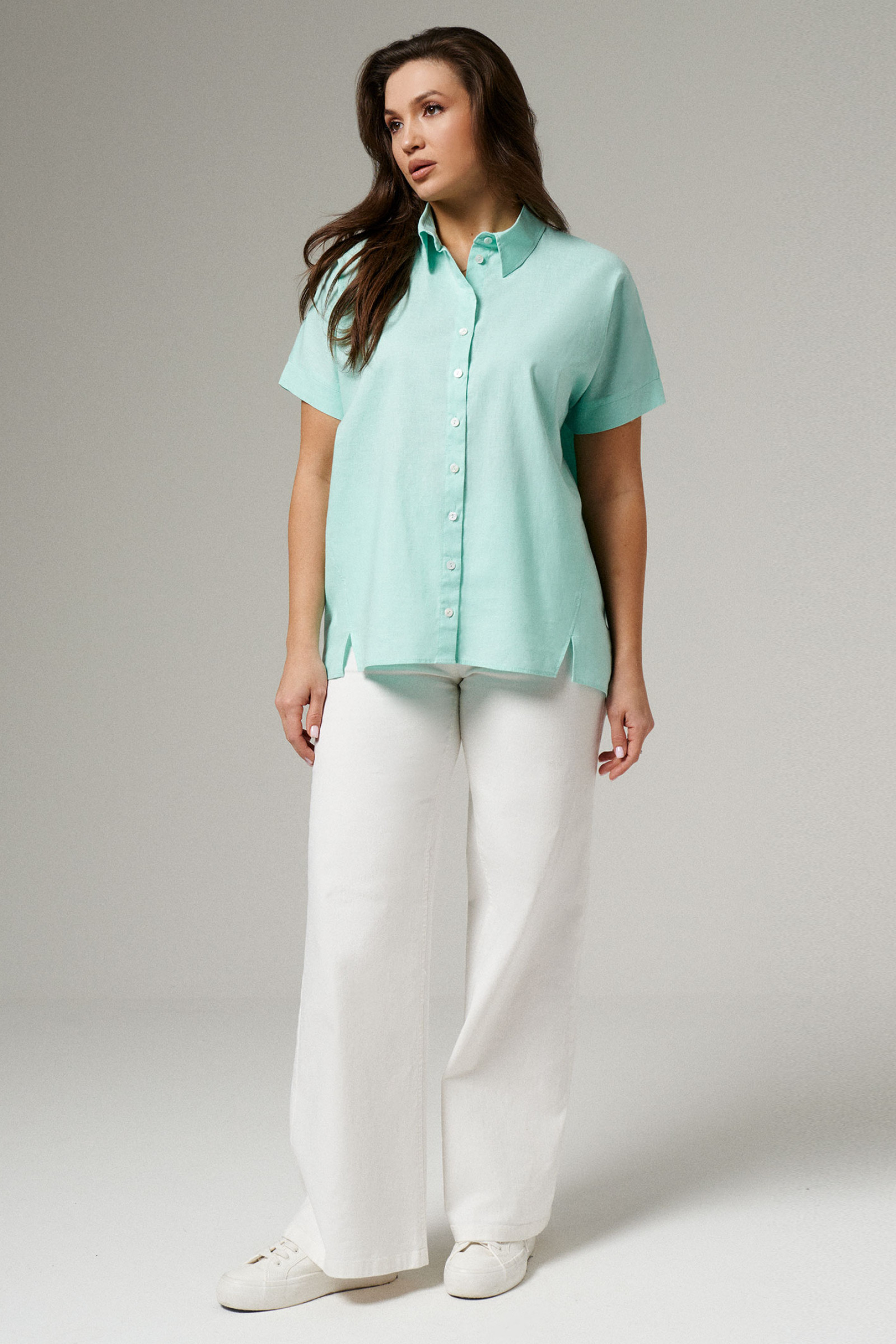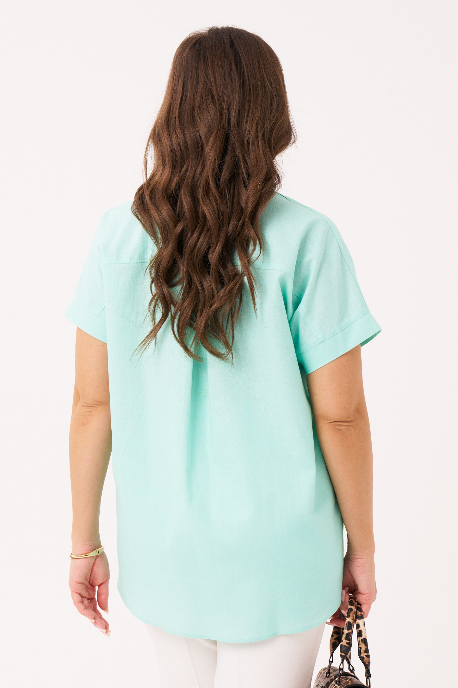Блуза женская из льняной ткани для повседневной носки. Блуза прямого силуэта с коротким цельнокроеным рукавом. По спинке притачной волан. Горловина изделия круглая. Длина классическая.