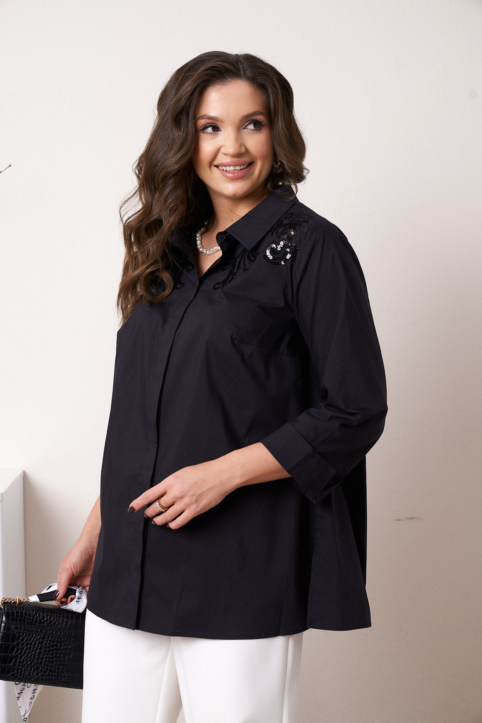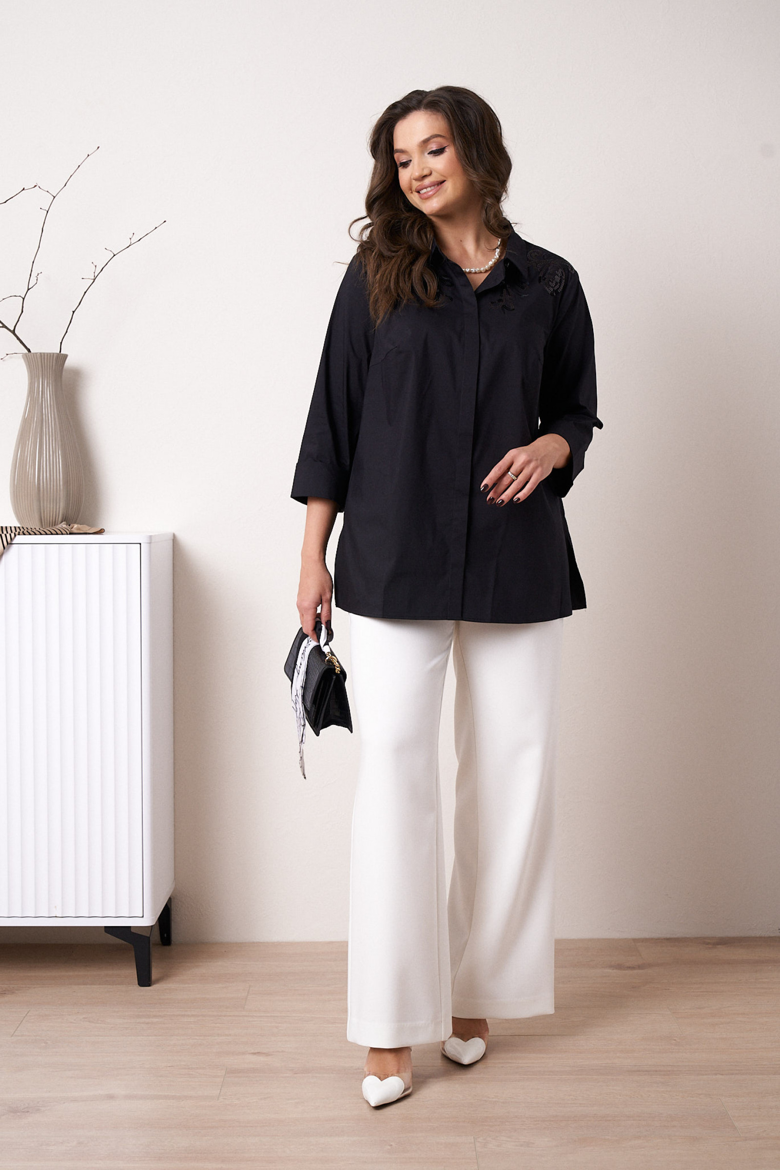 56 Блузка: Длина изделия - 73см, Длина рукава - 47.5см, Обхват шеи - 53.5см, Ширина плеча - 13.2см, Ширина по бедрам - 72.5см, Ширина по груди - 65см, Ширина рукава - 22.5см;