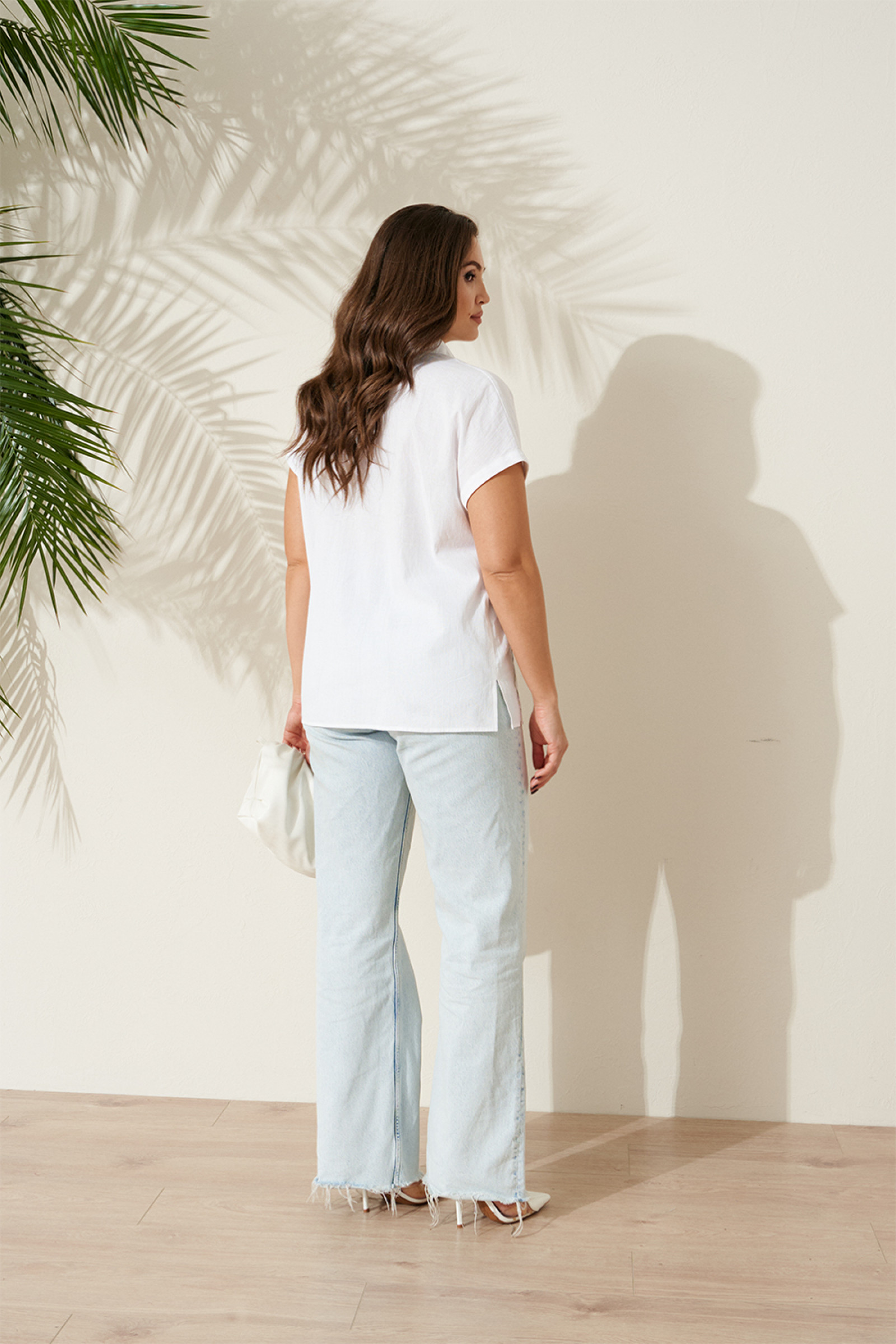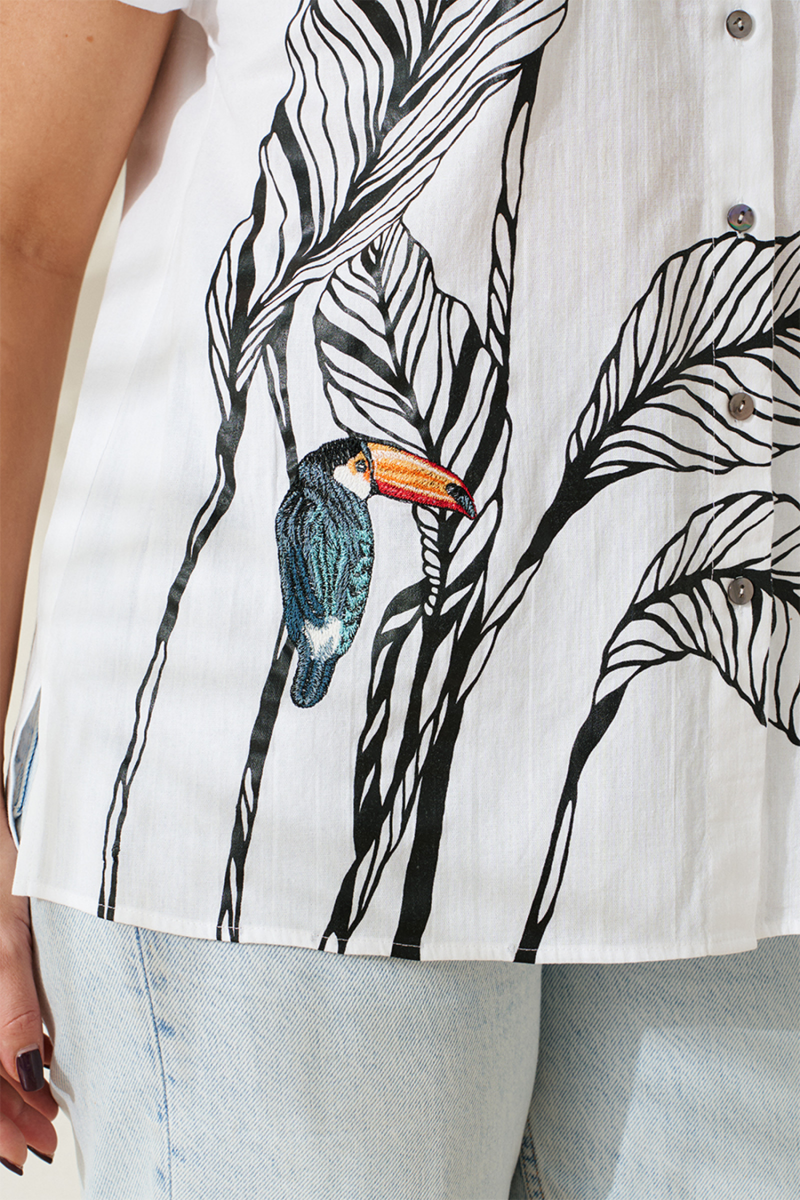 Блузка женская из хлопчатобумажной ткани прямого силуэта для повседневной носки. В блузке имеется центральная бортовая застежка на шесть обметанных петель и шесть пуговиц. Перед имеет дизайнерскую печать в виде листьев и вышивку с туканом. В боковых швах имеются небольшие разрезы. Горловина обработана рубашечным воротником с отрезной стойкой. Блузка с цельнокроеным коротким рукавом. Очень легкая и воздушная блузка подарит вашему телу комфорт, а также будет отлично смотреться на вашей фигуре.