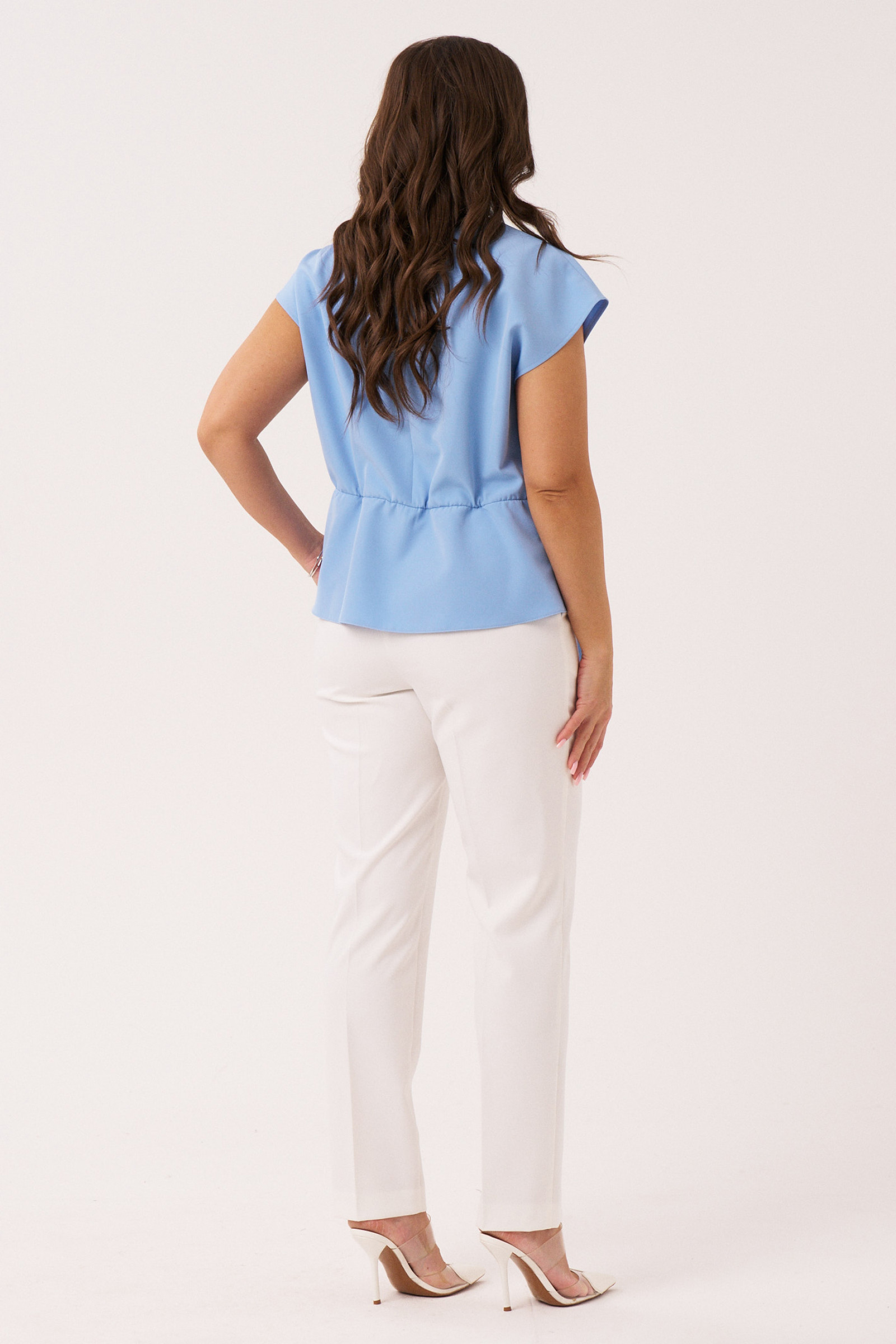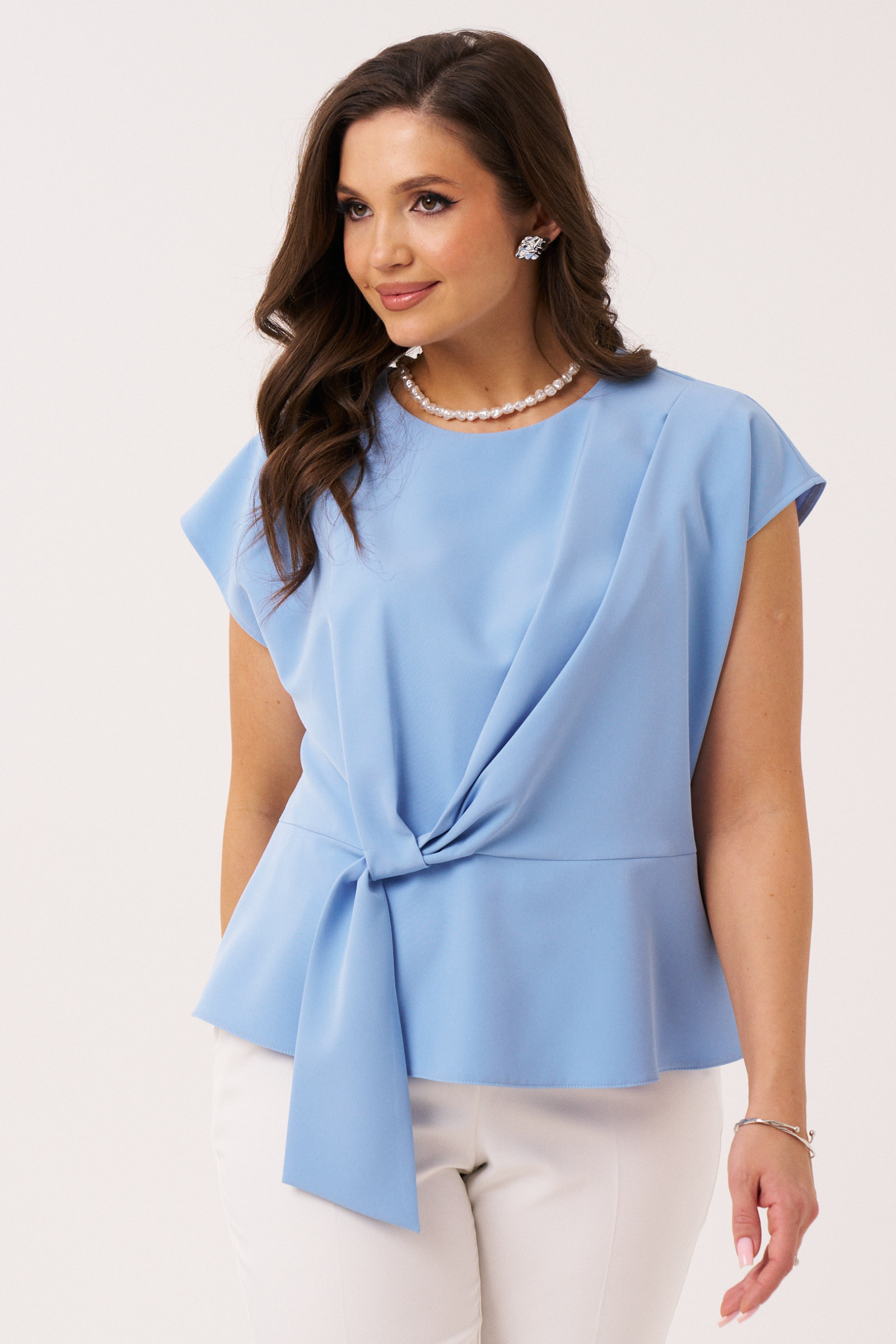 Блузка женская из смесовой ткани — идеальный выбор для тех, кто ценит сочетание стиля, комфорта и универсальности. Эта базовая модель выполнена в голубом оттенке и прекрасно впишется как в повседневный, так и в офисный гардероб. Благодаря свободному крою и уникальному дизайнерскому решению — складке на плечевом шве и декоративному узлу — блузка смотрится элегантно и нарядно. Женская блузка станет отличным решением для весеннего и летнего сезона, позволяя чувствовать себя комфортно даже в жаркую погоду. Спинка изделия выполнена со средним швом и застежкой-капелькой на пуговицу, что добавляет изысканности, а вставка на резинке по талии создает легкую сборку, выгодно подчеркивающую силуэт. Цельнокроеные рукава и округлая горловина придают модели завершенный классический вид. Эта женская блузка будет уместна как для делового образа, так и для торжественных случаев — от рабочих будней в офисе до выходов в свет. Универсальность позволяет носить её с классическими брюками, юбками или джинсами, создавая как офисный, так и повседневный стиль. Особое внимание стоит обратить на высокое качество пошива и ткани из Беларуси, обеспечивающее долговечность и эстетичный внешний вид. Свободное, но элегантное исполнение делает эту модель фаворитом гардероба для современных женщин, стремящихся выглядеть стильно и уверенно в любой ситуации.