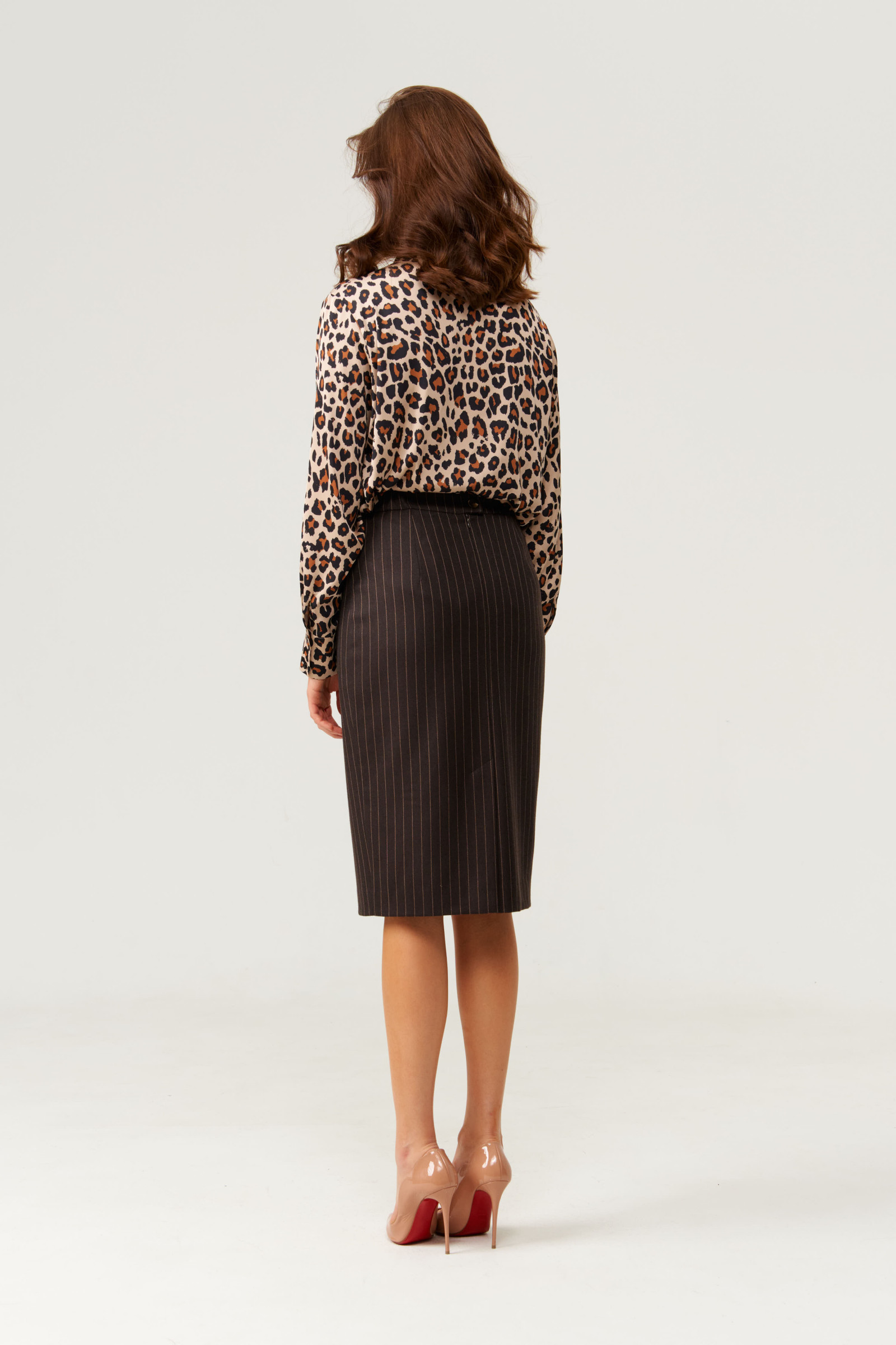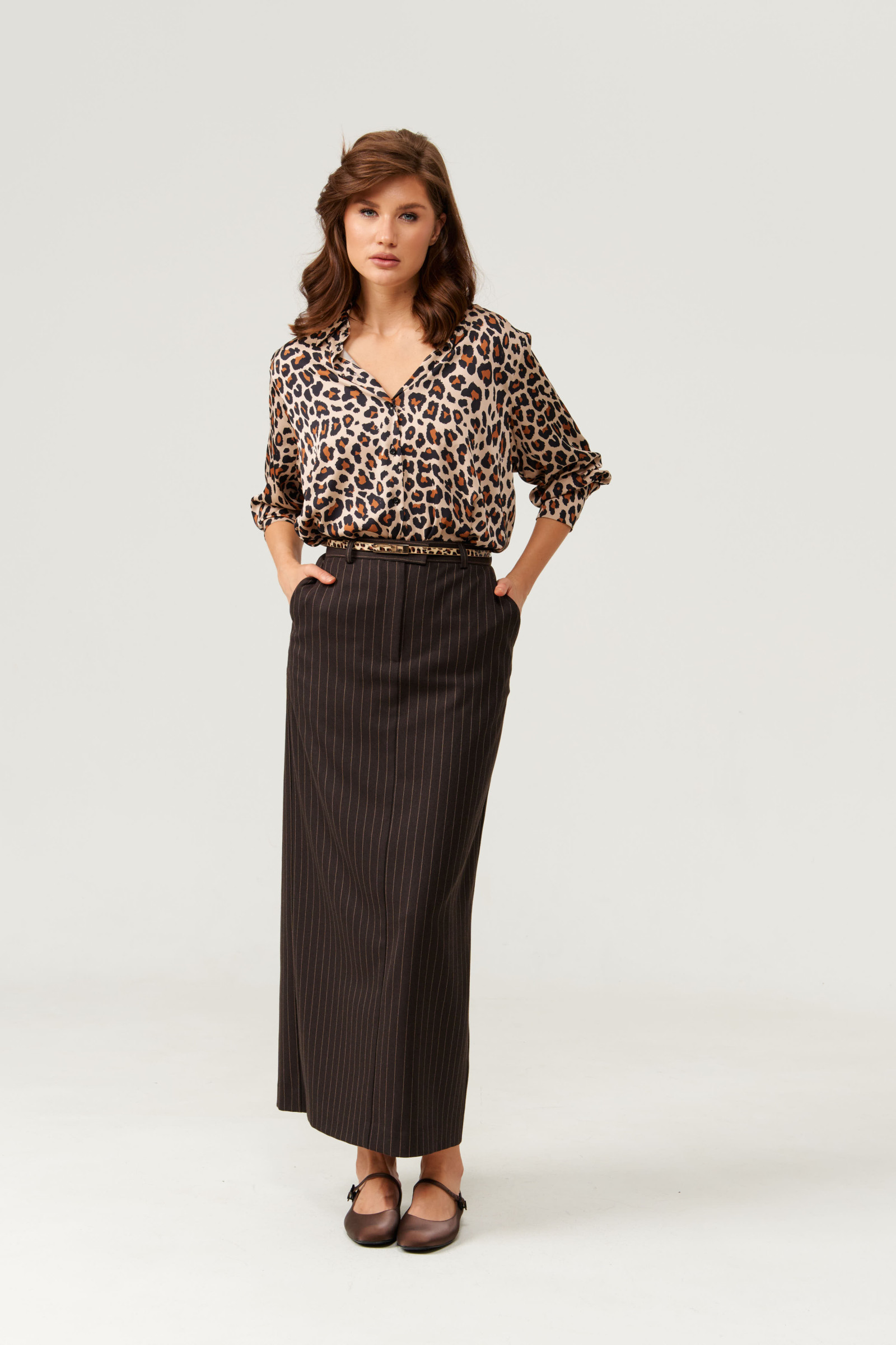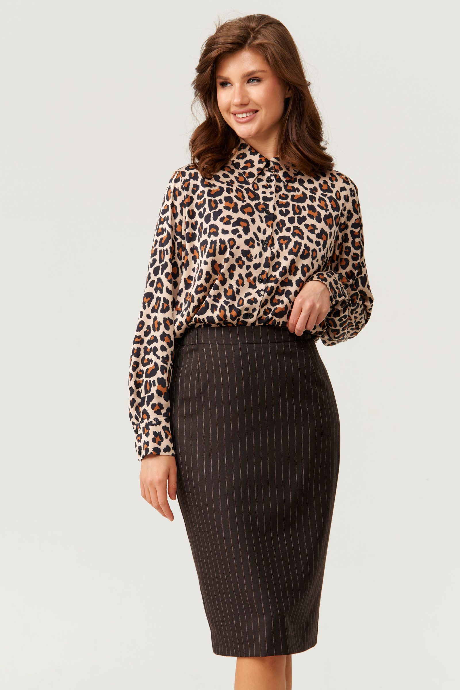 Эта стильная женская блузка бежевого оттенка в зверином принте идеально подойдет для повседневной носки. Выполненная в прямом силуэте, она обеспечивает комфорт и свободу движений. Ткань струящаяся, что придает изделию легкость и изящность. Перед с центральной бортовой застежкой на обметанные петли и пуговицы, а низ изделия выполнен с закругленным краем. Горловина оформлена классическим воротником с отрезной стойкой, а рукава завершены притачными манжетами с застежками на две обметанные петли и пуговицы — практично и стильно. Эта очень легкая и практичная блузка станет отличным выбором для ежедневных образов, сочетая комфорт с элегантностью и привлекательностью.