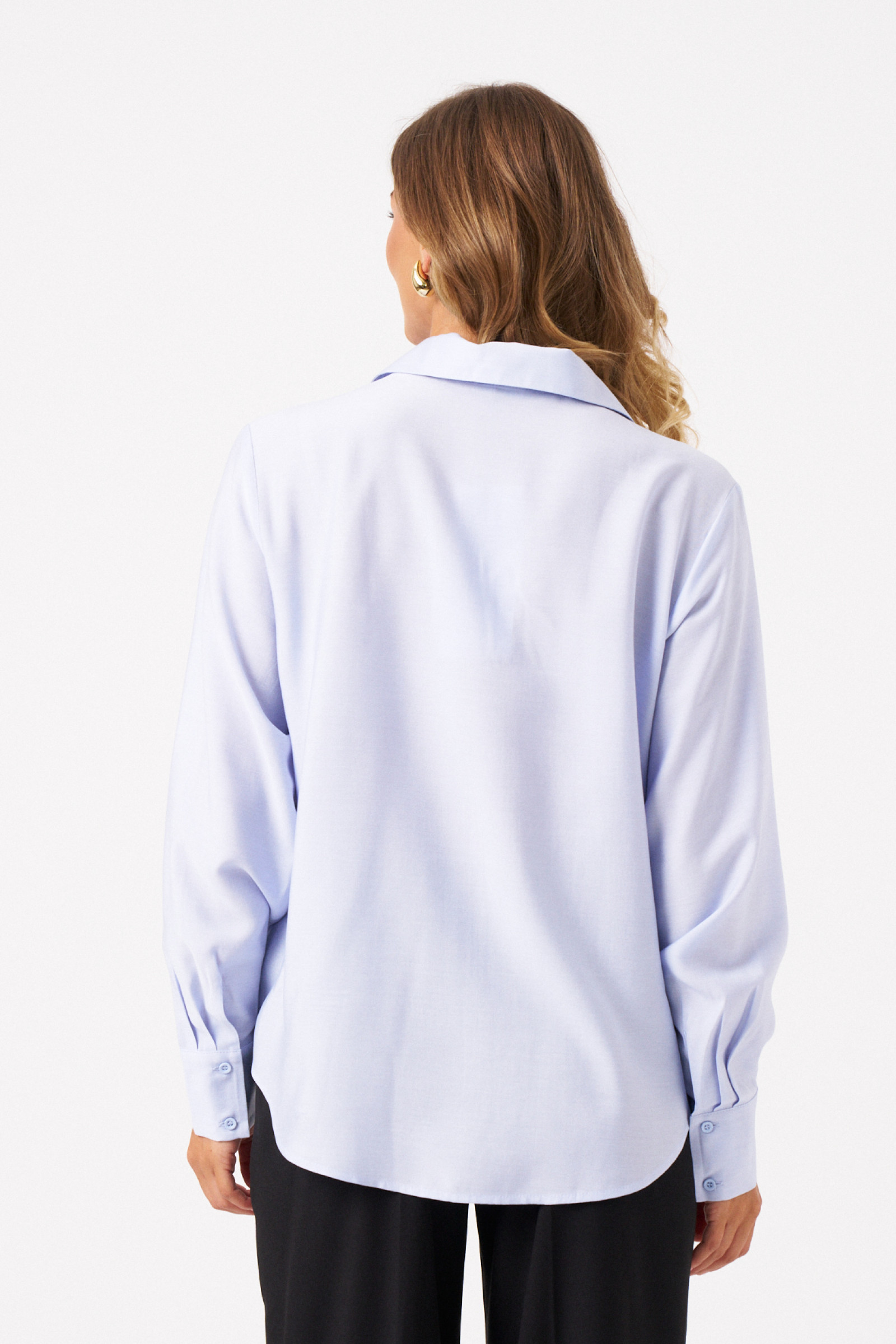 Эта стильная женская блузка голубого оттенка идеально подойдет для повседневной носки. Выполненная в прямом силуэте, она обеспечивает комфорт и свободу движений. Ткань поливискозная, струящаяся, что придает изделию легкость и изящность. Перед украшен центральной бортовой застежкой на обметанные петли и пуговицы, а низ изделия выполнен с закругленным краем, добавляя изящества образу. Горловина оформлена классическим рубашечным воротником, а рукава завершены притачными манжетами с застежками на две обметанные петли и пуговицы — практично и стильно. Эта очень легкая и практичная блузка станет отличным выбором для ежедневных образов, сочетая комфорт с элегантностью и привлекательностью.