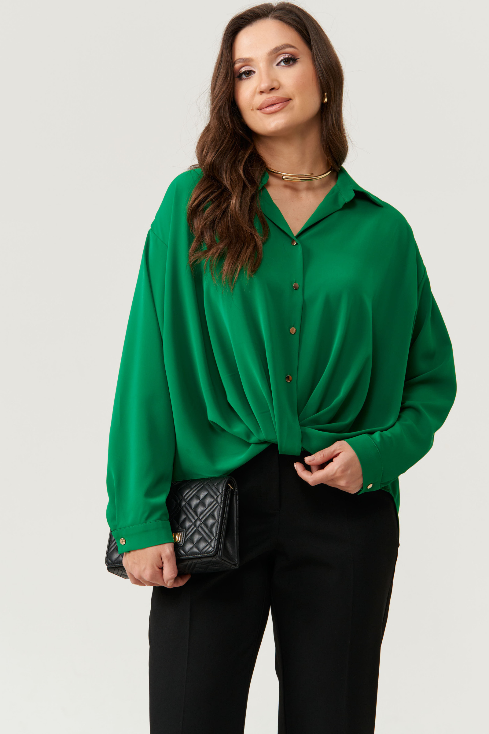 Блузка женская из струящейся ткани для повседневной носки либо для торжественных случаев. Блузка прямого силуэта. Застежка в блузке центральная бортовая на обметанные петли и пуговицы. Перед имеет декоративный узел. Спинка с отрезной кокеткой и бантовой складкой. Спинка изделия длиннее чем перед и имеет полукруглый низ. Горловина обработана воротником с отрезной стойкой. Рукава втачные длинные, низ рукава обработан притачной манжетой с застежкой на одну обметанную петлю и одну пуговицу. Очень легкая и практичная блузка, с оригинальным перекрутом. Блузка зеленого оттенка безусловно украсит любой ваш образ и отлично подчеркнет все достоинства вашей фигуры.