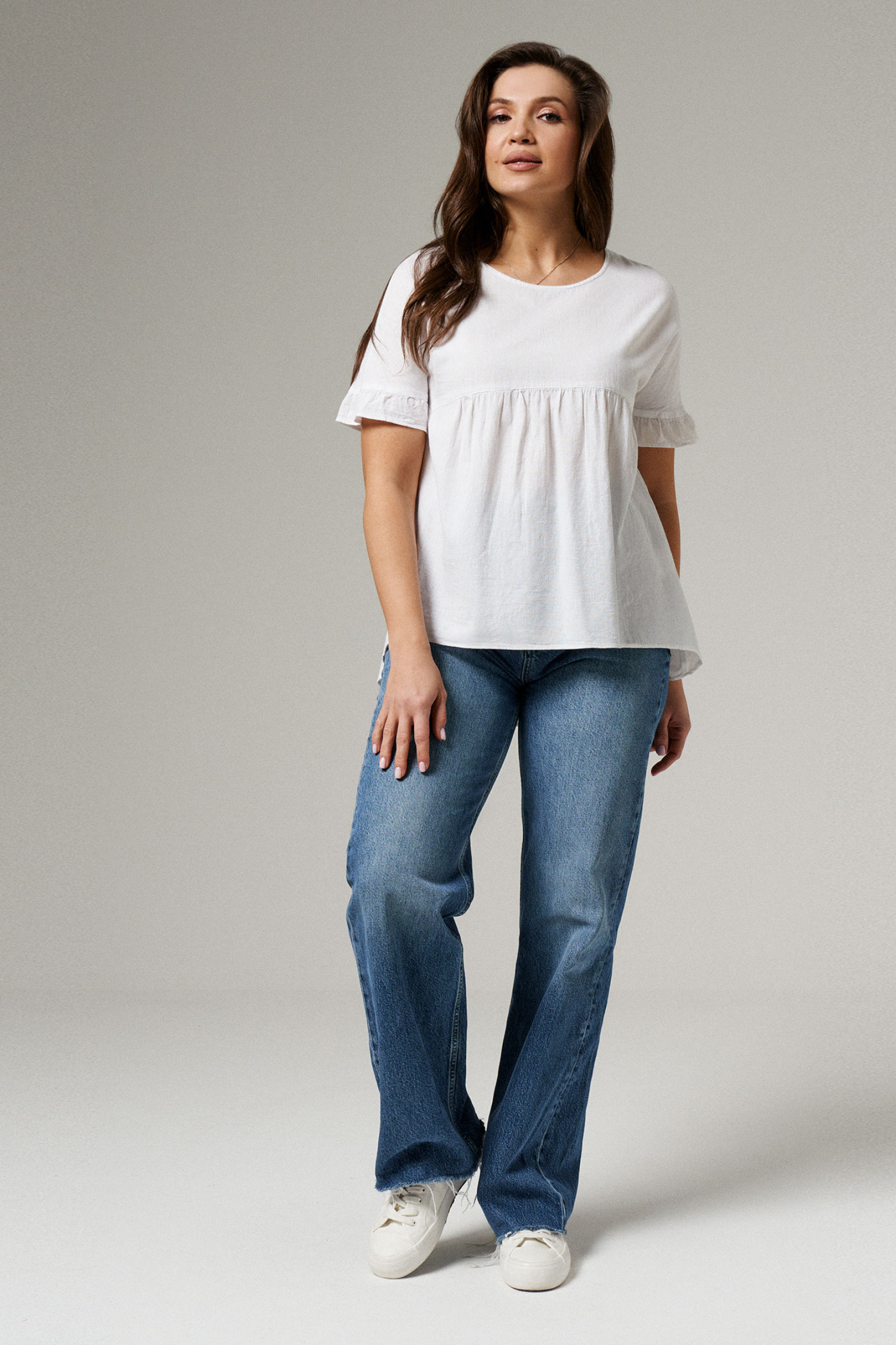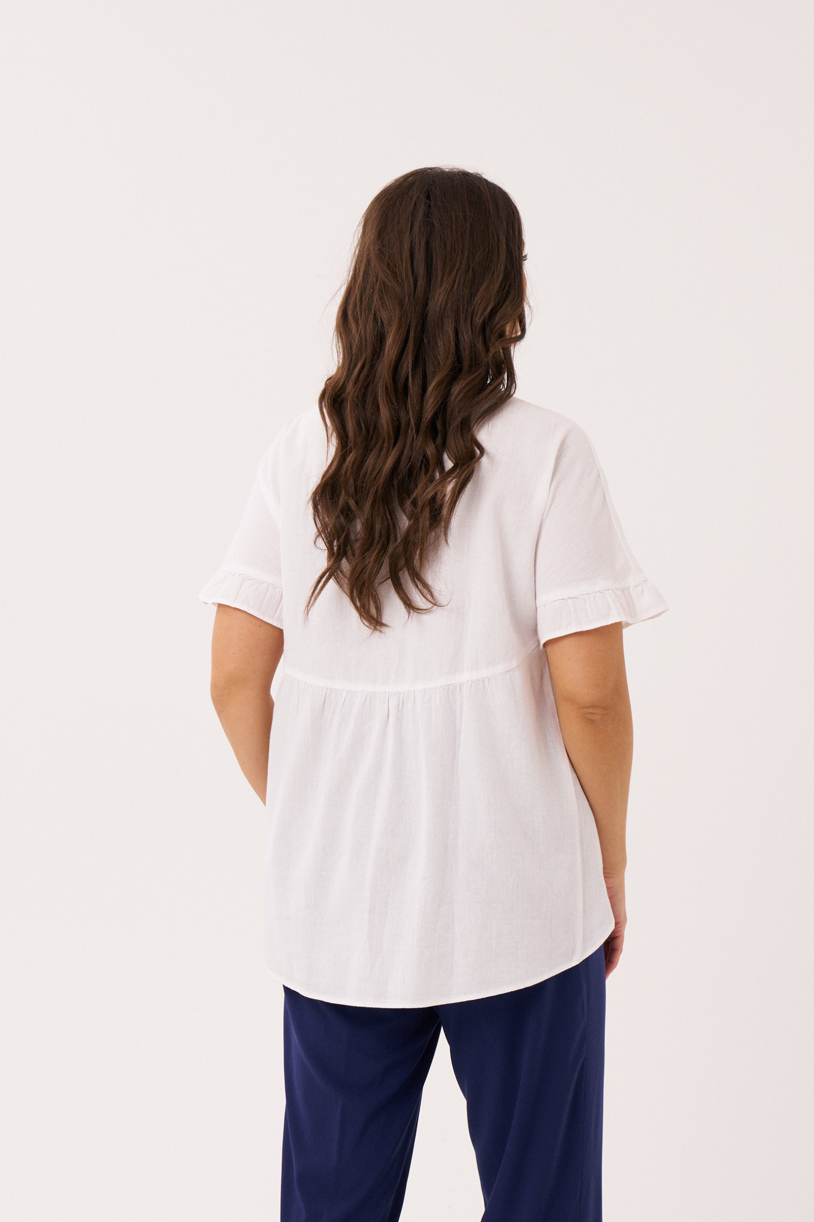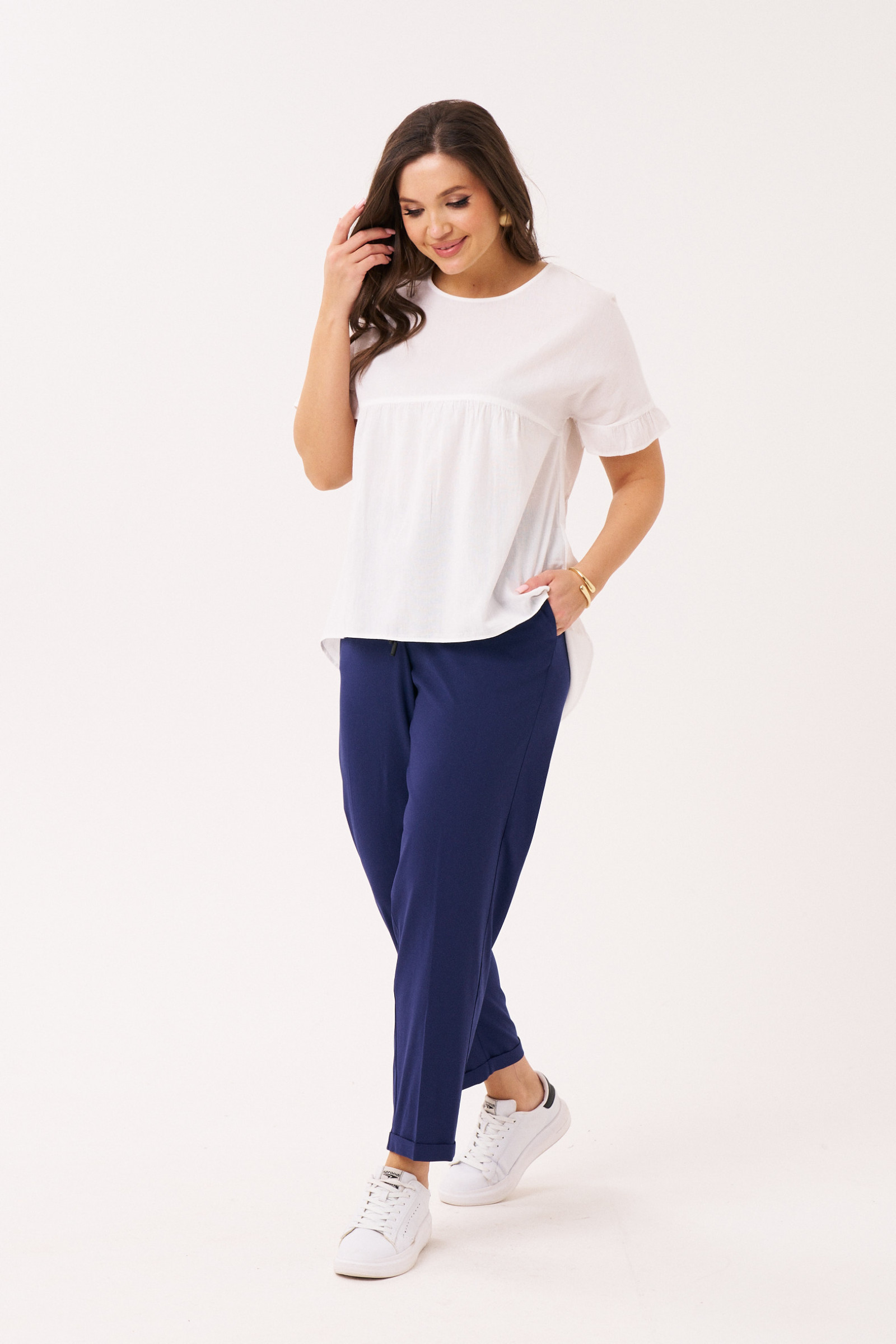Женская блузка содержит в составе 100% хлопок, поэтому в ней комфортно и весной, и летом. Натуральная ткань приятно прикасается к телу, хорошо пропускает воздух и быстро впитывает влагу. Блузка с баской создает свободный силуэт, который скроет небольшой животик или непропорциональные формы. Белая блузка женская выполнена с отрезной закругленной кокеткой, к линии среза которой пришита расклешенная нижняя часть, присборенная в мелкую складку на груди. Летняя блузка женская с укороченным передом и удлиненным низом привнесет в образ кокетливость. Блузка офисная женская с вырезом горловины лодочка и укороченным рукавом3/4 с притачной рюшей - отличный вариант для повседневной носки. Дополните ею свободолюбивый casual или более строгий офисный гардероб. На прогулке, учебе, работе, пляжной вечеринке - блузка женская с коротким рукавом будет уместна везде. Базовая вещь легко подойдет к брюкам и юбкам из имеющегося гардероба.