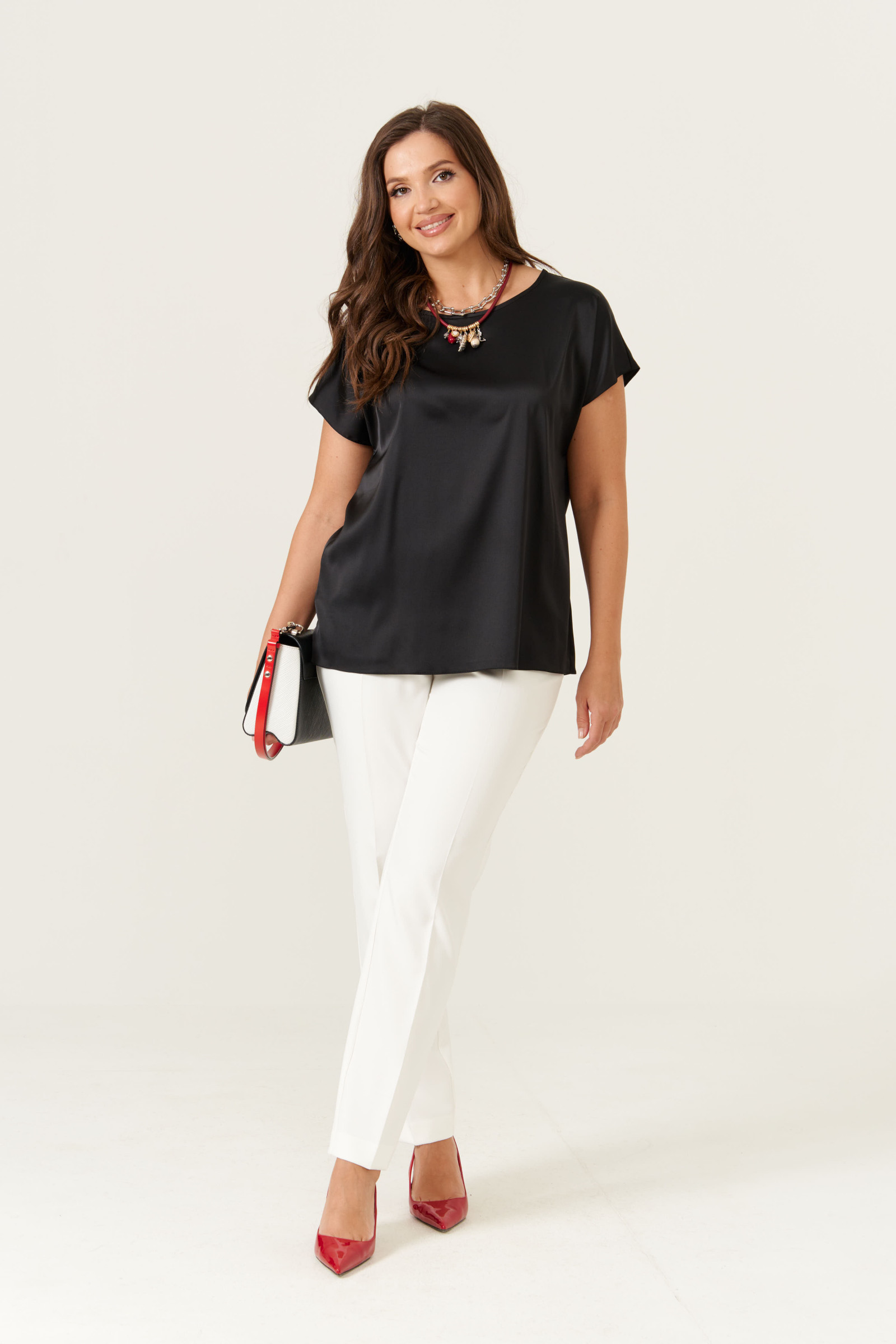 Эта женская базовая блуза прямого силуэта чёрного оттенка — универсальный и стильный выбор для вашего гардероба. Она отлично сочетается с юбками, брюками и джинсами, создавая разнообразные образы для повседневной носки. Легкая и комфортная, блуза выполнена из приятной на ощупь ткани с гладкой поверхностью, которая не парит даже в жаркую погоду. Свободный крой с опущенной линией плеча и короткими цельнокроеными рукавами обеспечивает безупречную посадку и комфорт. Обработанная узкой планкой горловина придает изделию аккуратный вид. Ее легко стирать в машинке, она быстро сохнет и сохраняет форму после стирки. Купите эту блузу и создавайте множество стильных образов для любого дня!
