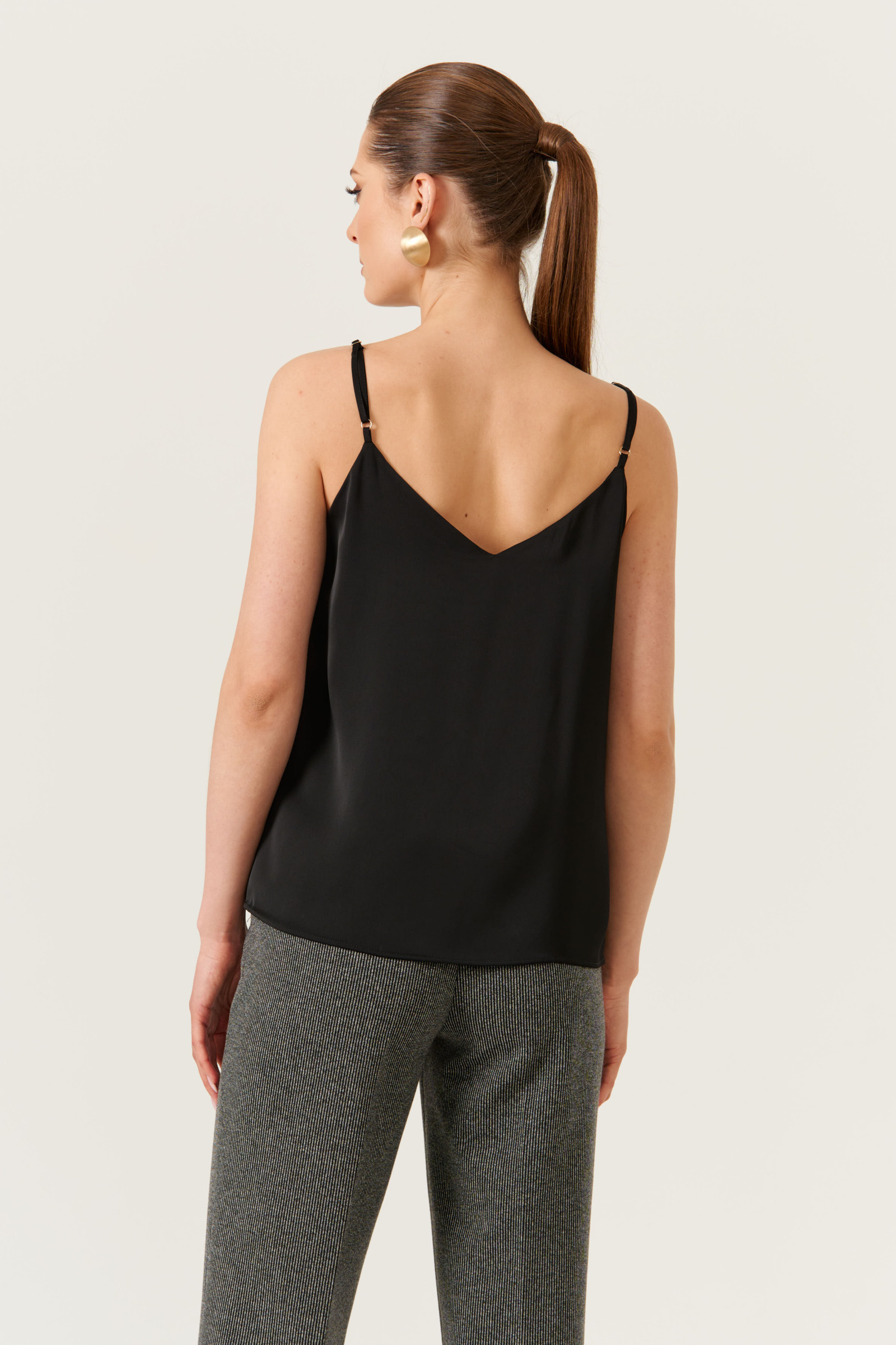 Перед украшен двумя нагрудными вытачками, которые придают изделию аккуратную посадку и подчеркнут фигуру. Горловина выполнена в V-образной форме как по переду, так и по спинке, добавляя образу изящества и женственности. Блузка оснащена регулирующими бретелями, что позволяет настроить посадку по индивидуальным предпочтениям.