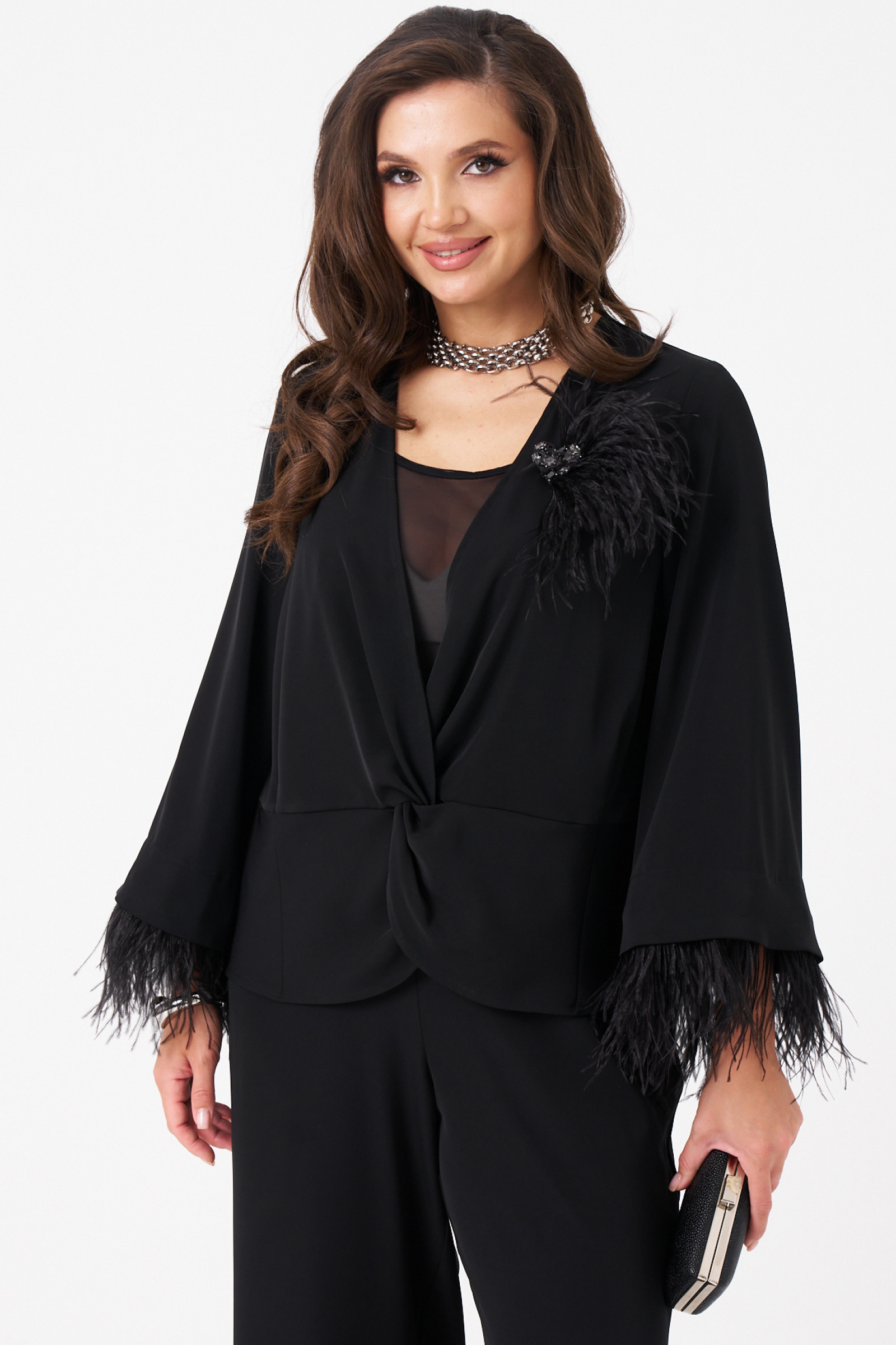 Передняя часть украшена подрезом и перекрутом, создающими красивые складки и придающими изделию изящный вид. Рукава втачные длинные, расширяющиеся к низу, украшены декоративной тесьмой с перьями по краю. Перья крепятся на маленькие кнопки и при желании отстёгиваются дл ясоздания нового образа или для стирки блузки.