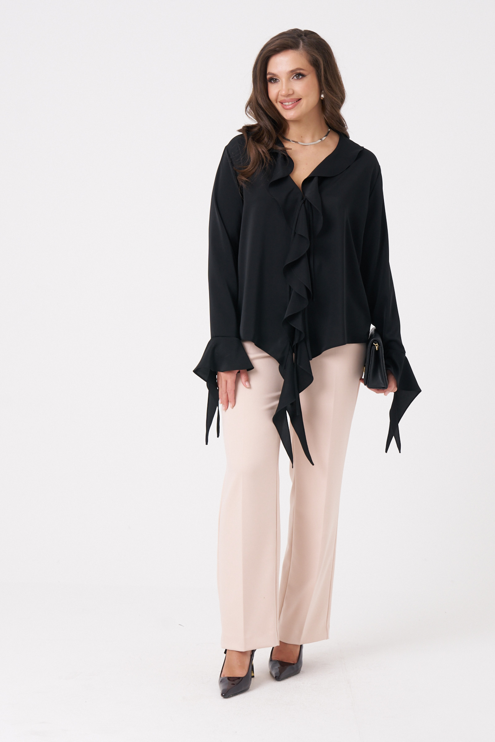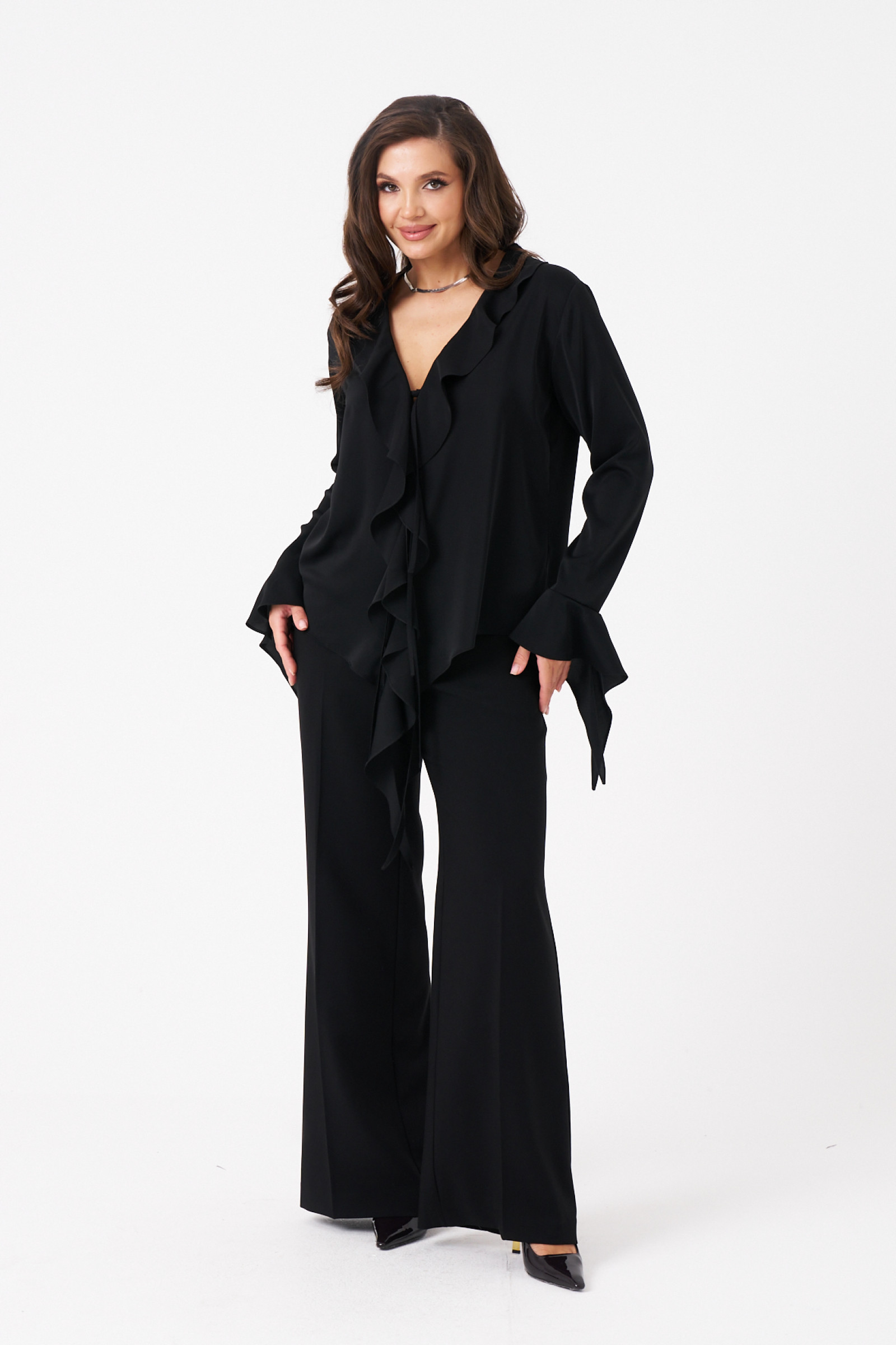 Эта женская блузка из струящейся ткани идеально подойдет для повседневной носки. Ее прямой силуэт обеспечивает комфорт и элегантность. Перед украшен воланами вдоль V-образной горловины и края борта, что придает изделию изящный и женственный вид. Воланы расположены чуть ниже изделия, создавая мягкий акцент. Длинные втачные рукава с обработанными притачными воланоми на низе добавляют изящества и завершенности образу. Перед блузки украшен завязками, которые позволяют регулировать посадку и подчеркивать талию. Классический черный цвет делает эту модель универсальной — она отлично дополнит любой гардероб и подчеркнет достоинства вашей фигуры.