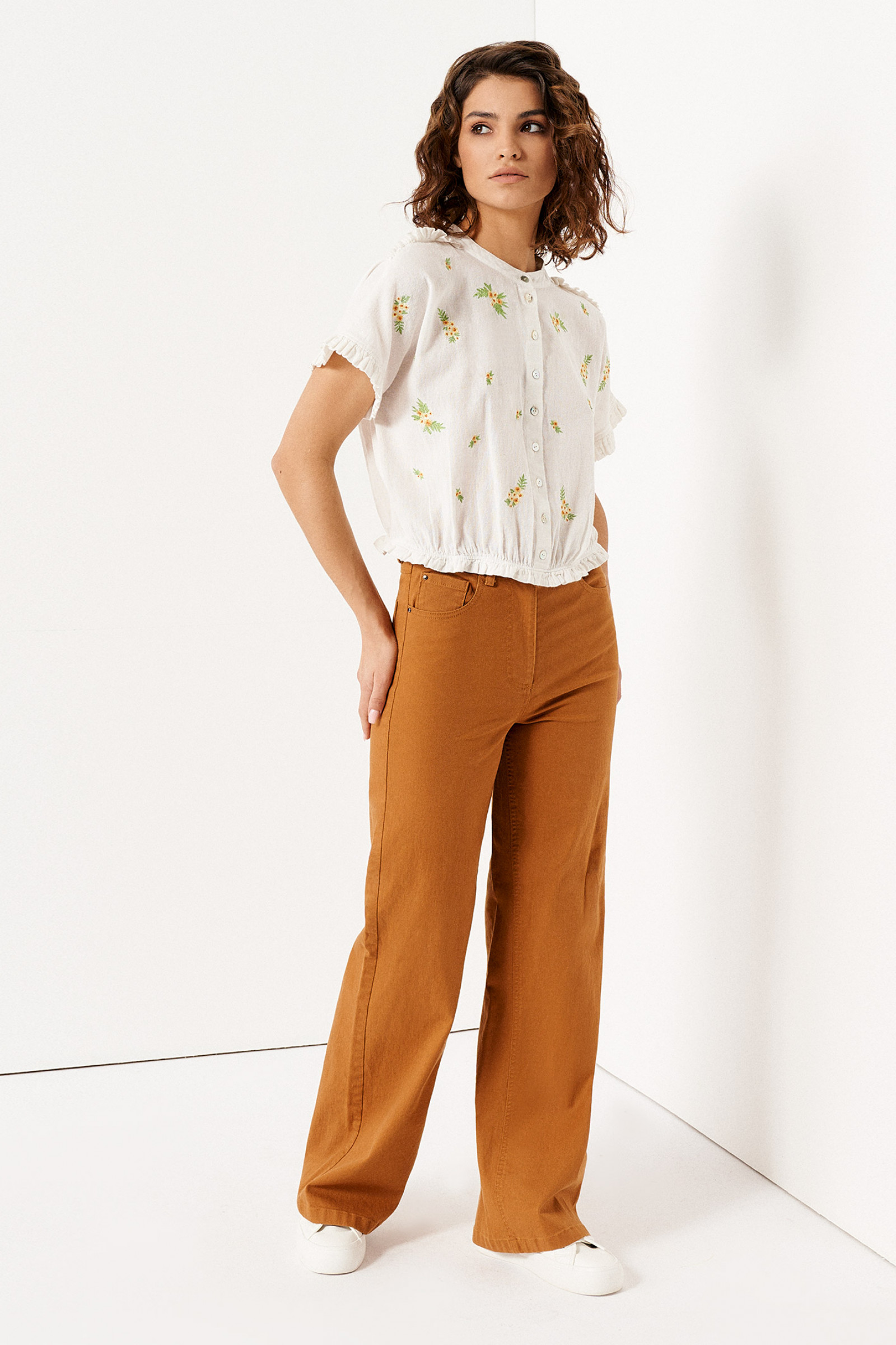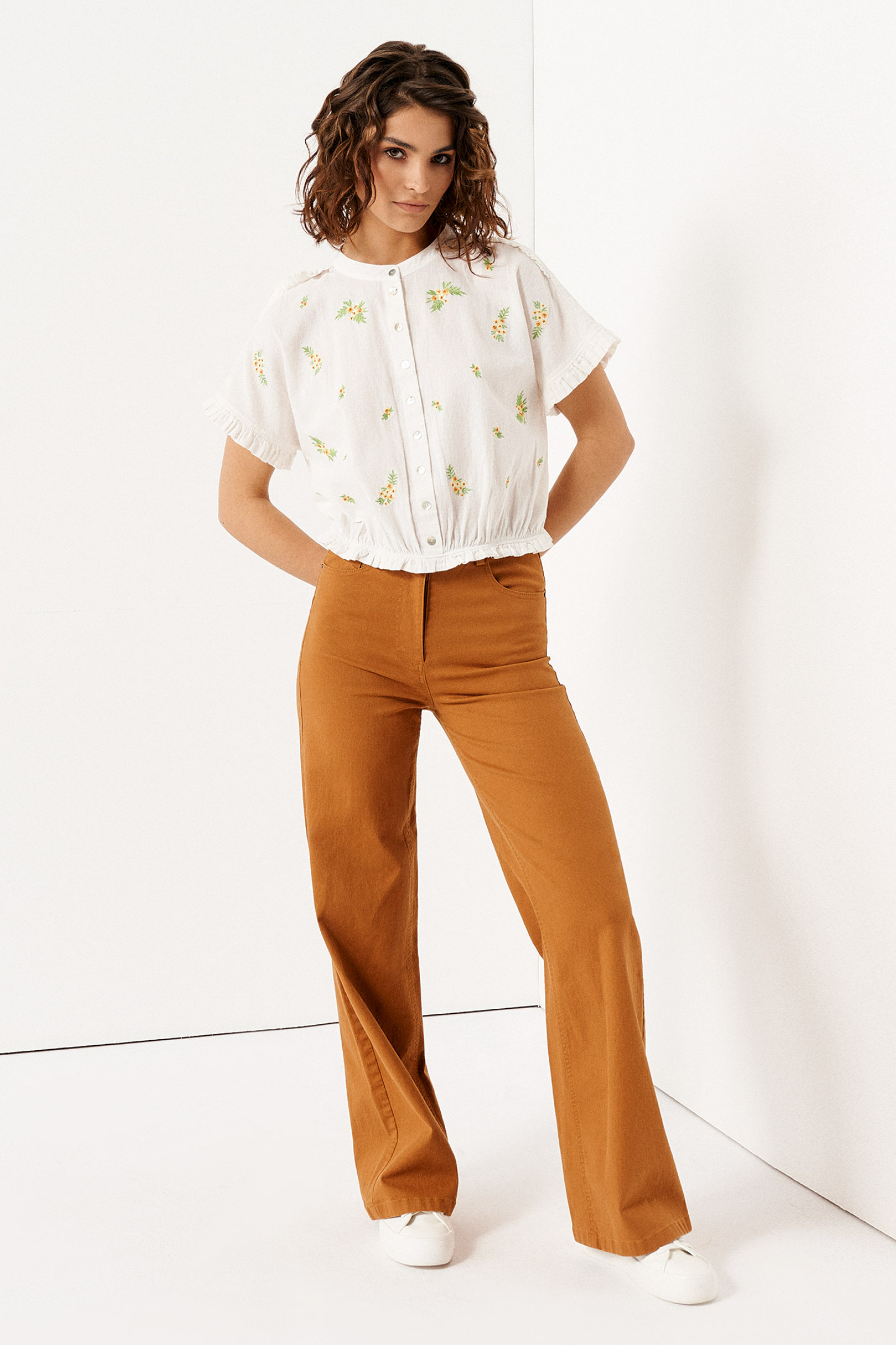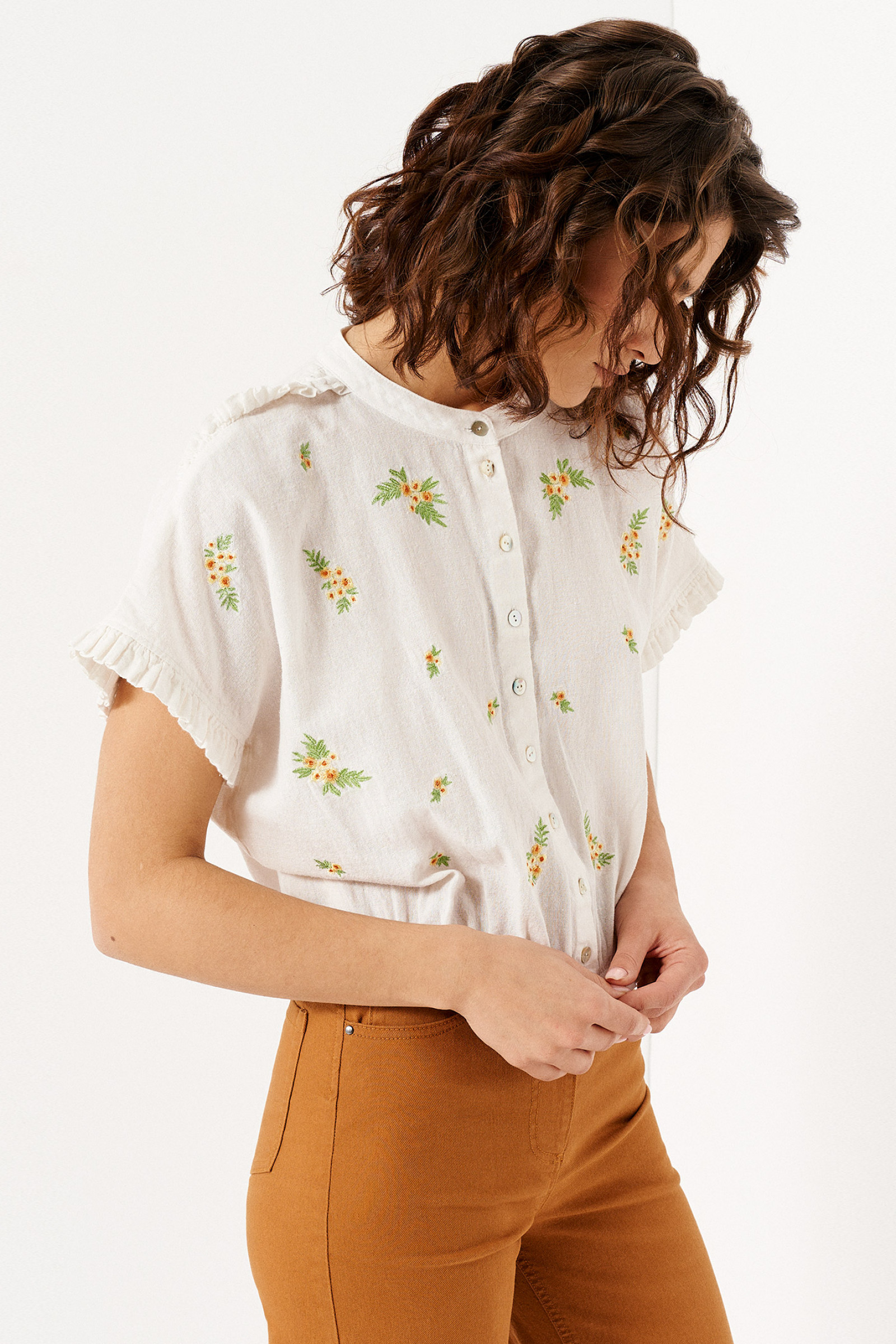 Нарядная летняя блузка из хлопка - идеальный выбор для вас. Незаменима для офисной работы, деловых встреч, посещения семинаров, прогулок с друзьями. Вышивка, сборка по низу и ряд пуговиц спереди делают блузу нарядной. Благодаря своему крою короткая блузка на пуговицах подчеркнет вашу фигуру, визуально уравновесив плечи, бюст и бедра. Хорошо сочетается с джинсами и брюками с высокой посадкой. Укороченная блуза с коротким рукавом послужит акцентом для ваших повседневных образов, идеально гармонируя с юбками, брюками, джинсами, шортами. Изготовленная из натурального 100% хлопкового полотна, она отличается невероятной мягкостью, нежностью, приятной гладкостью поверхности. Модная блузка с цветочным принтом смотрится романтично, благодаря невысоким оборкам в мелкие складки на рукаве, в верхней части плеча и по низу изделия. Модель пошита в размерах 42-48 без воротника, застегивается на пуговицы. Крой свободный, нижний - собран на тонкую резинку. Предлагаем вам недорого купить красивые легкие летние блузки для повседневной носки и торжественных событий.