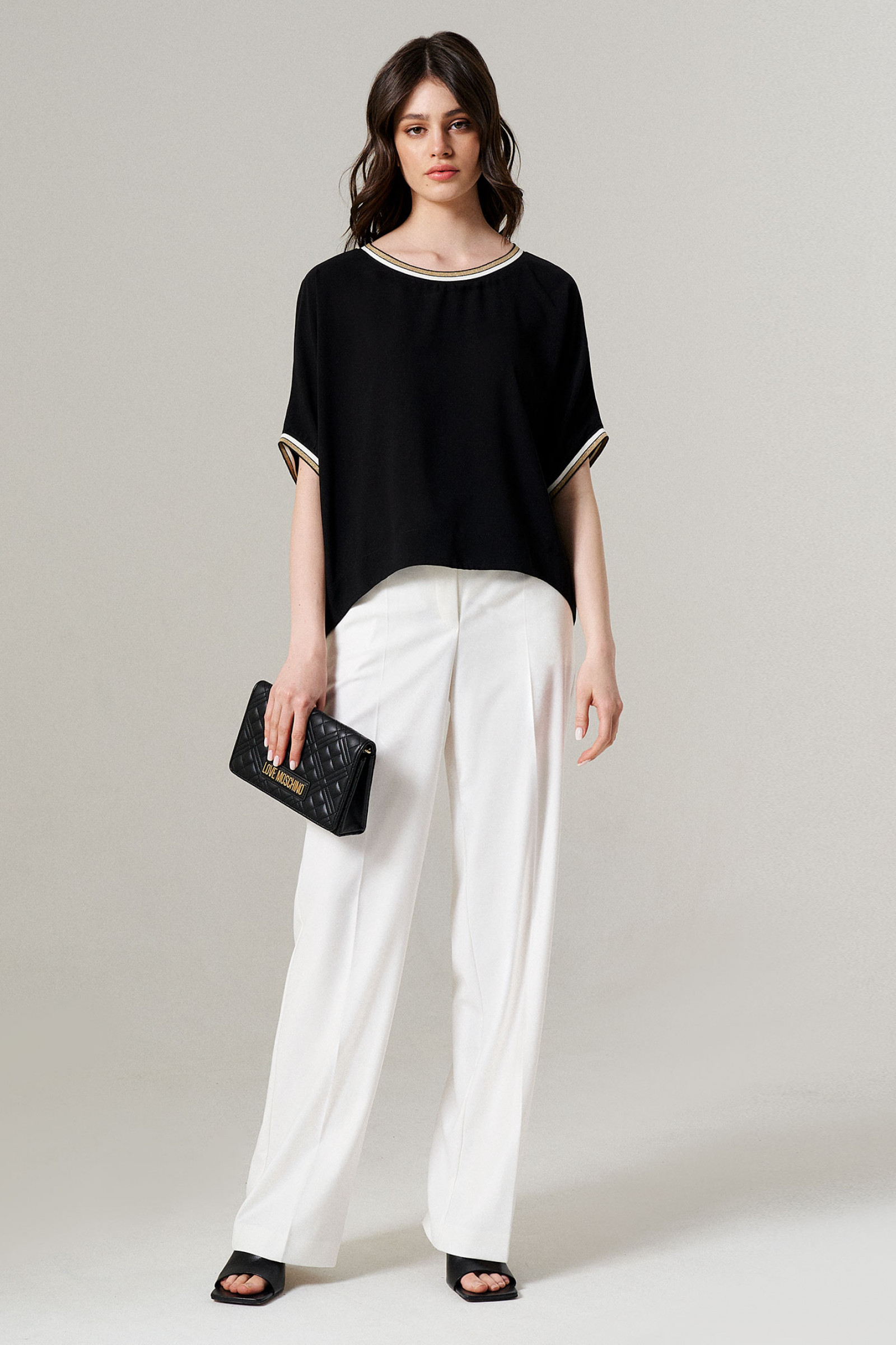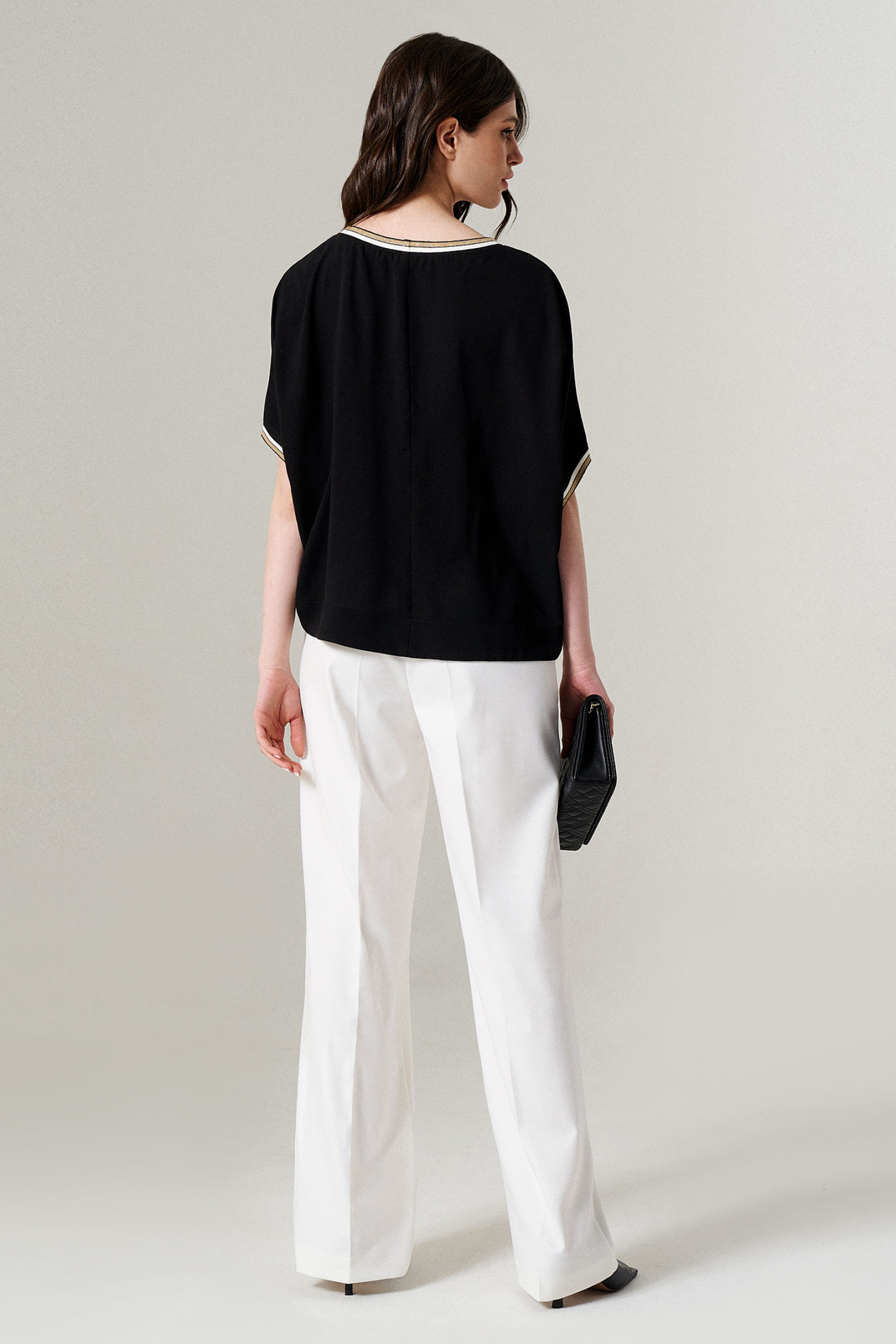 Блуза женская из легкой струящейя ткани для повседневной носки. Изделие свободного кроя с коротким цельнокроеным рукавом. Блуза классической длины со средним швом по спинке. По горловине и рукавам довязы.