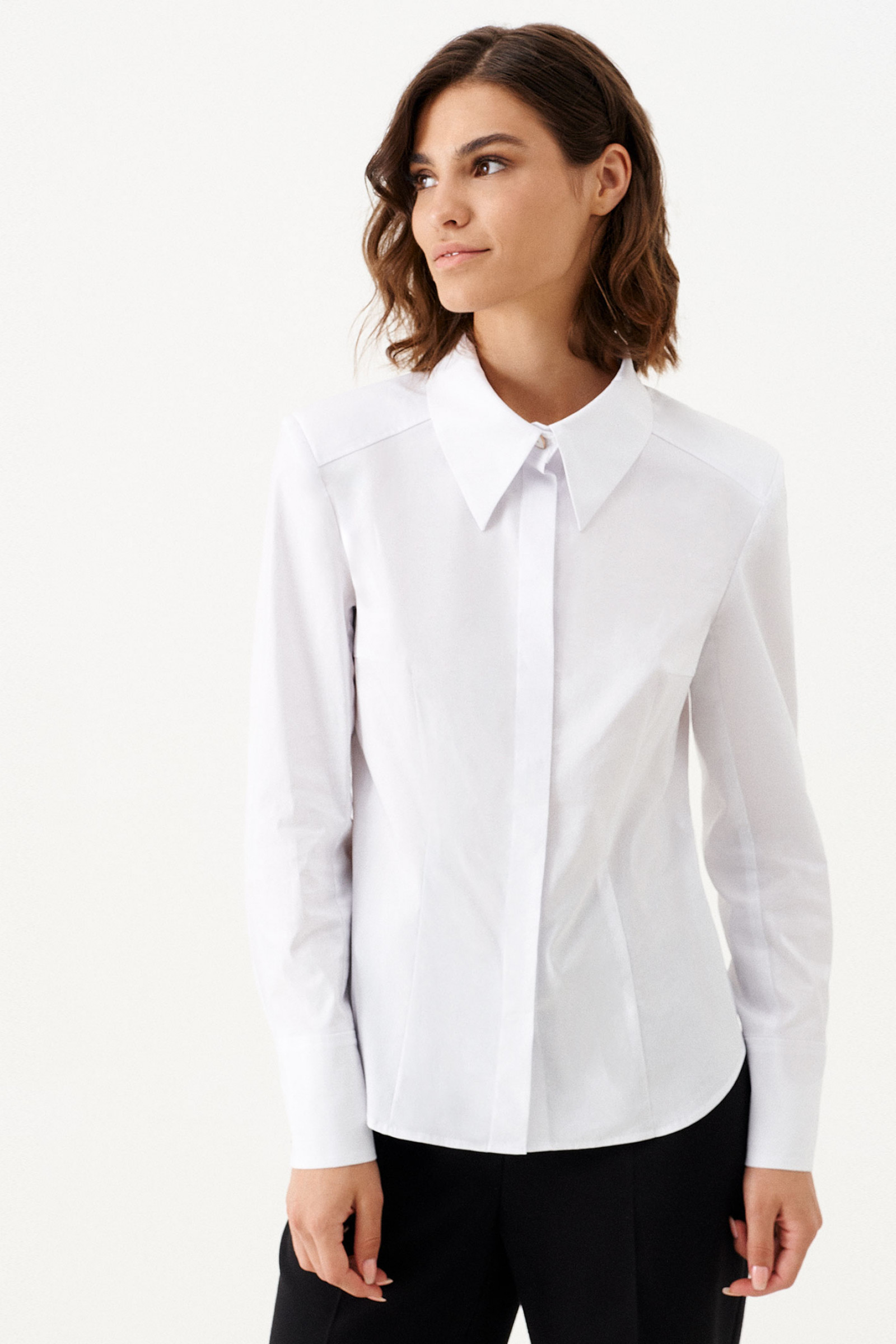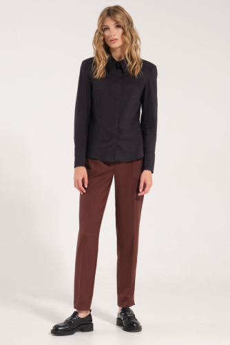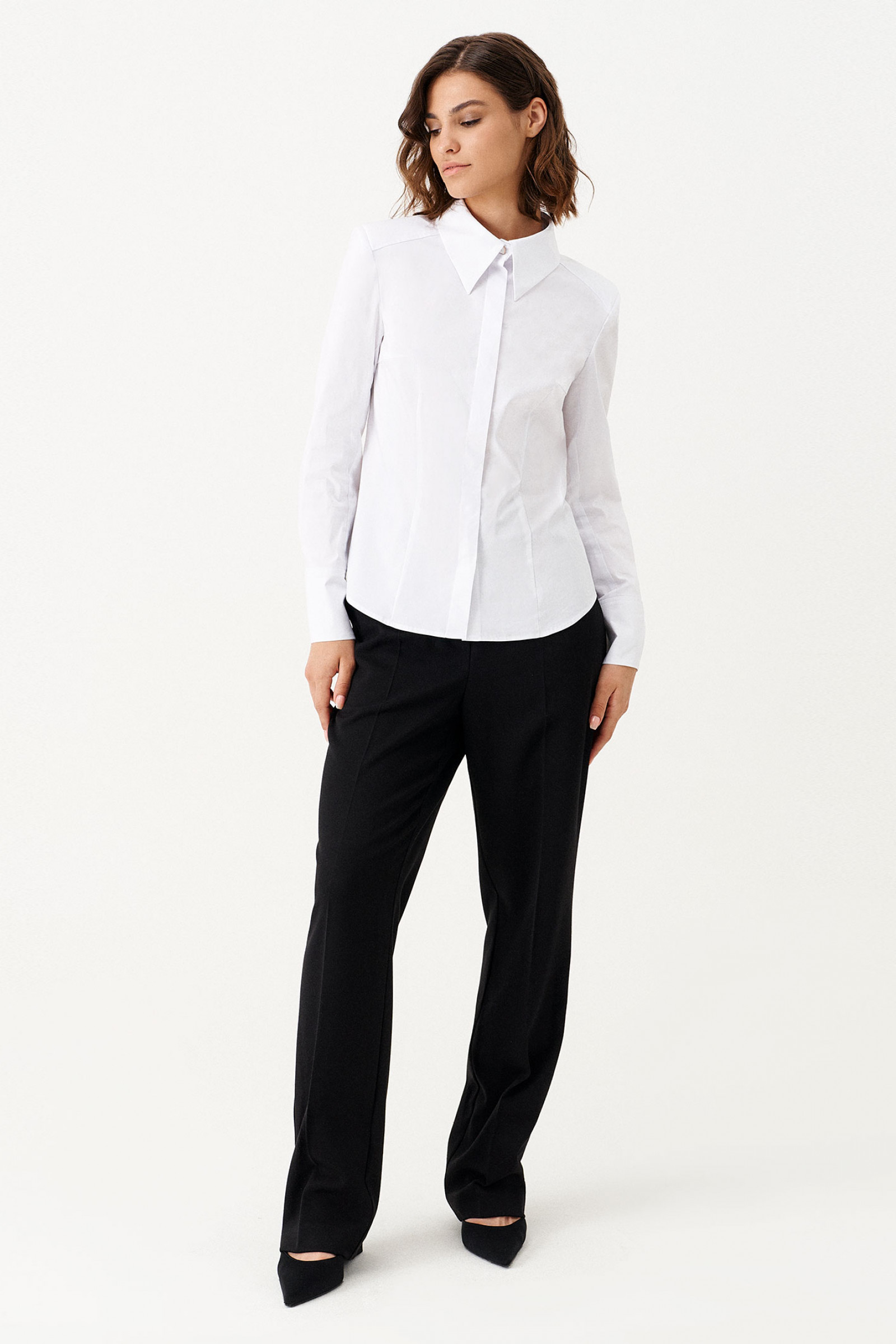 Блузка женская из смесовой ткани для повседневной носки. Блузка прямого силуэта, супатная застежка. Перед имеет нагрудные и талиевые вытачки. Спинка со средним швом и талиевыми вытачками до низа изделия, а также по спинке имеется кокетка. Плечевой шов смещен чуть на перед. Горловина обработана рубашечным воротником с отрезной стойкой. Низ рукава обработаны притачной манжетой, застежка на две обметанные петли и две пуговицы. Стильная и очень удобная блузка станет вашим фаворитом на любой выход.