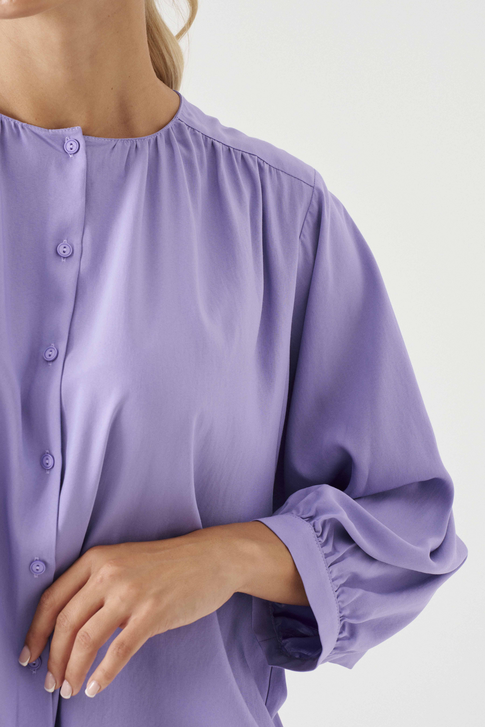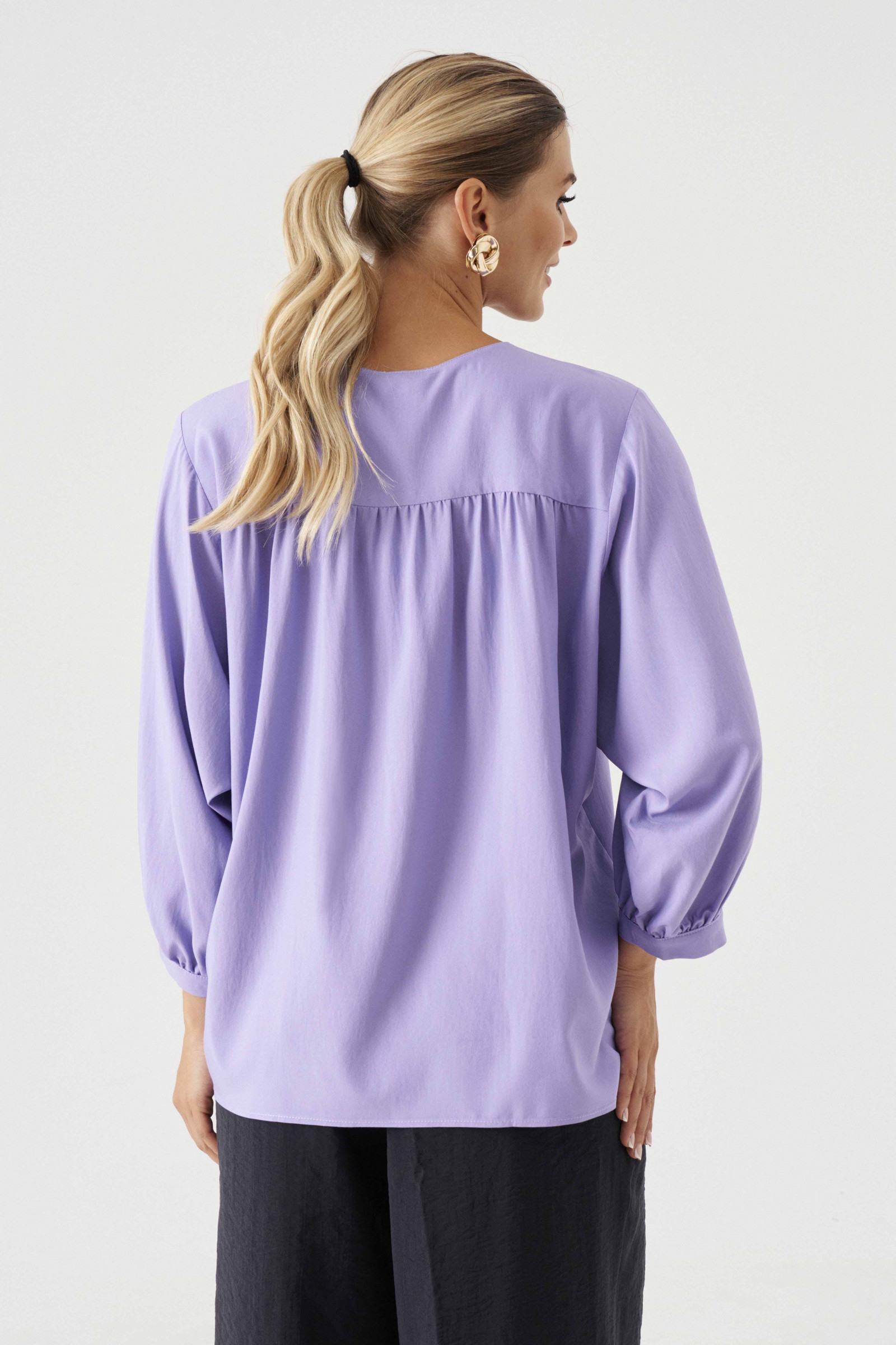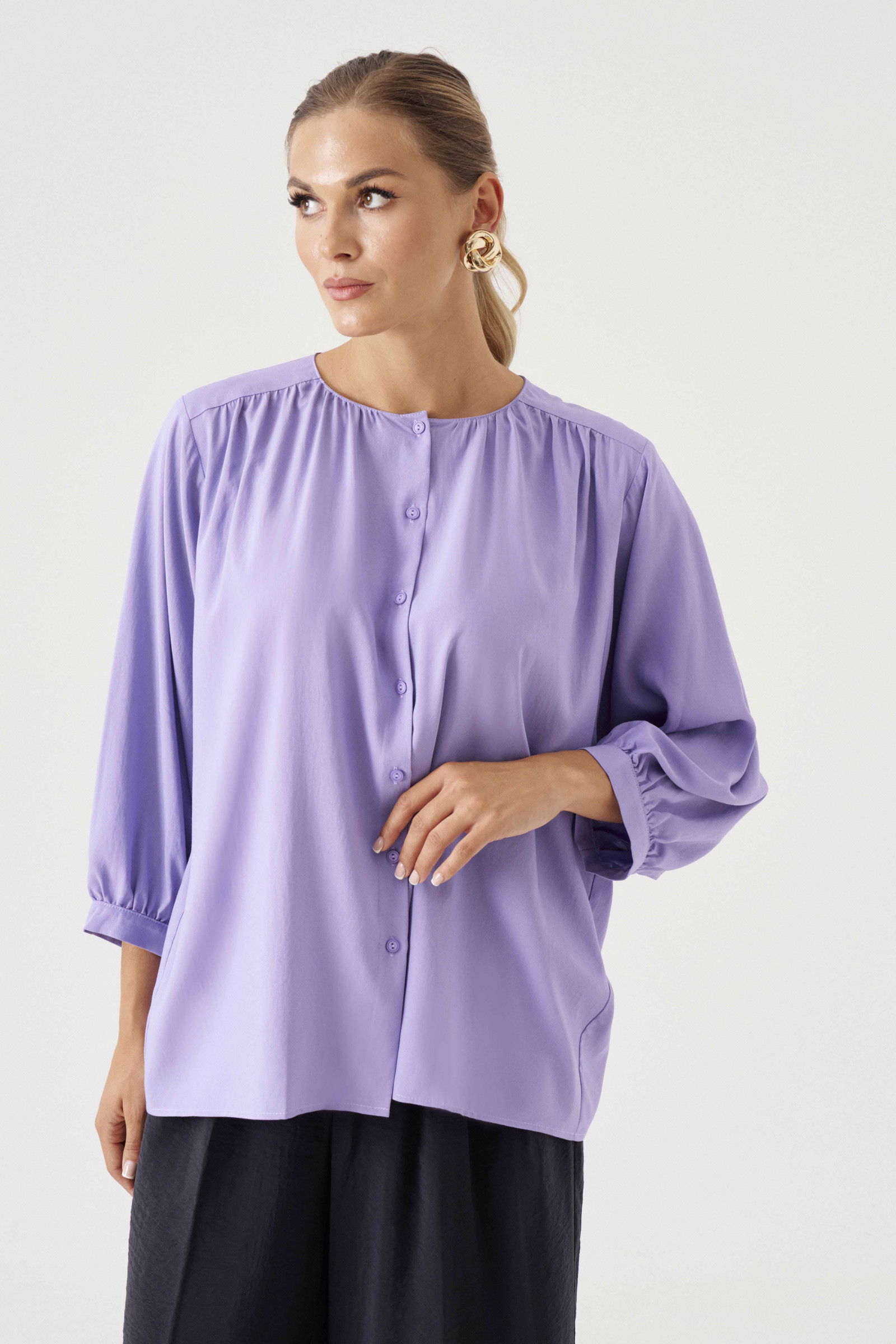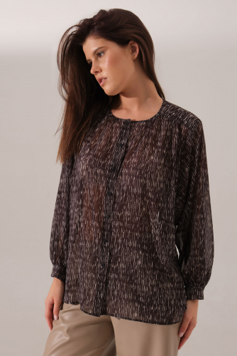 Блуза из струящейся ткани для повседневной носки. Блуза свобожного силуэта с фронтальной застежкой на пуговицы, длинным втачным рукавом. Рукав оформлен притачной манжетой. Спинка с отрезной кокеткой. Длина изделия классическая.