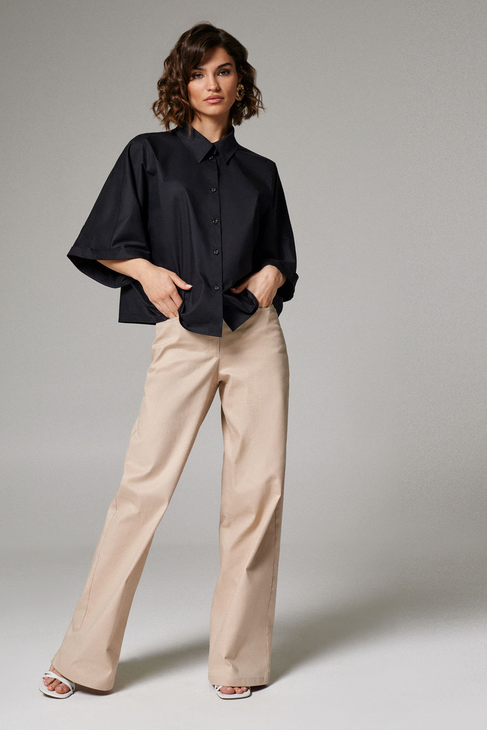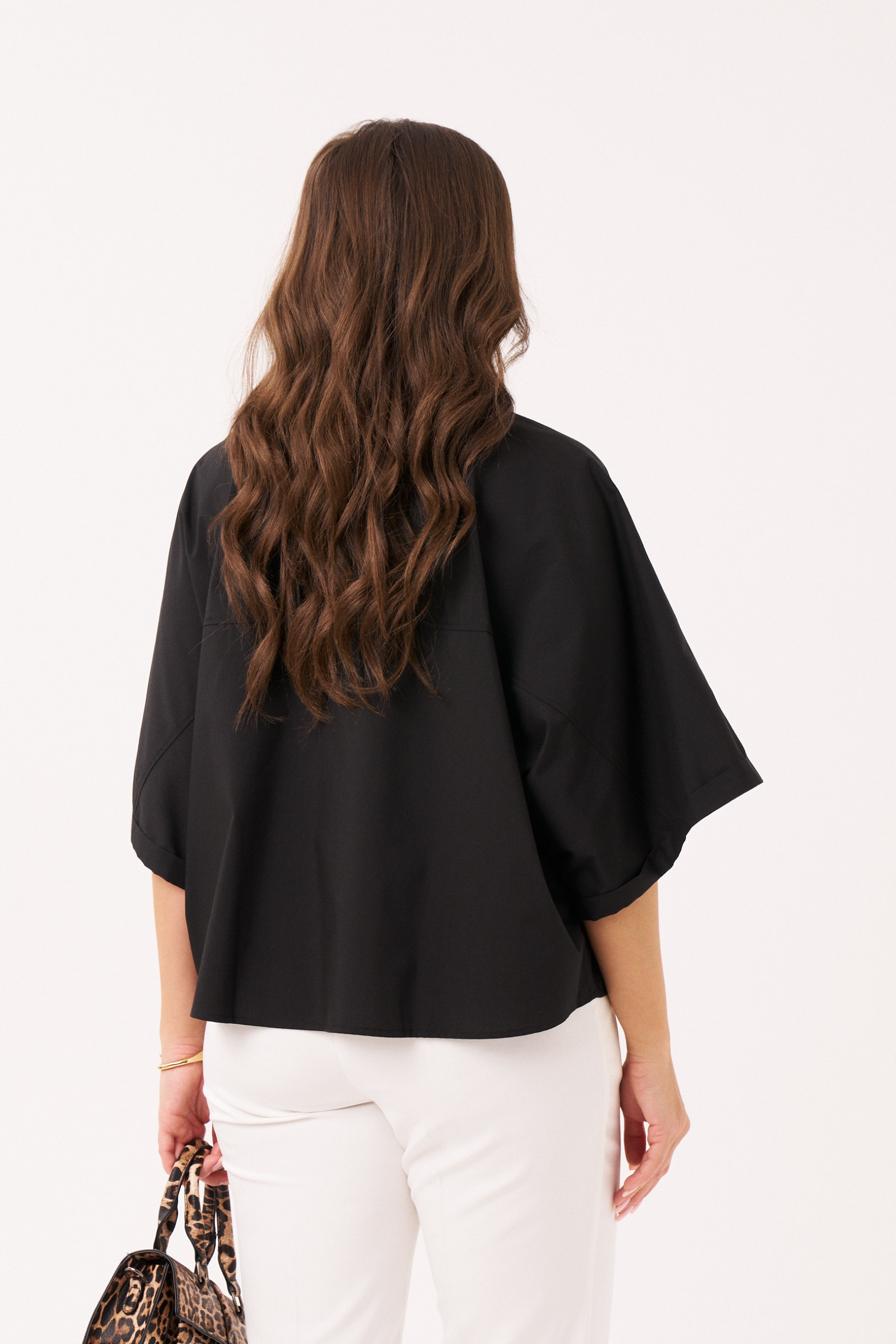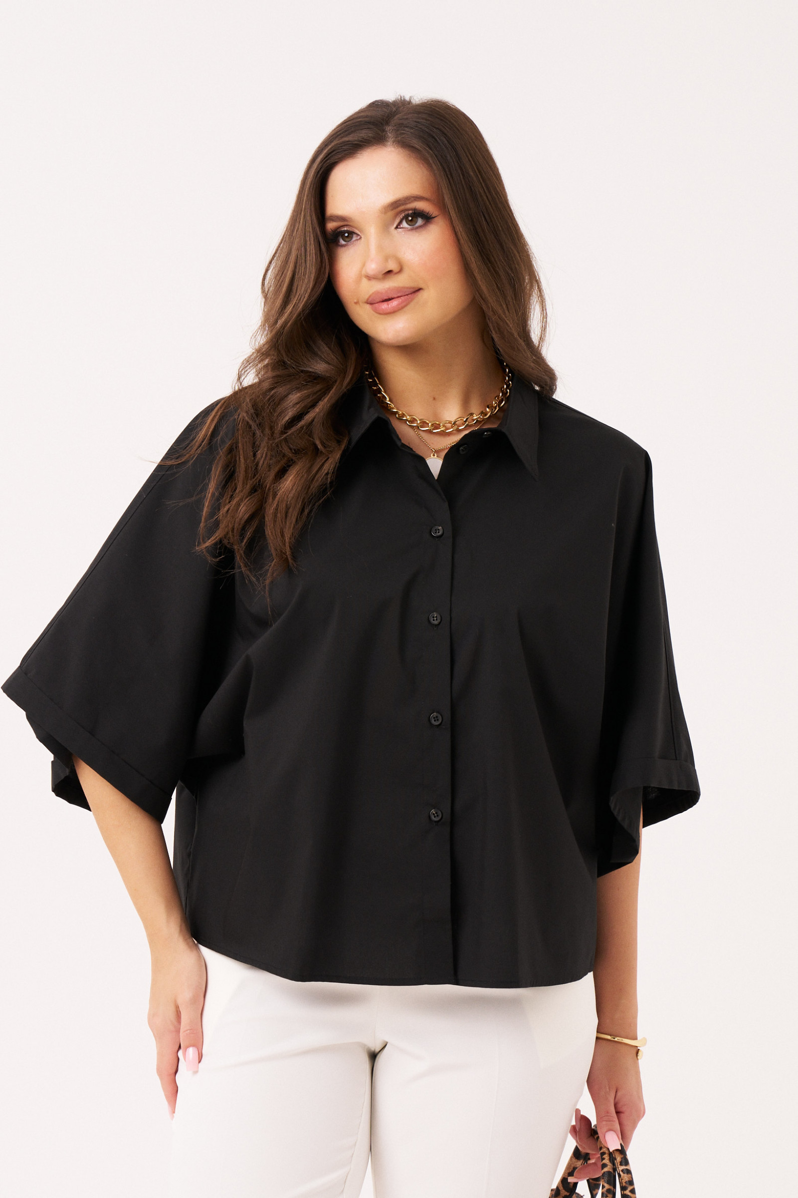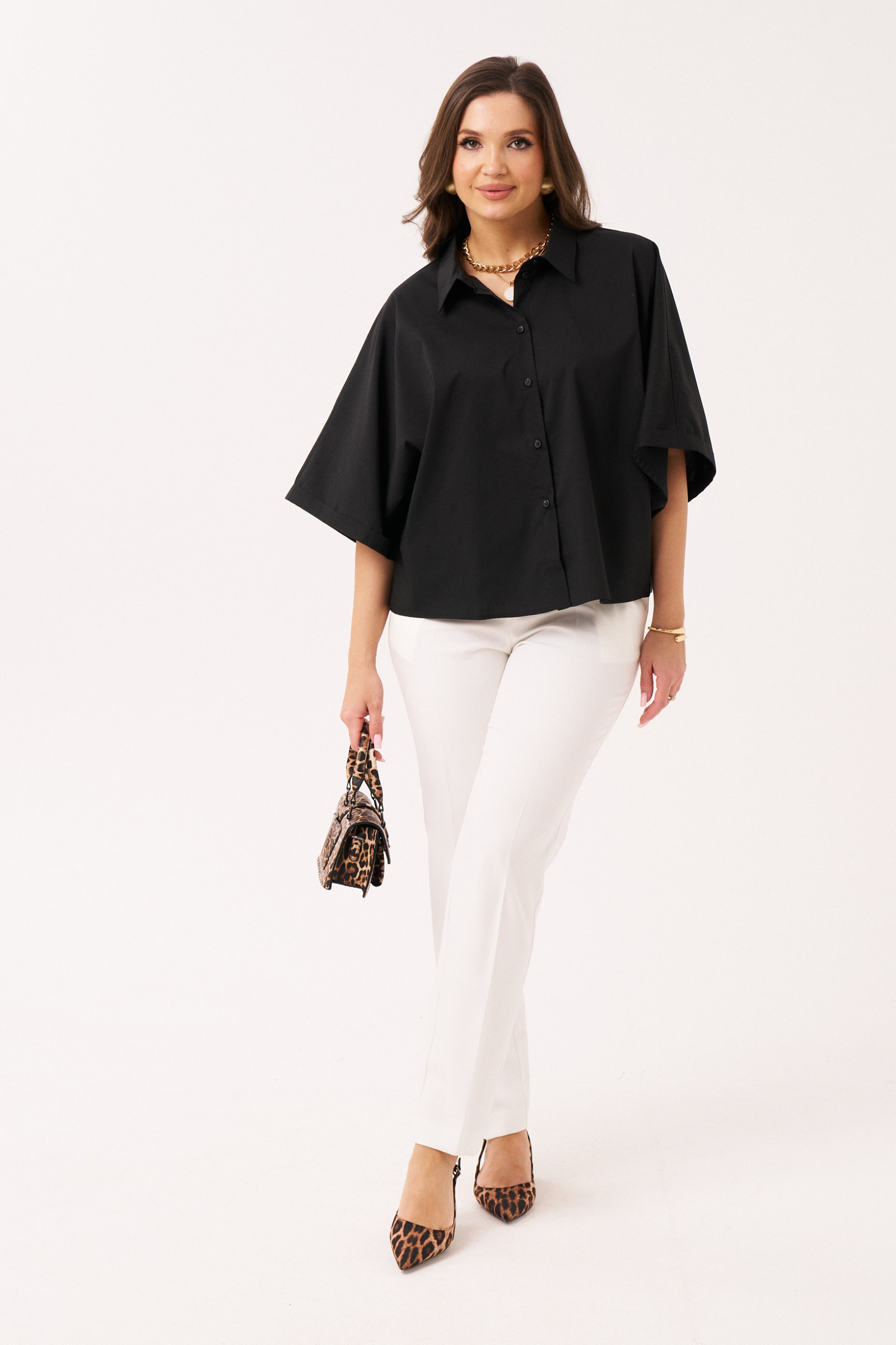 Блуза женская из хлопковой ткани для повседневной носки. Блуза свободная укороченная с фронтальной застежкой на пуговицы. Рукав цельнокроеный укороченный. По низу рукава отложная манжета. По спинке отрезная кокетка. Низ прямой.
