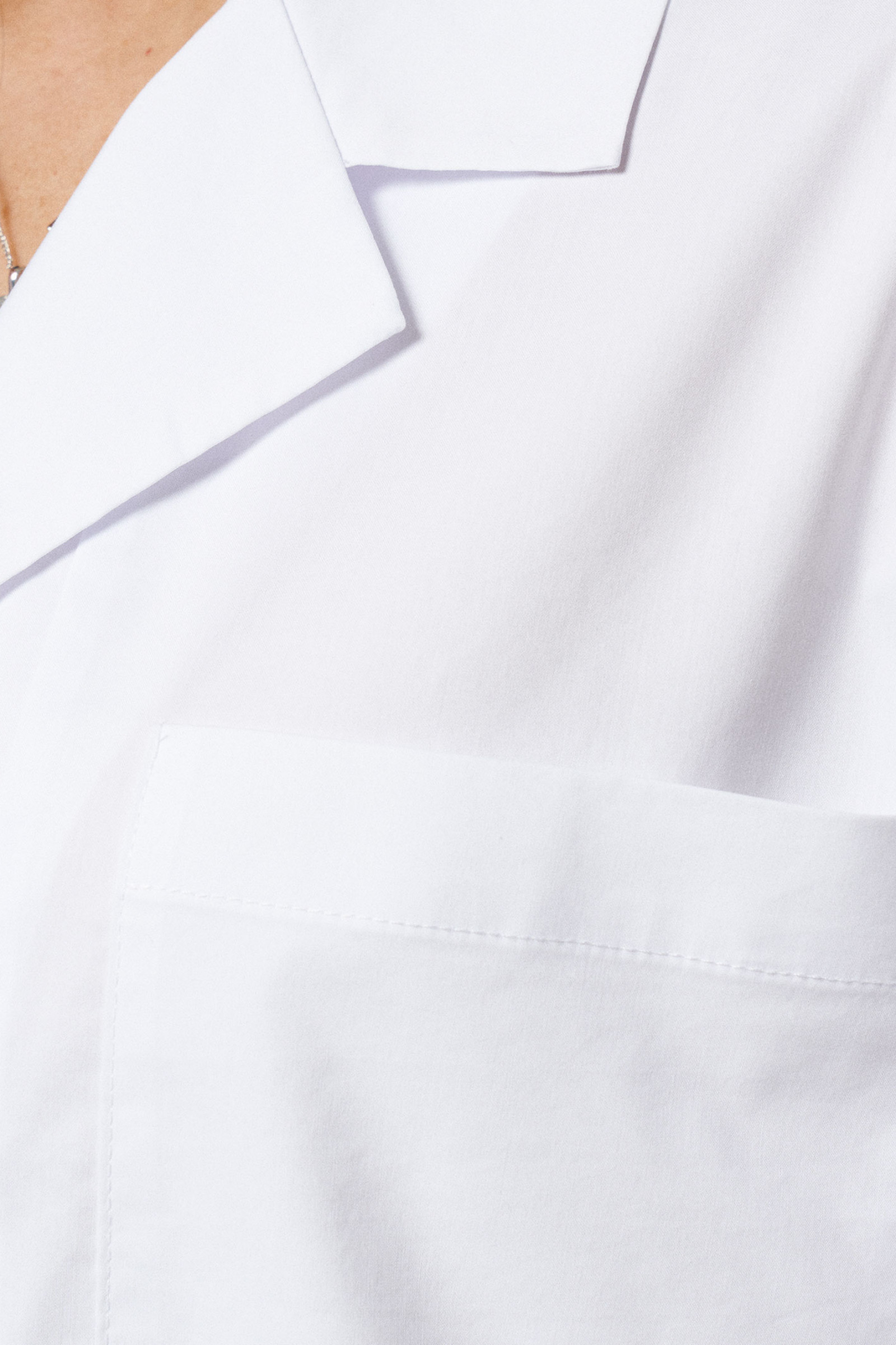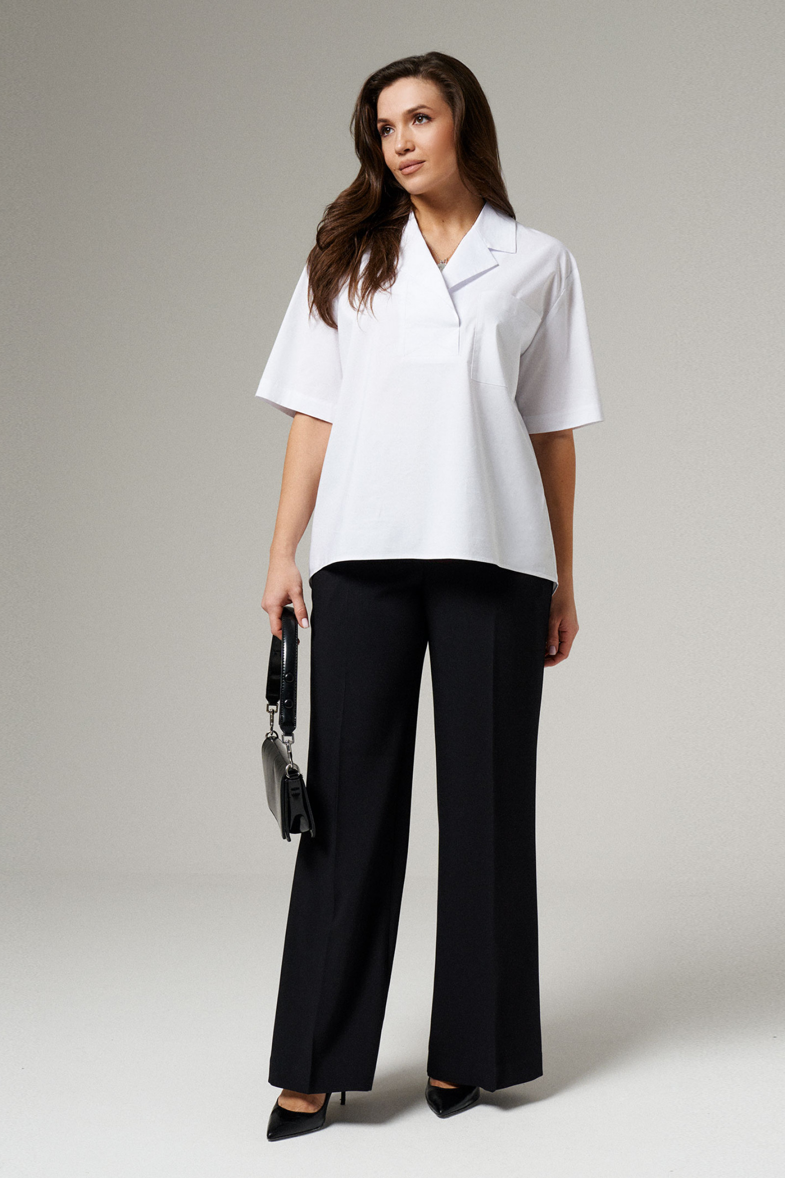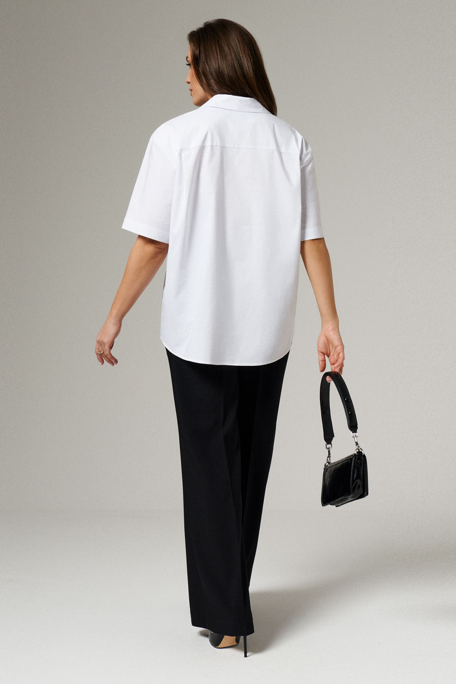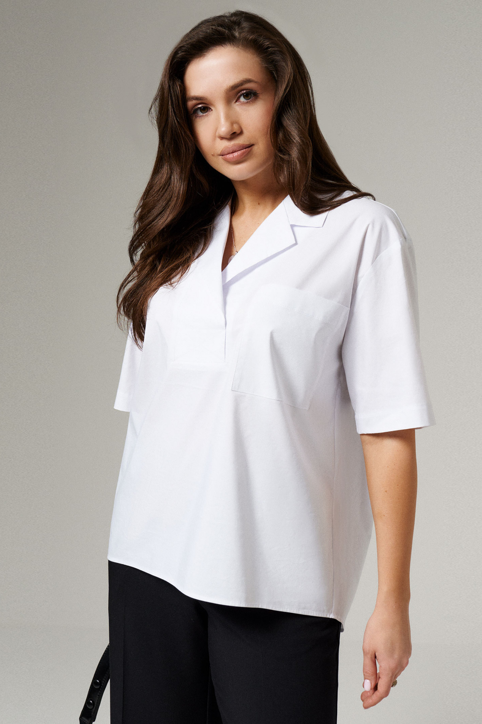 Хлопковая женская блуза для повседневной носки. Блуза, расширяющаяся к низу, длиной до середины бедра. Воротник плосколежащий, перехожящий в планку до линии груди. На передней части блузы накладной карман. На задней части блузы отрезная кокетка и два защипа. Короткий рукав. Низ фигурный, спинка немного длиннее. Отличный вариант для жарких дней.