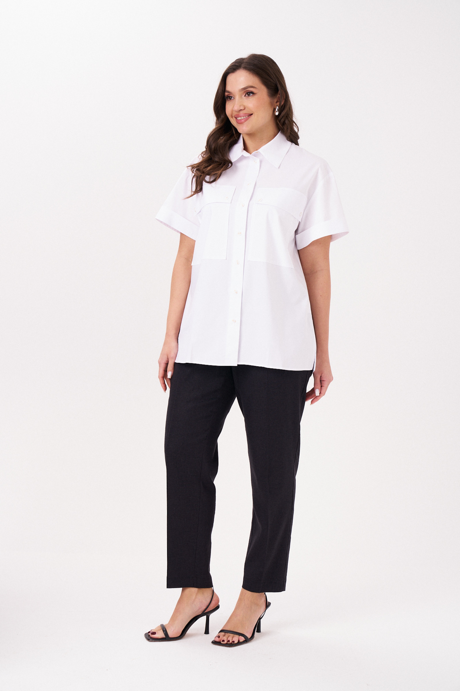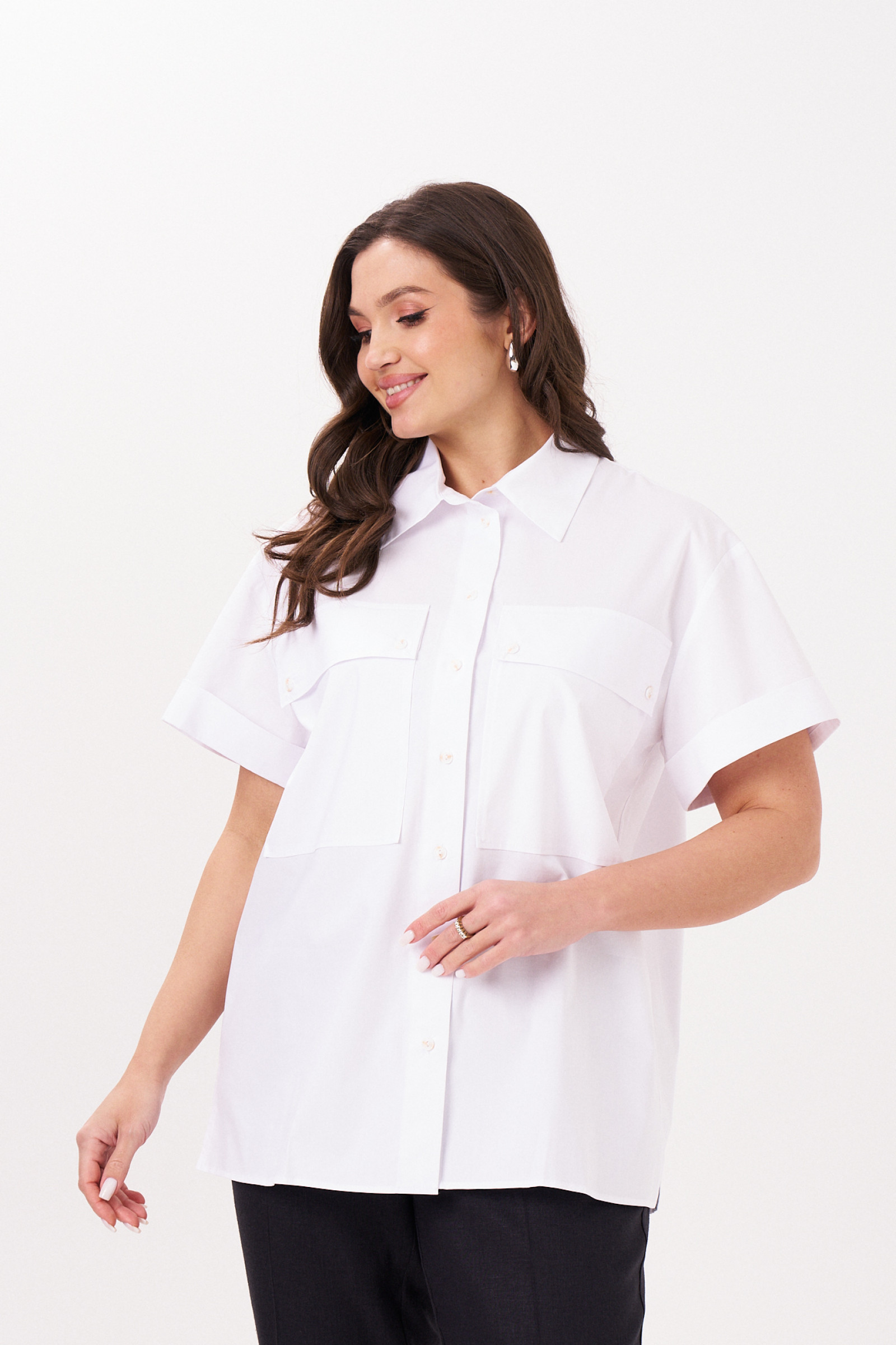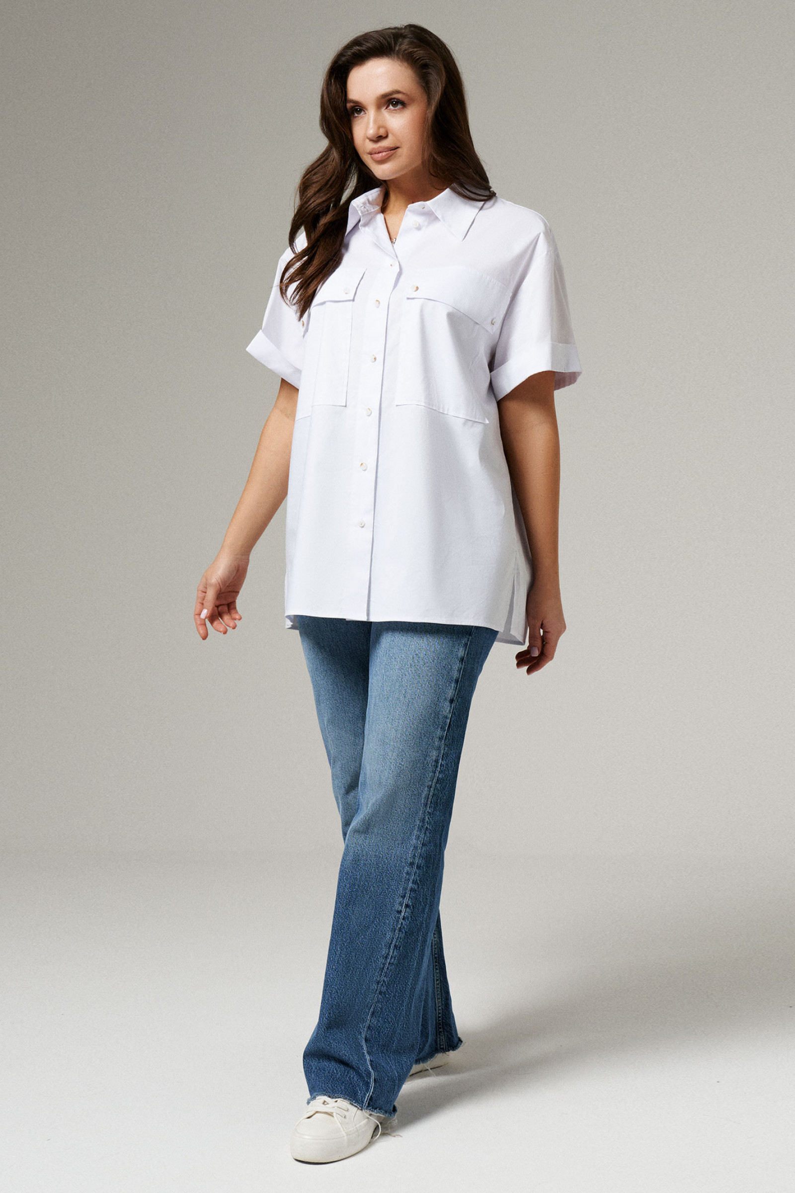 Блуза женская прямого кроя из хлопковой ткани для повседневной носки. Блуза прямого кроя с втачным укороченным расширенным рукавом. Изделие с фронтальной застежкой на пуговицы, воротником-стойкой. По переду накладные карманы с клапанами. По спинке отрезная кокетка и две складки. В боковых швах разрезы от низа изделия.